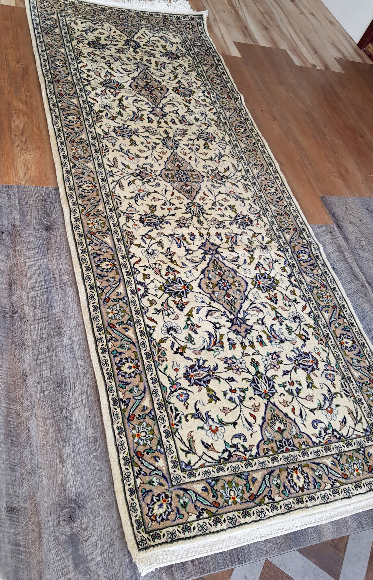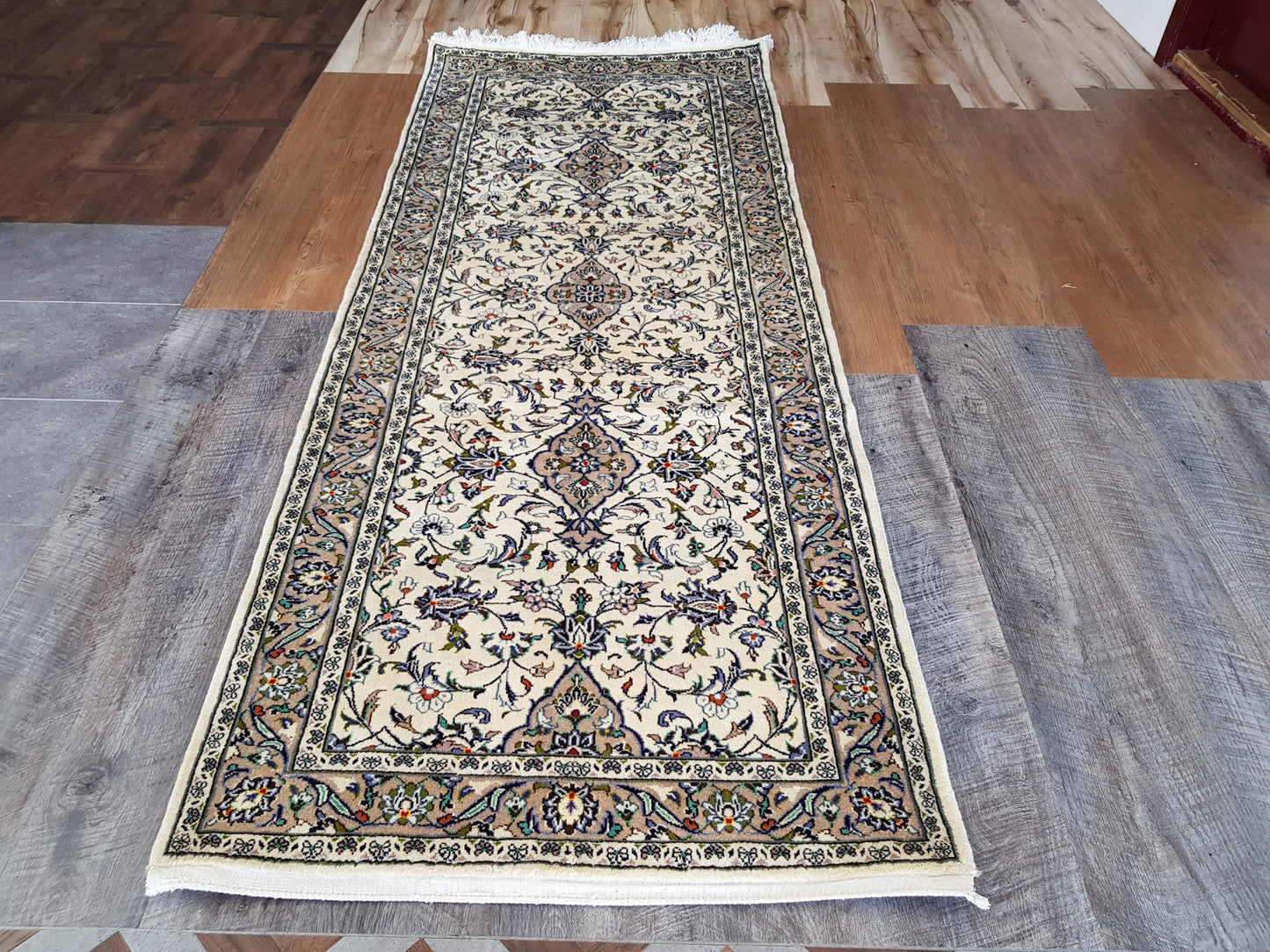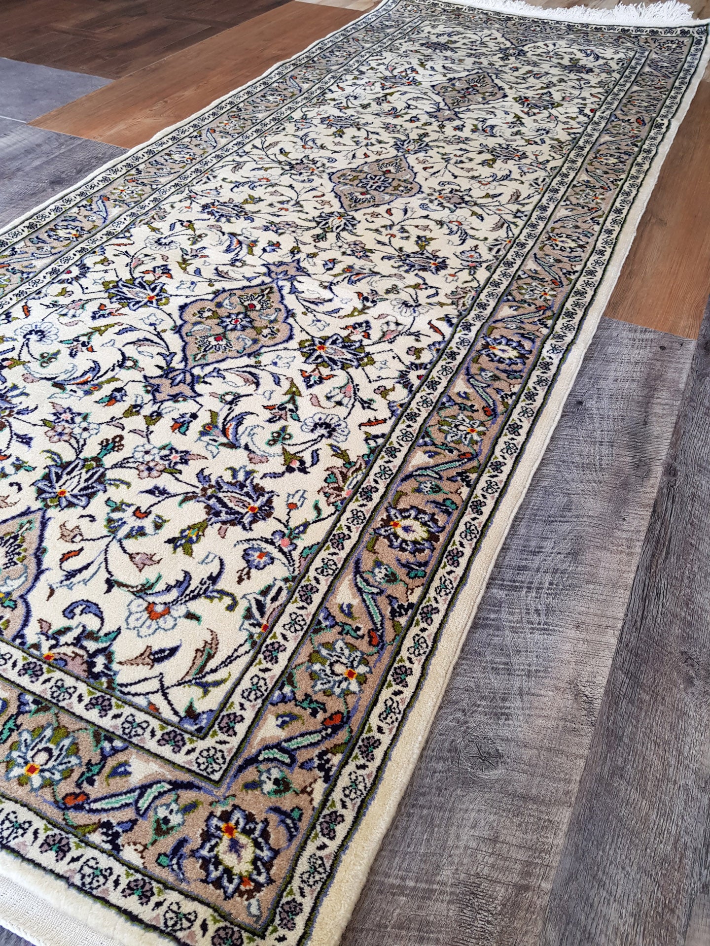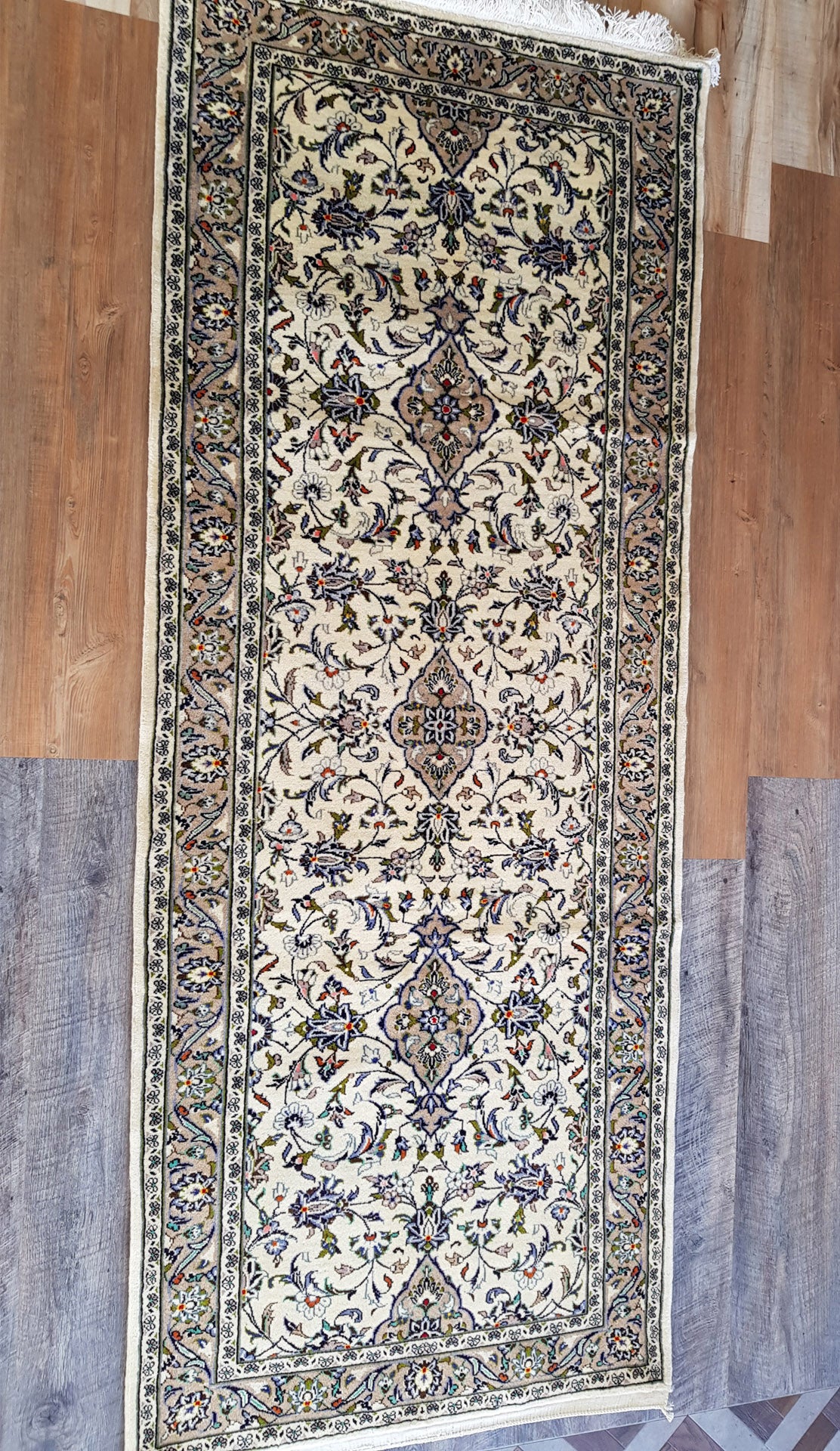 Hand-knotted in Kashan, one of Persia’s most esteemed weaving centres, this runner embodies the grace and symmetry that define classical Persian design. A series of nested, lobed medallions sits at its heart, surrounded by palmettes, rosettes, and scrolling vines that flow across the ivory field in a balanced, floral arrangement.