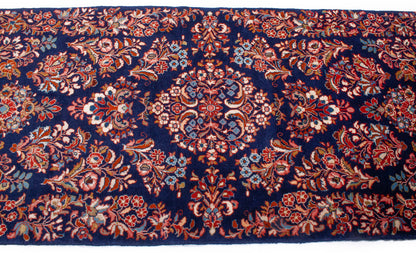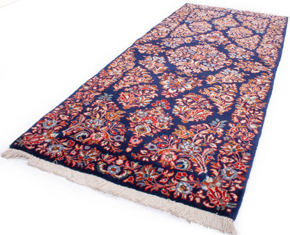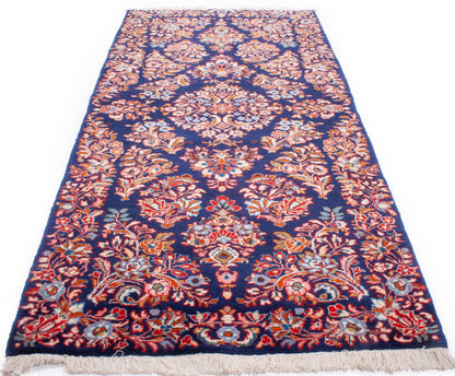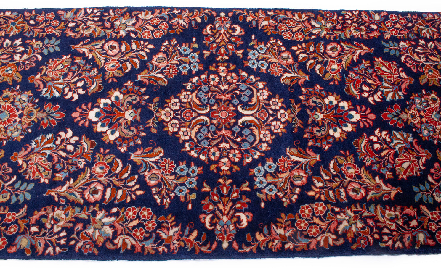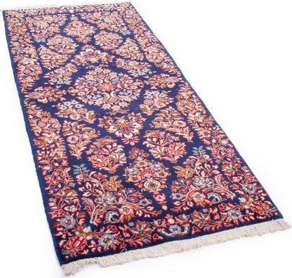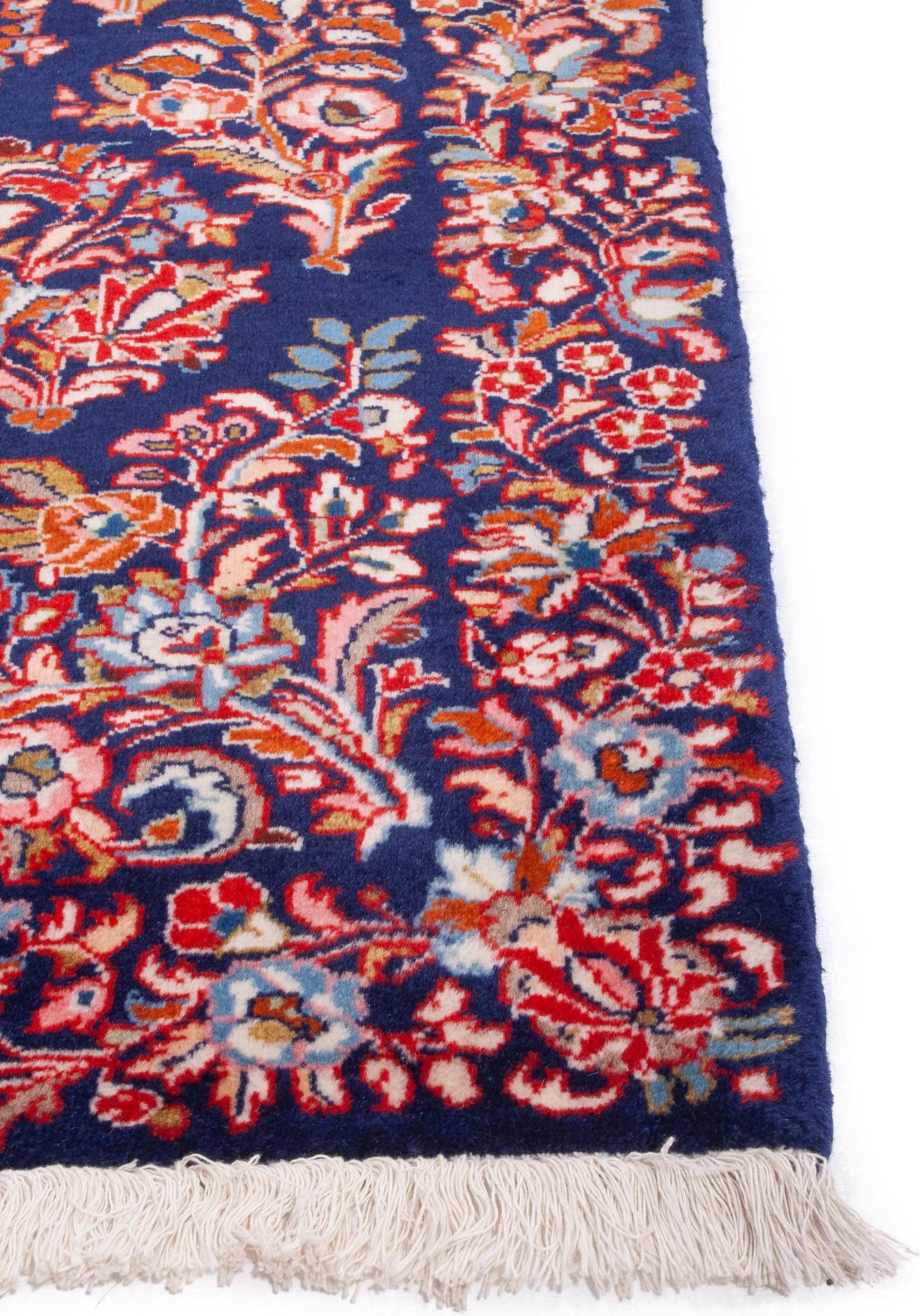 Hand-knotted in the historic city of Kashan, this Persian runner exemplifies the refinement of classical design. A central medallion anchors the indigo field, surrounded by flowing arrangements of palmettes, rosettes, and stylised floral vines, all rendered in coral, ivory, and soft blue tones.