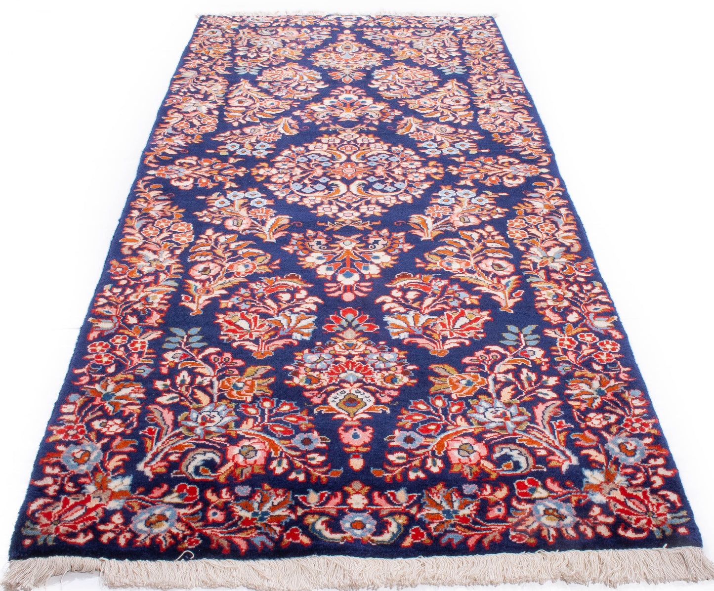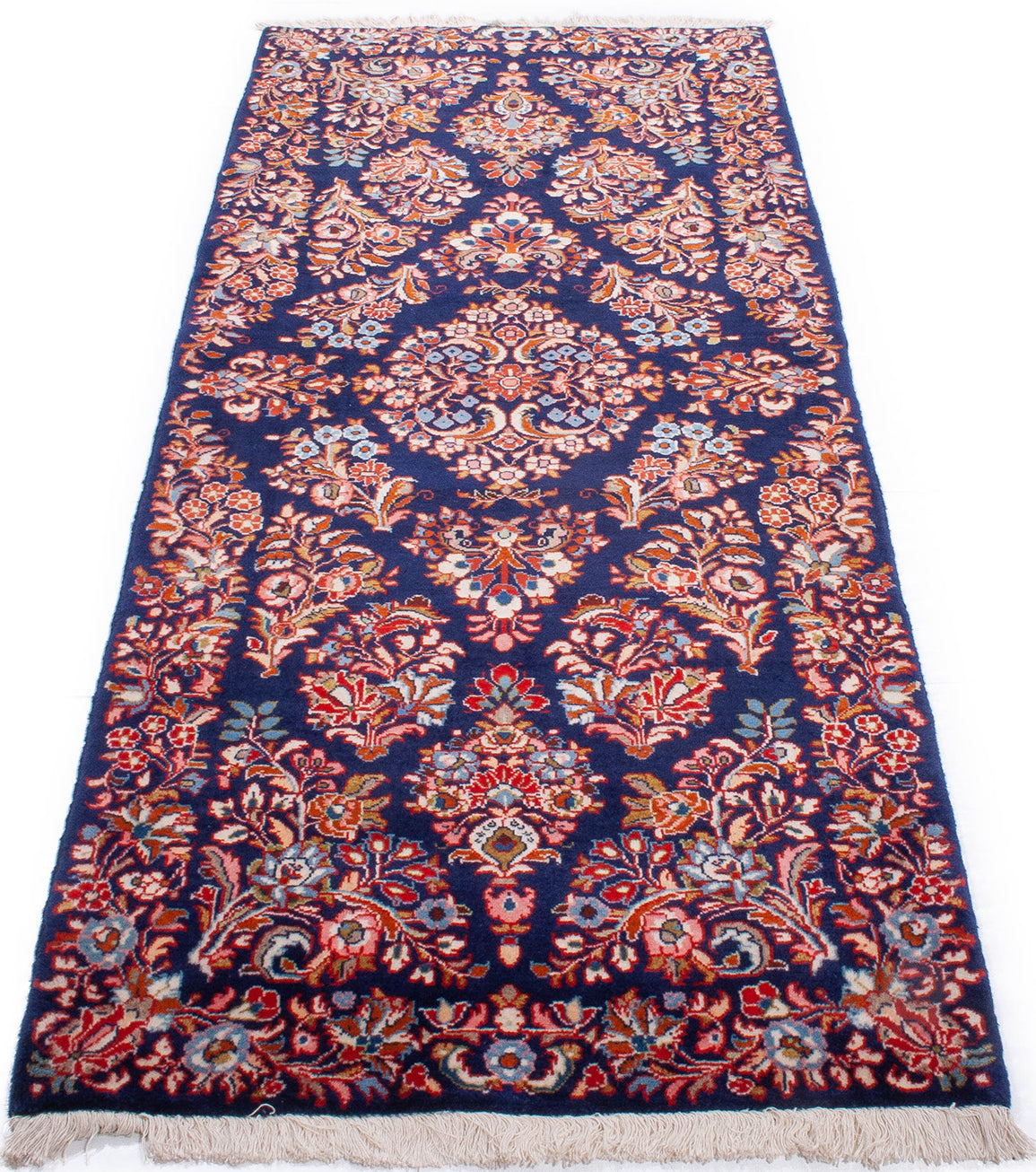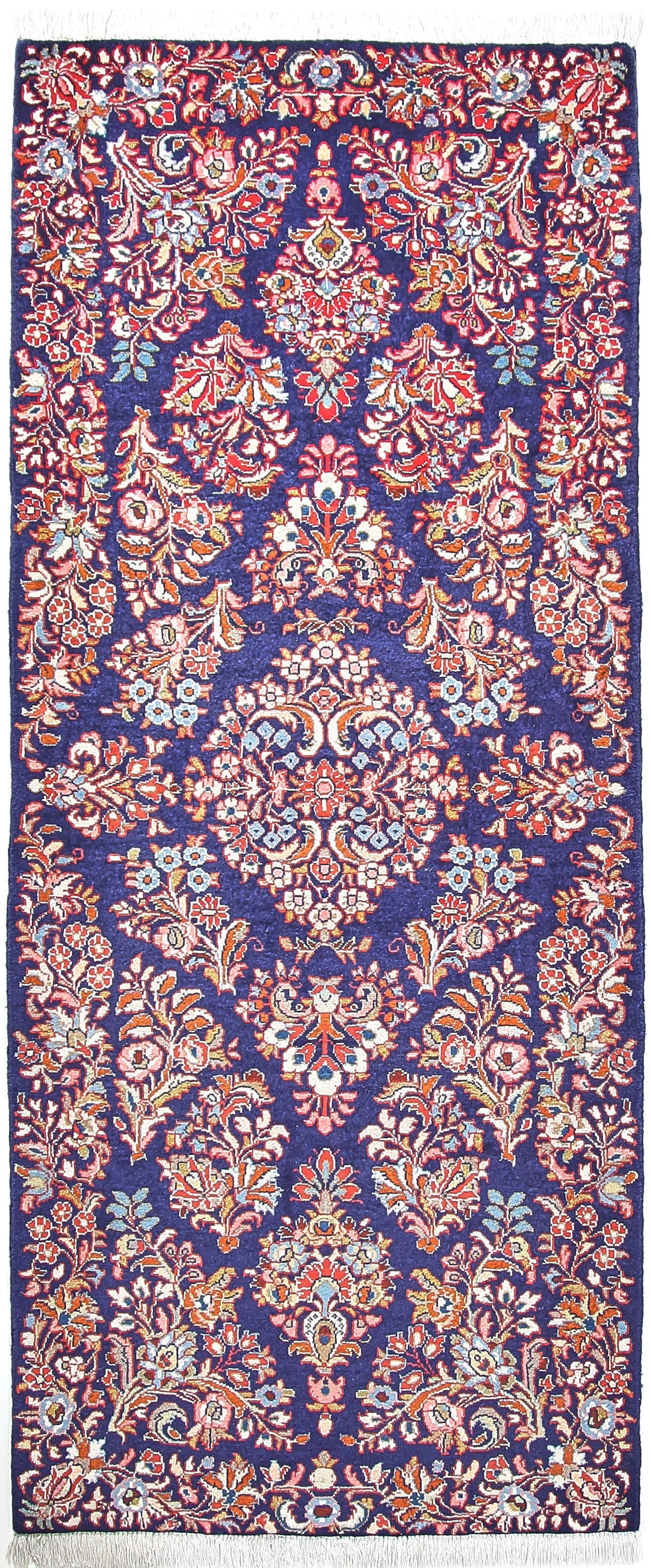 Hand-knotted in the historic city of Kashan, this Persian runner exemplifies the refinement of classical design. A central medallion anchors the indigo field, surrounded by flowing arrangements of palmettes, rosettes, and stylised floral vines, all rendered in coral, ivory, and soft blue tones.