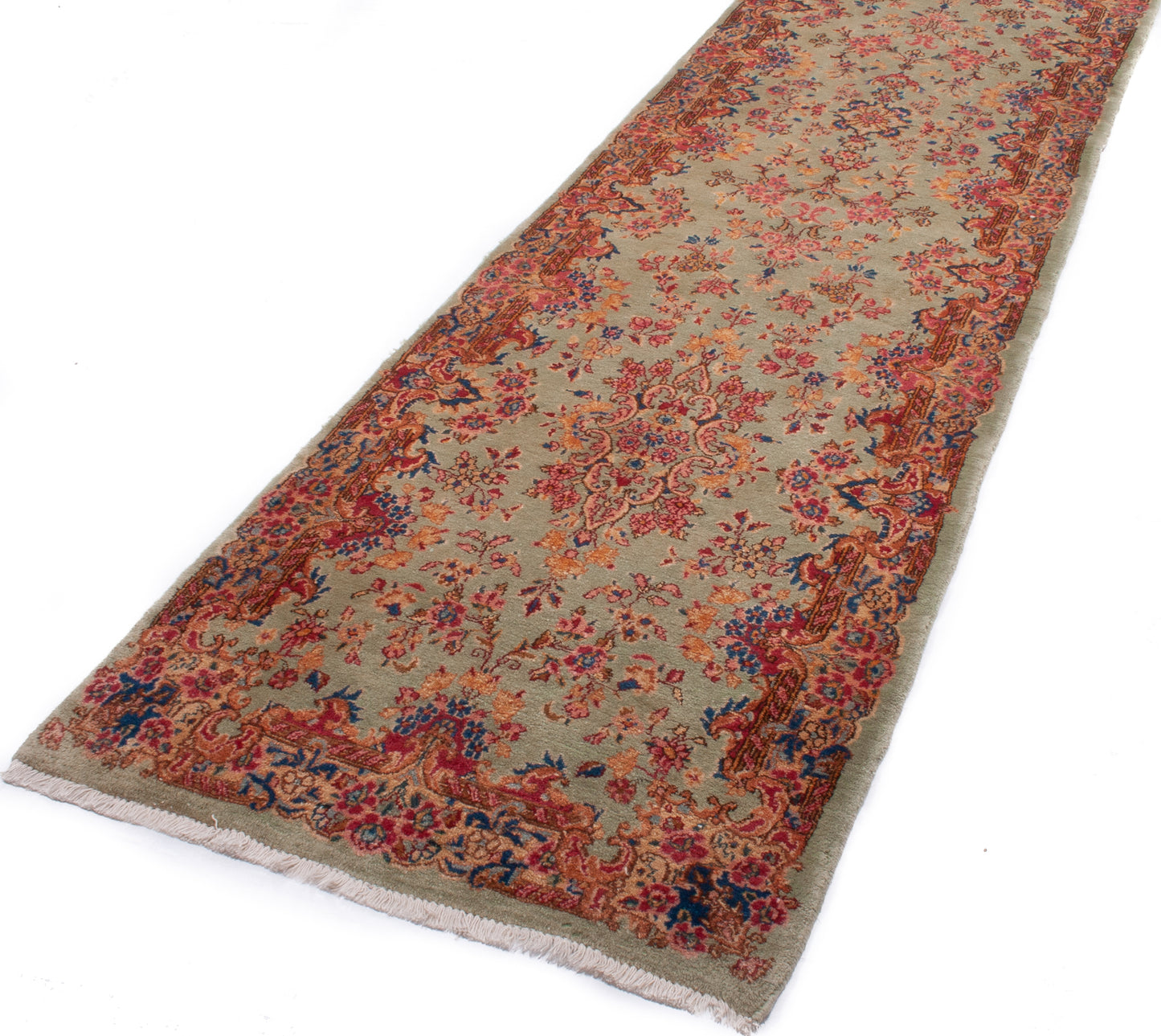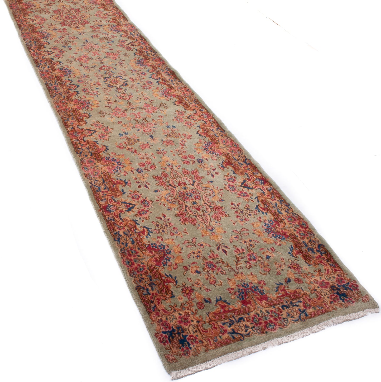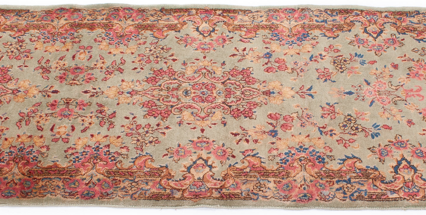Hand-knotted in Kerman, Iran, this Persian hall runner reflects the region’s mastery of balance and refinement. Its symmetrical, floral layout flows along a soft sage green field, enriched with palmettes, rosettes, and scrolling vines in tones of coral, salmon-pink, and walnut brown.