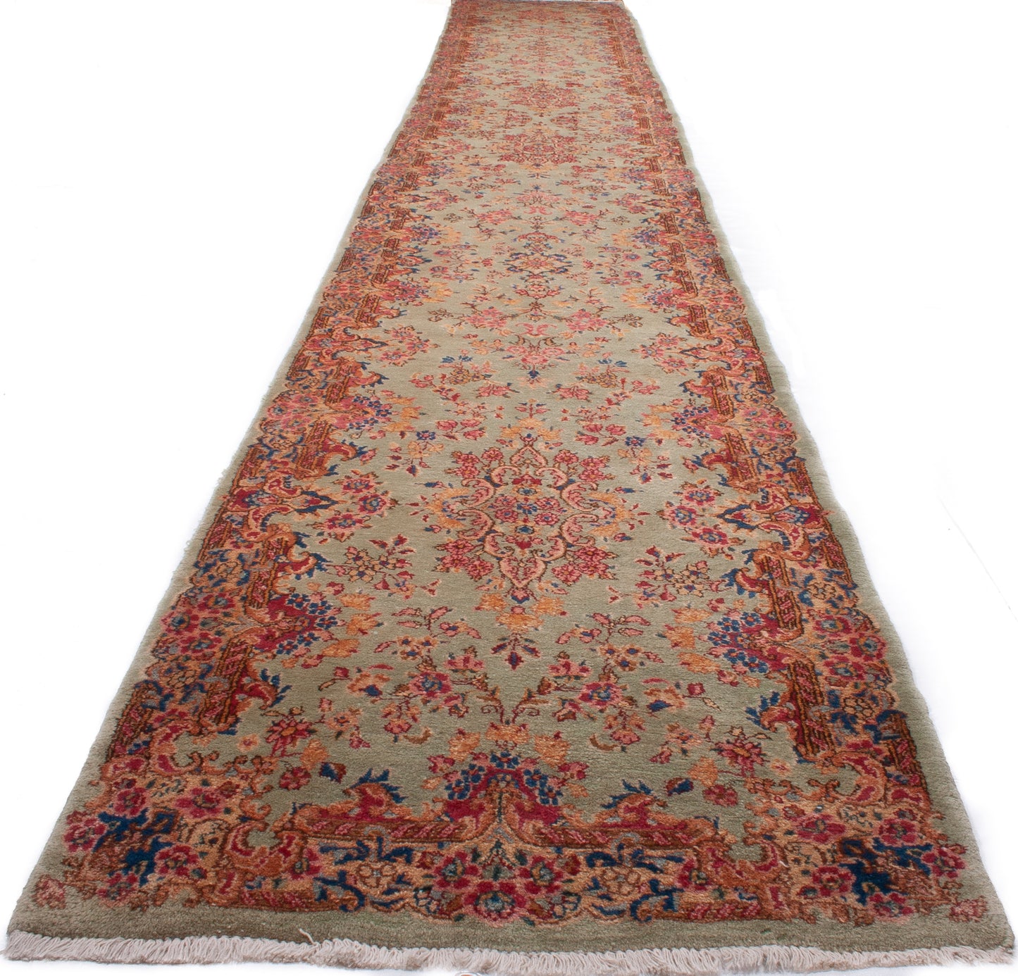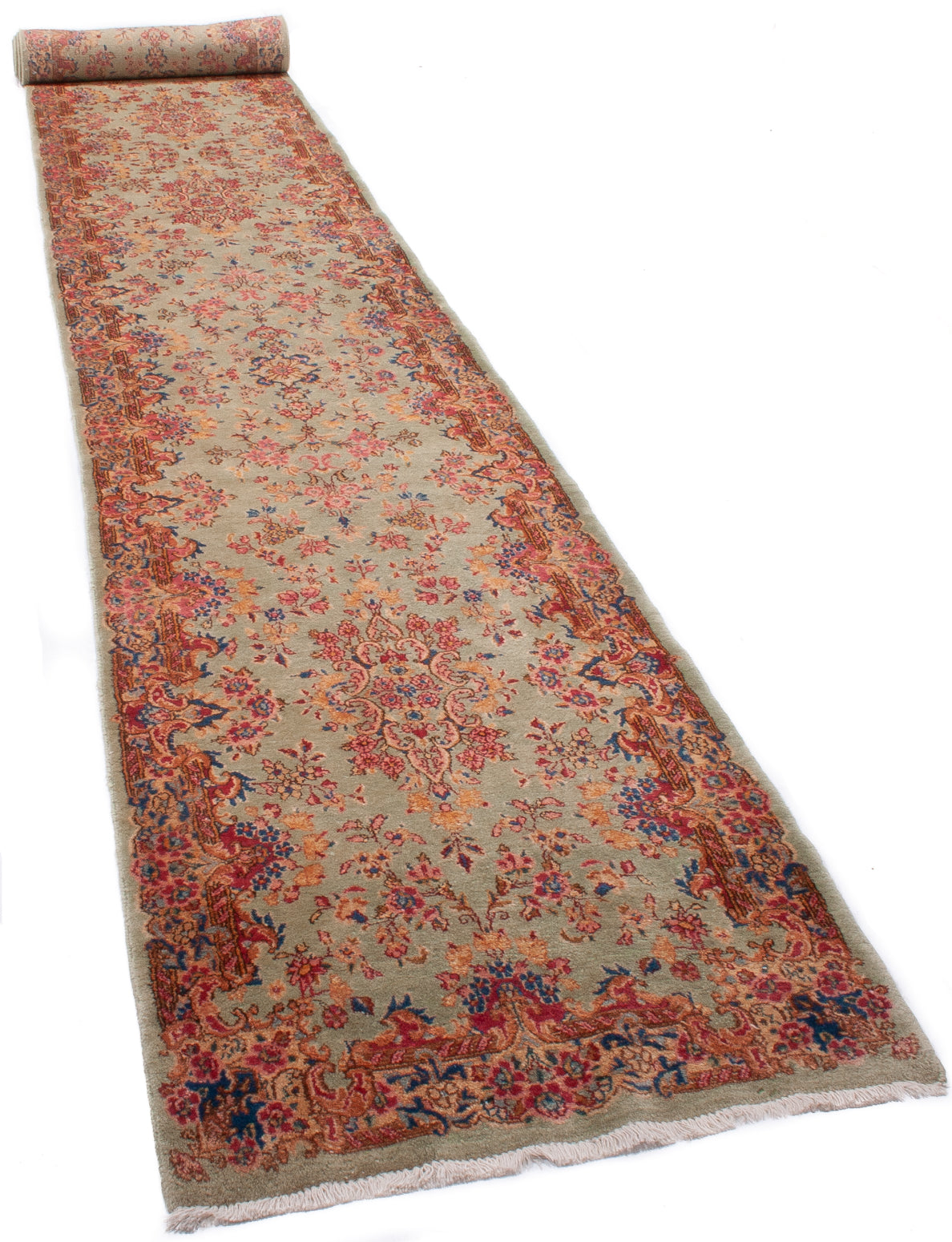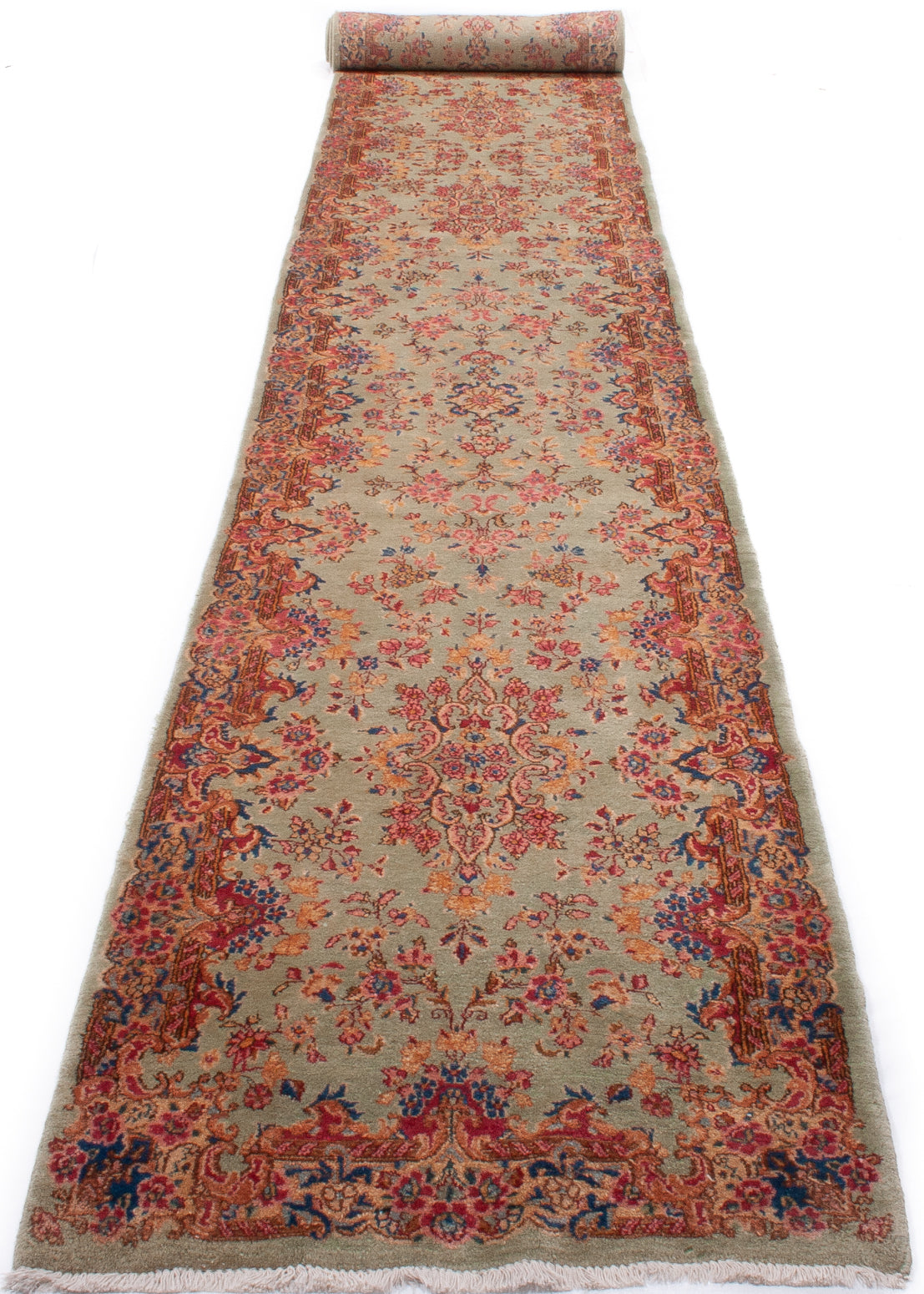 Hand-knotted in Kerman, Iran, this Persian hall runner reflects the region’s mastery of balance and refinement. Its symmetrical, floral layout flows along a soft sage green field, enriched with palmettes, rosettes, and scrolling vines in tones of coral, salmon-pink, and walnut brown.