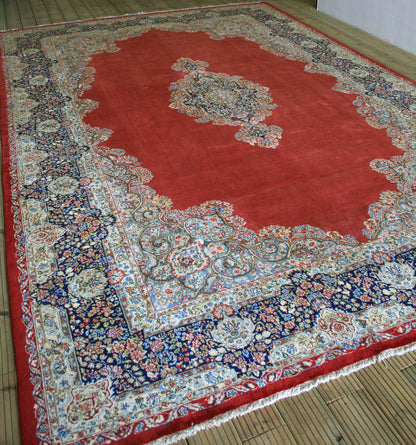 Hand-knotted in Kerman, Iran, this Persian rug exemplifies the city's renowned artistry and refinement. At its heart lies a floral medallion—geometric in structure, yet rich with palmettes, rosettes, and scrolling vines—set against a deep crimson field that amplifies its presence. The navy border, adorned with flowing palmettes and vine motifs, creates a bold yet harmonious frame, softened by ivory, peach, and light blue accents.