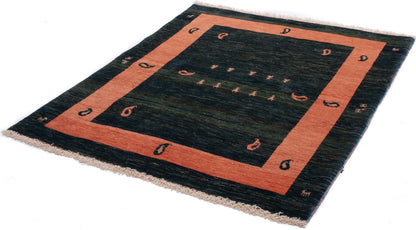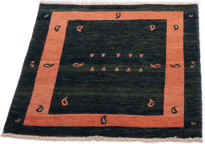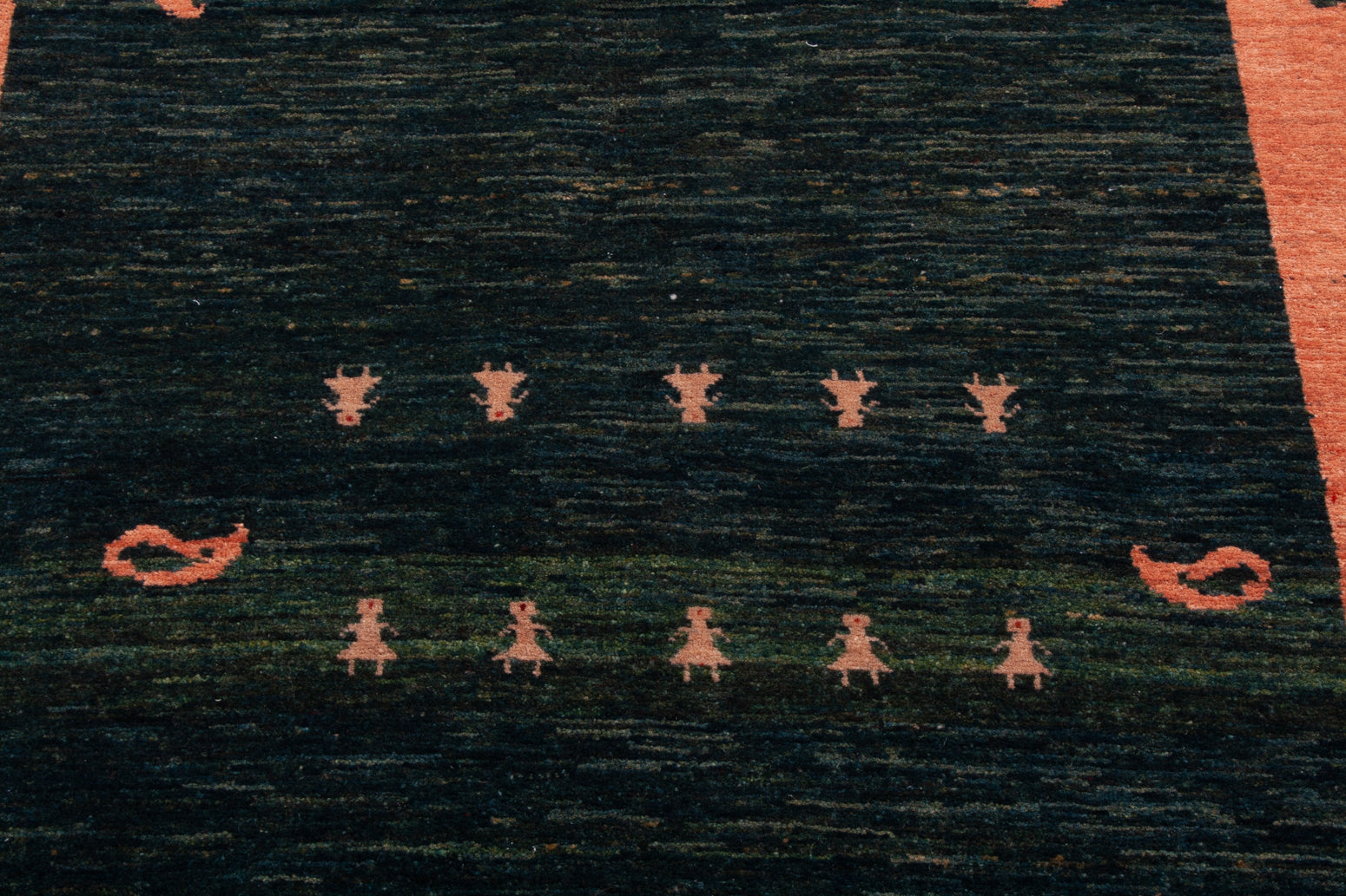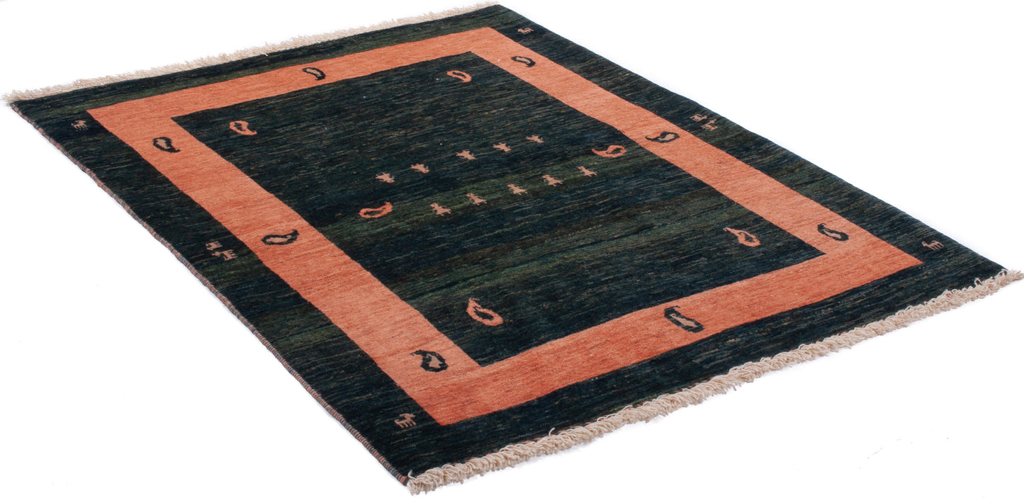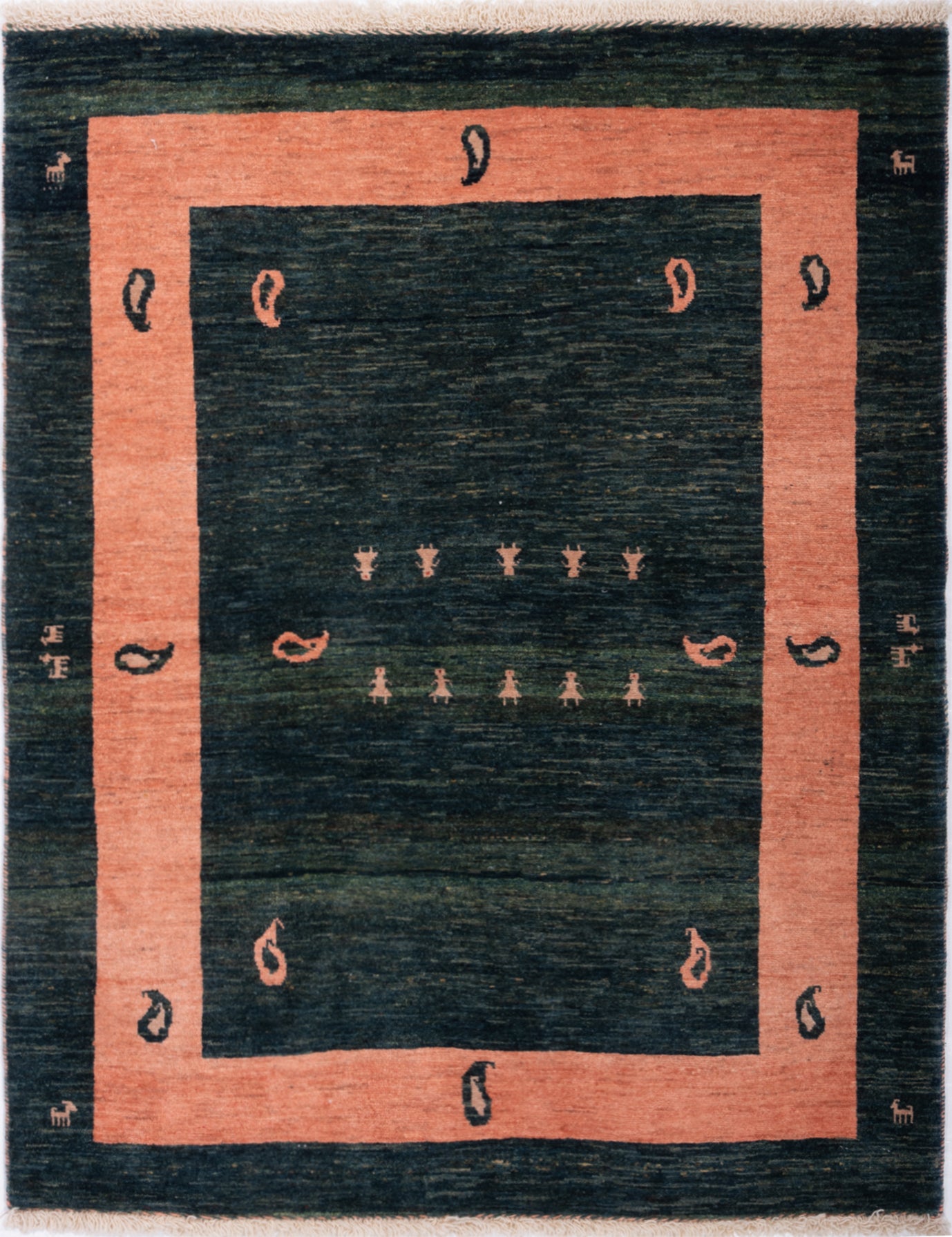 Hand-knotted in the tribal regions of Lori Baft, this Persian rug embodies the raw elegance of minimalist design. Its open field of deep teal is boldly framed by a terracotta border, decorated with simplified boteh motifs and stylised animal figures that echo generations of tribal storytelling.