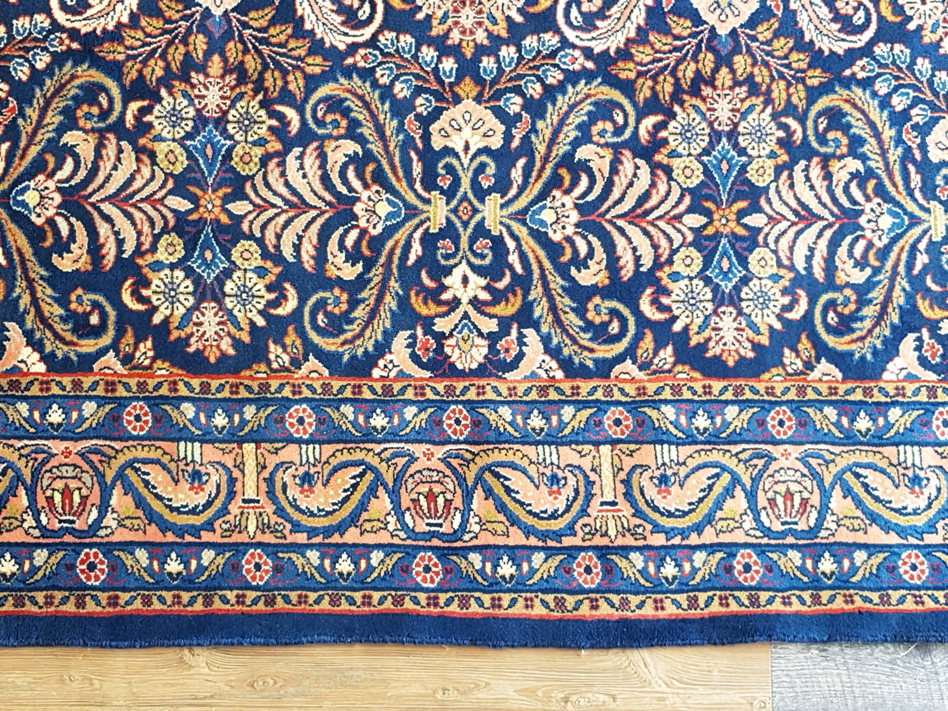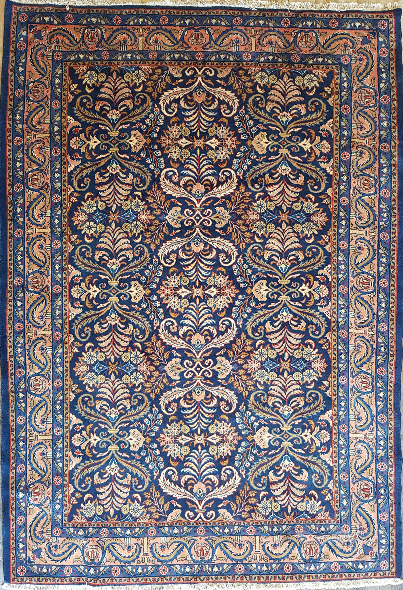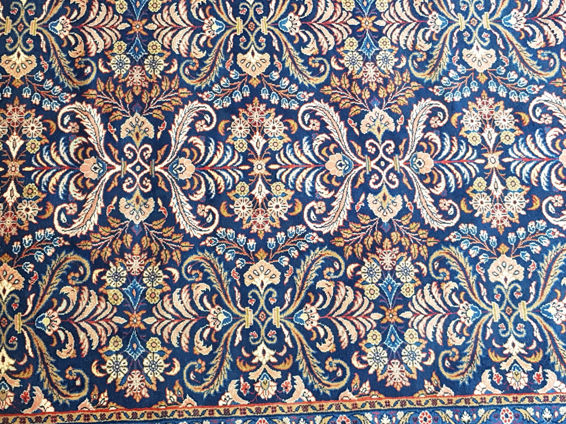 The navy blue field sets a rich foundation for the soft peach, ivory, and light blue accents, while touches of pale yellow and muted red add subtle warmth. A soft peach border, adorned with scrolling vines and floral elements, gently frames the composition, supported by delicately rendered guard bands.