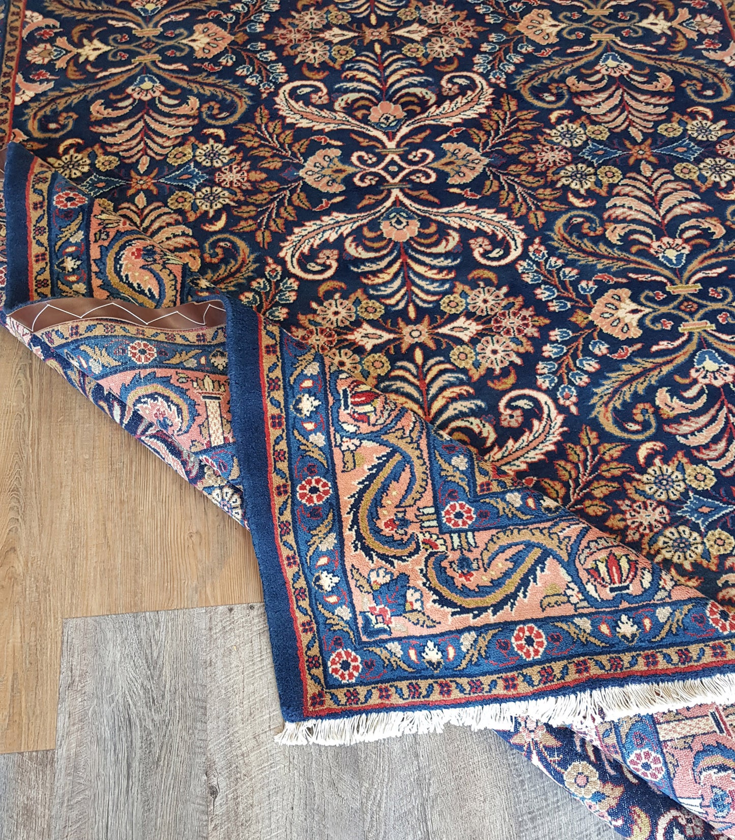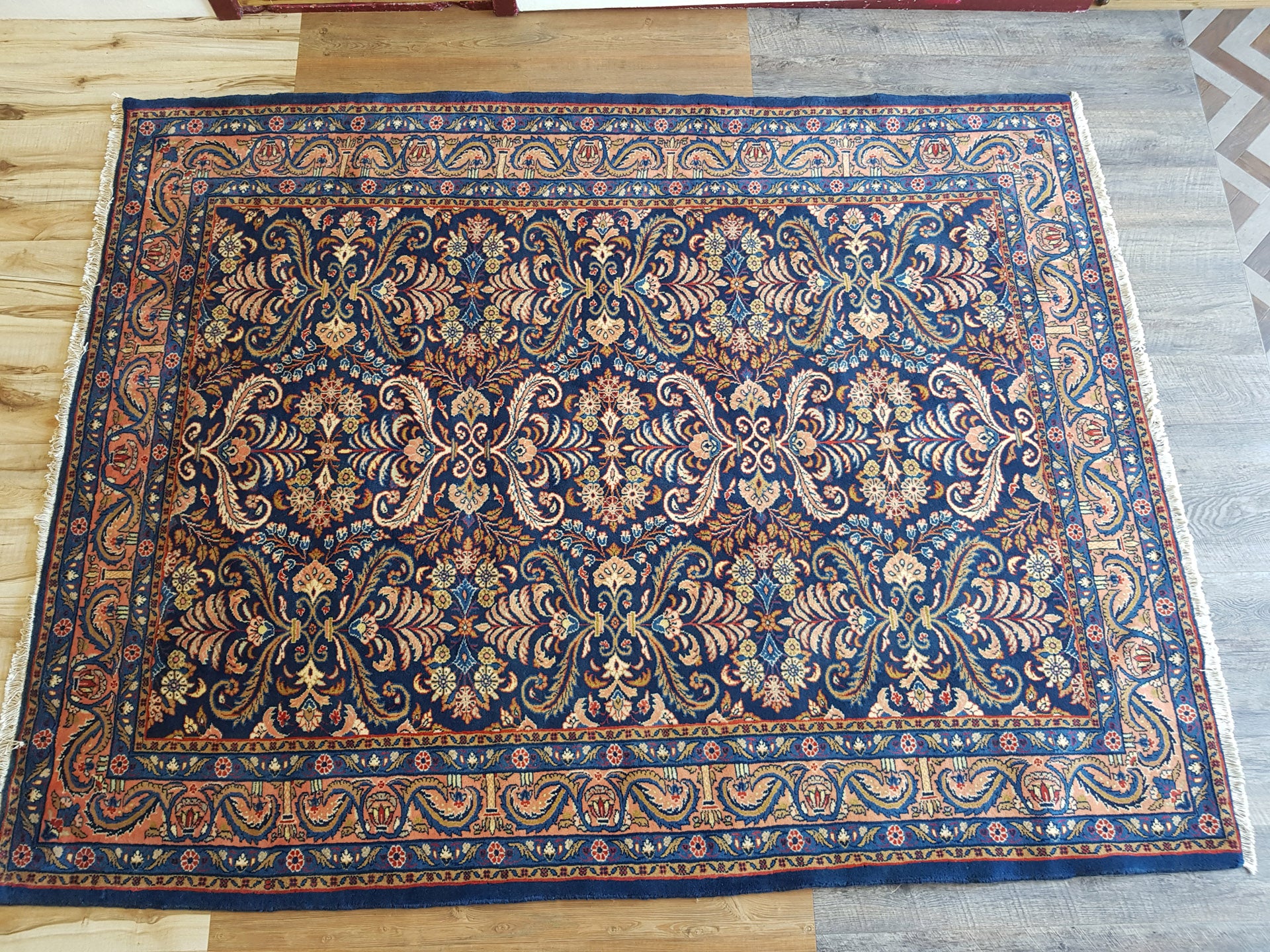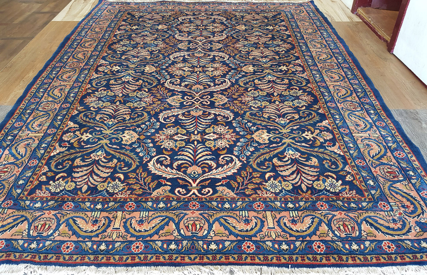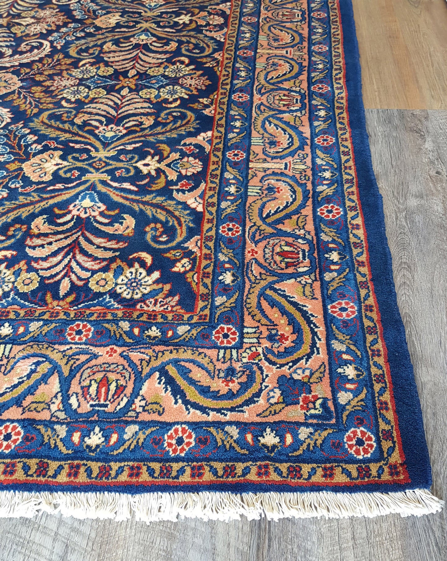 The navy blue field sets a rich foundation for the soft peach, ivory, and light blue accents, while touches of pale yellow and muted red add subtle warmth. A soft peach border, adorned with scrolling vines and floral elements, gently frames the composition, supported by delicately rendered guard bands.