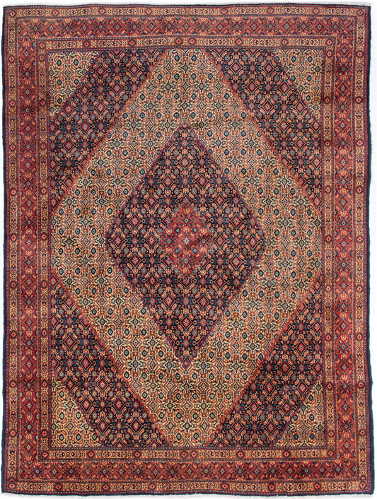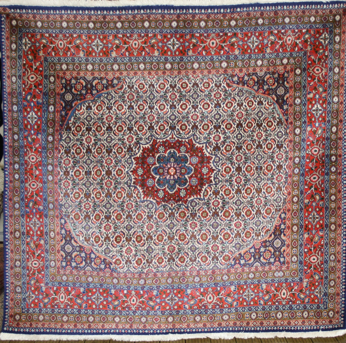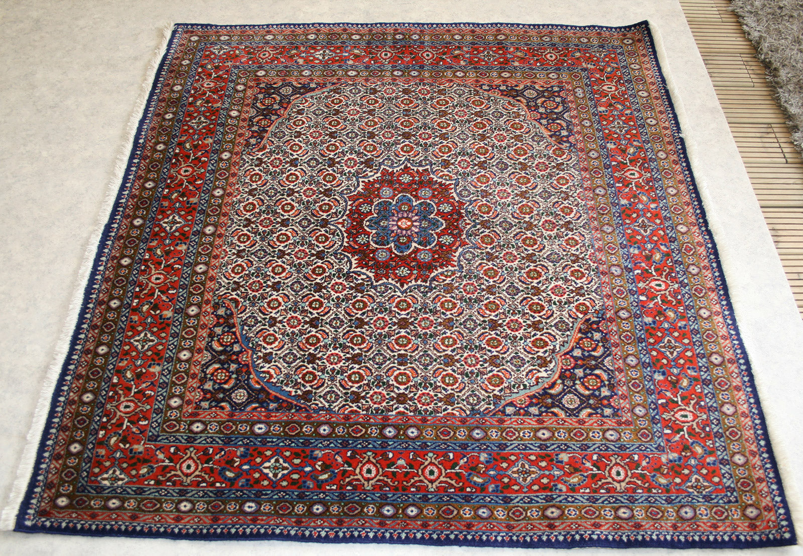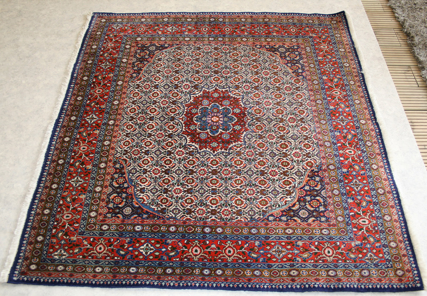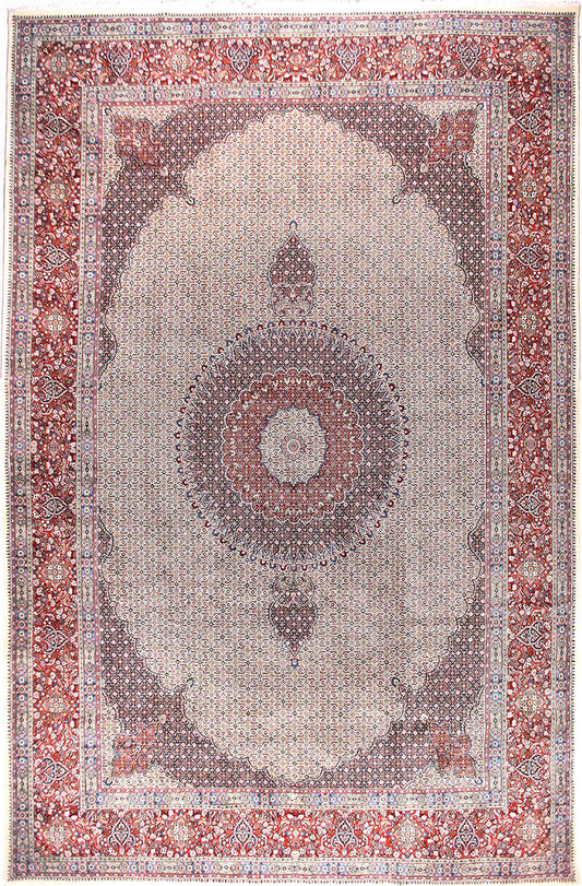 Hand-knotted in the town of Moud, Iran, this Persian rug embodies the region’s mastery of balance and intricacy. Its central medallion—lobed and gracefully integrated into the ivory field—sits within a dense arrangement of Herati motifs, featuring stylised rosettes and diamond formations that reflect Moud’s signature blend of floral and geometric design.