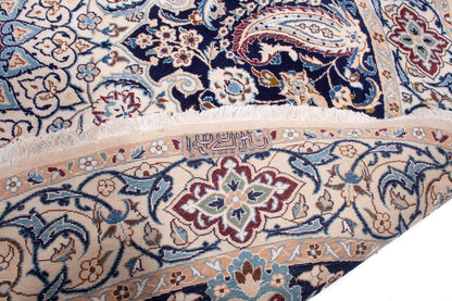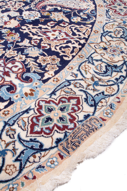Introducing the Persian Nain Round Rug, a hand-knotted masterpiece hailing from the renowned weaving traditions of Nain, Iran. This exquisite piece is a testament to the meticulous craftsmanship and rich cultural heritage of Persian rug-making, where each knot is a deliberate act of artistry. The Nain style is celebrated for its intricate patterns and harmonious colour palettes, making this rug a distinguished addition to any sophisticated home.