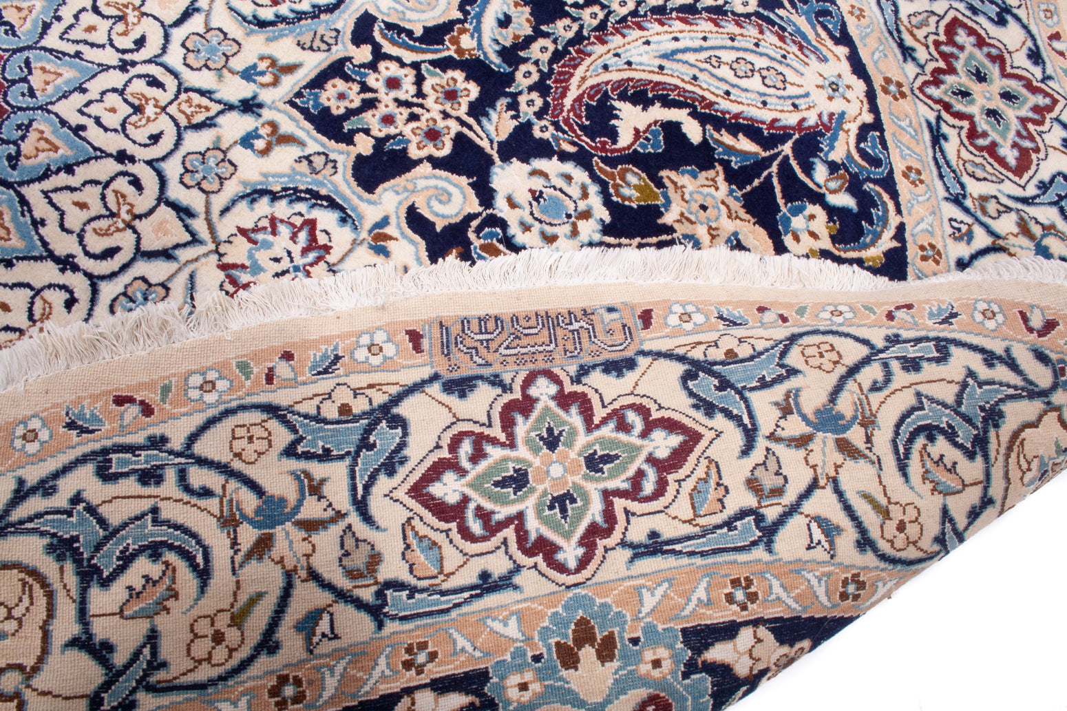 The rug's design is a symphony of intricate motifs, with a central medallion that commands attention, surrounded by a delicate interplay of floral and paisley patterns. The palette of deep navy, soft cream, and subtle touches of light blue and burgundy create a visual feast, enhancing the complexity of the design without overwhelming the senses. The use of wool for the pile ensures a luxurious texture, while the cotton foundation provides durability and stability. The motifs, reminiscent of the Shah Abbasi and Herati designs, carry historical significance, symbolising beauty and prosperity.