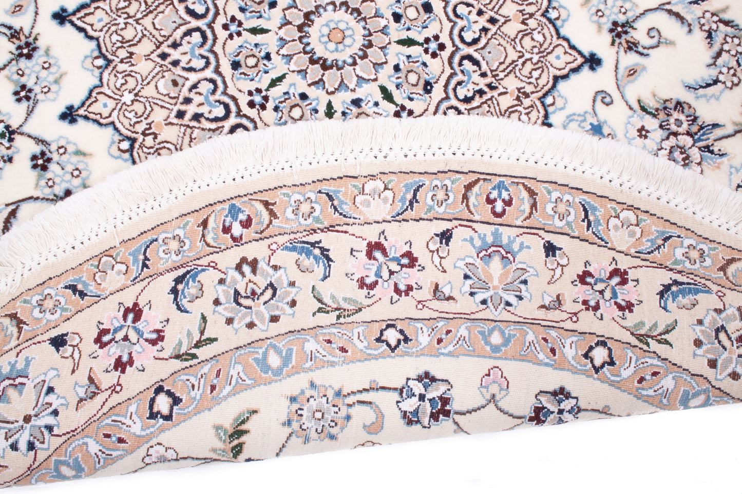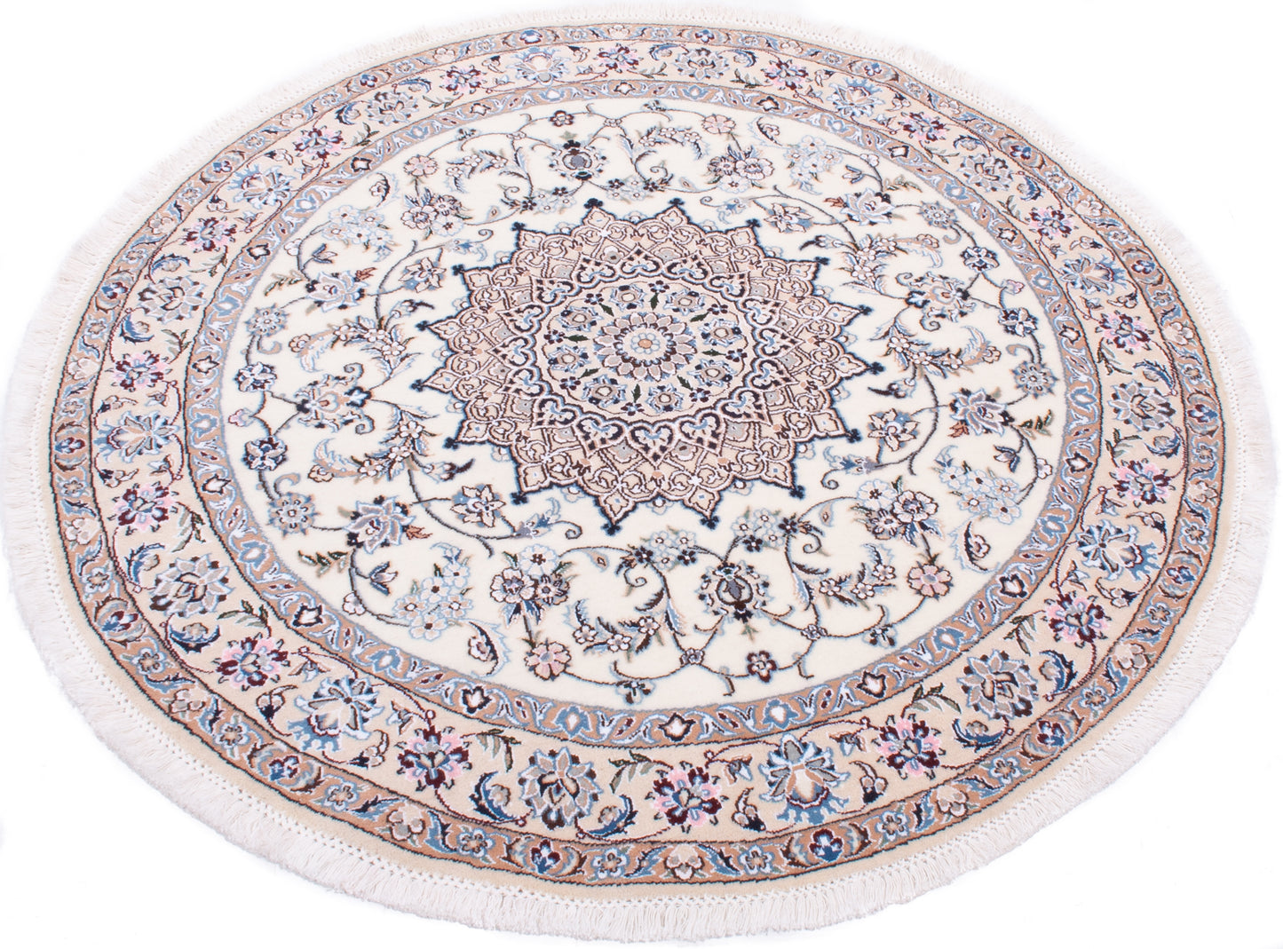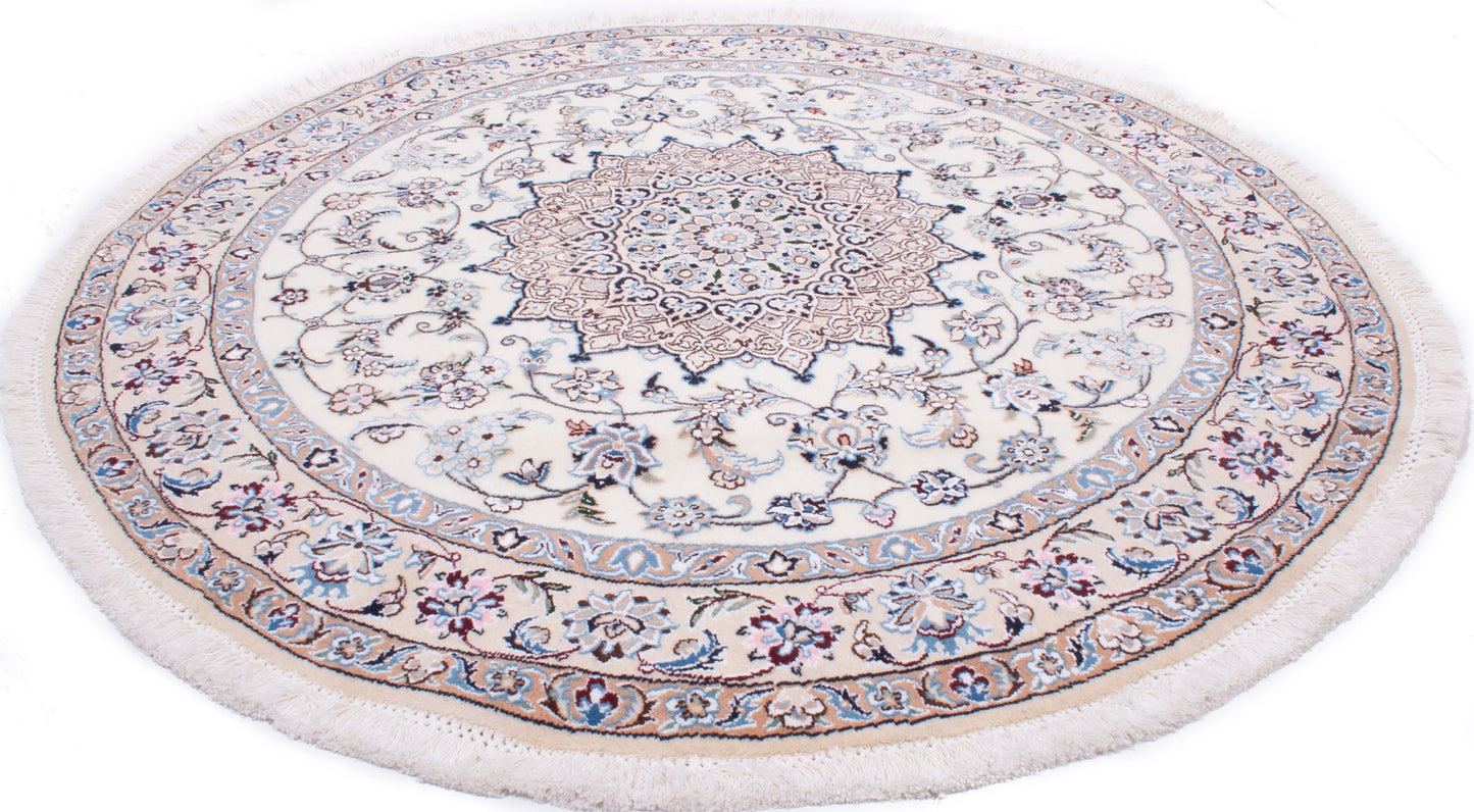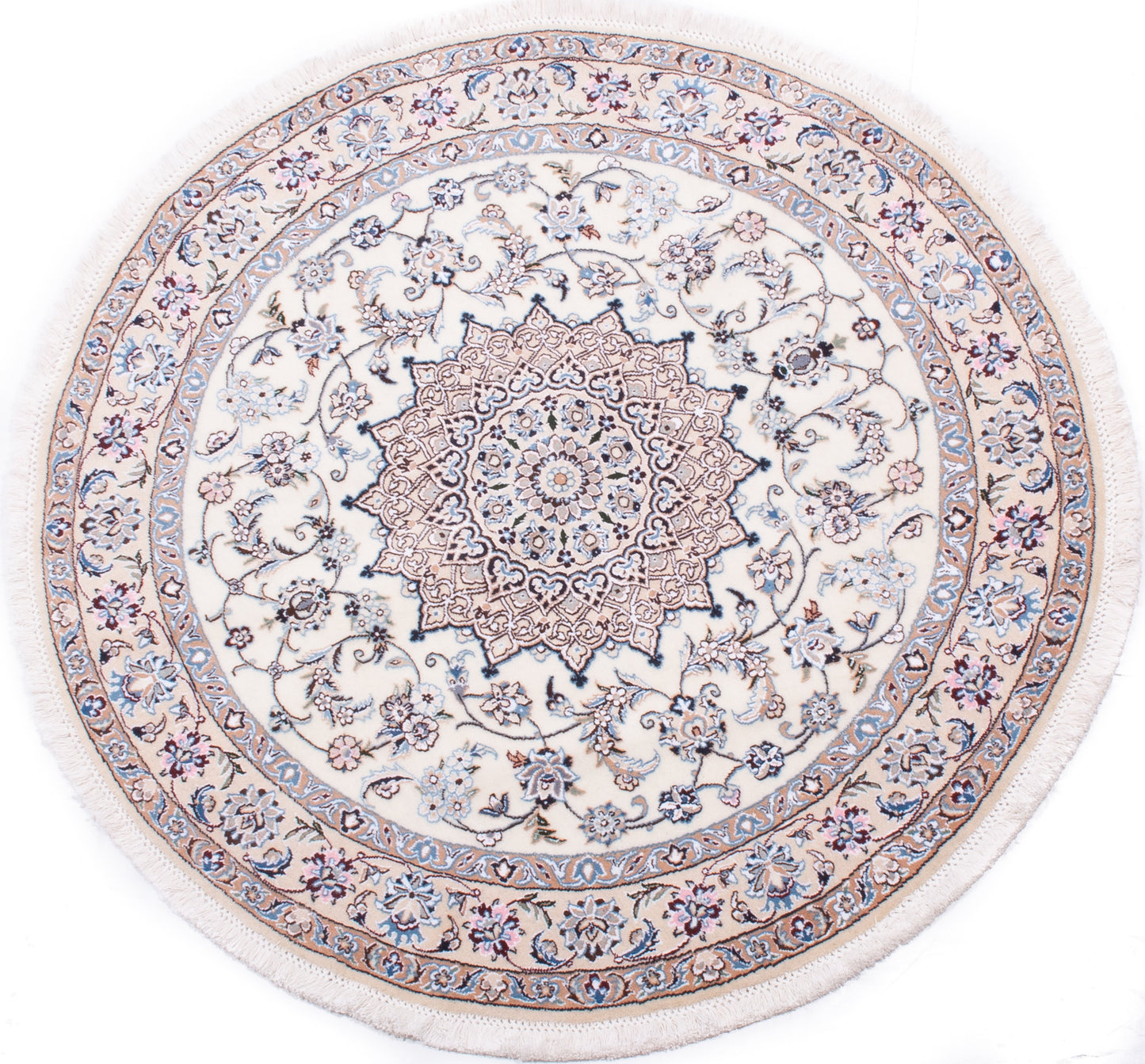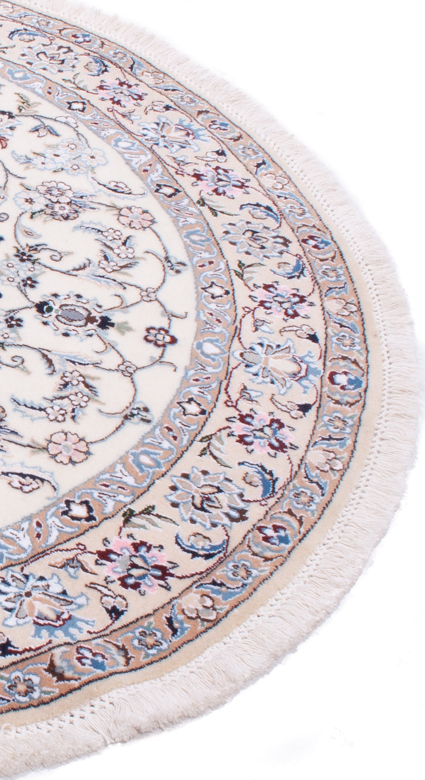 Hand-knotted in the storied workshops of Nain, this round Persian rug embodies the town’s legacy of refinement and balance. At its heart lies a star-shaped medallion adorned with floral palmettes and rosettes, set against a creamy ivory field that radiates symmetry and grace.