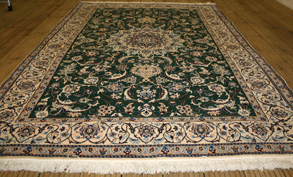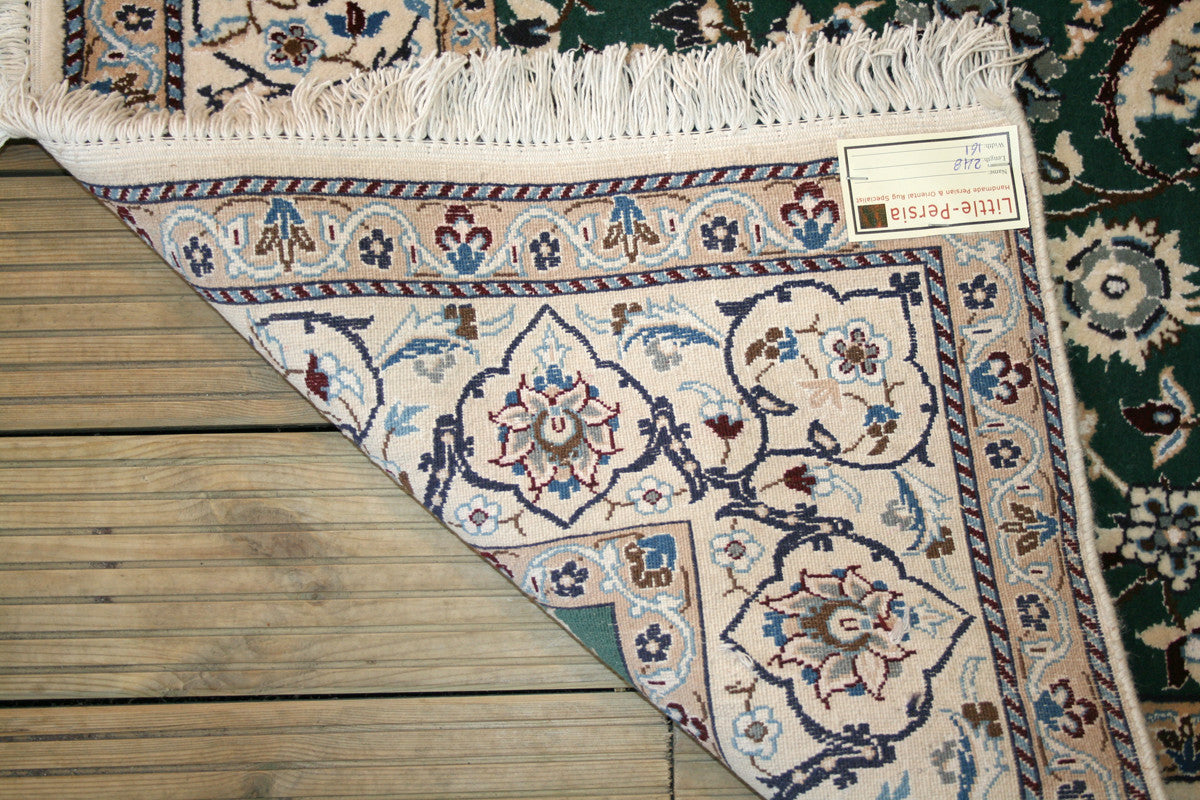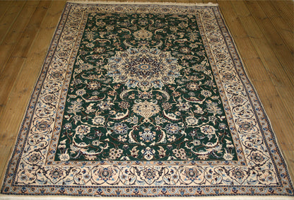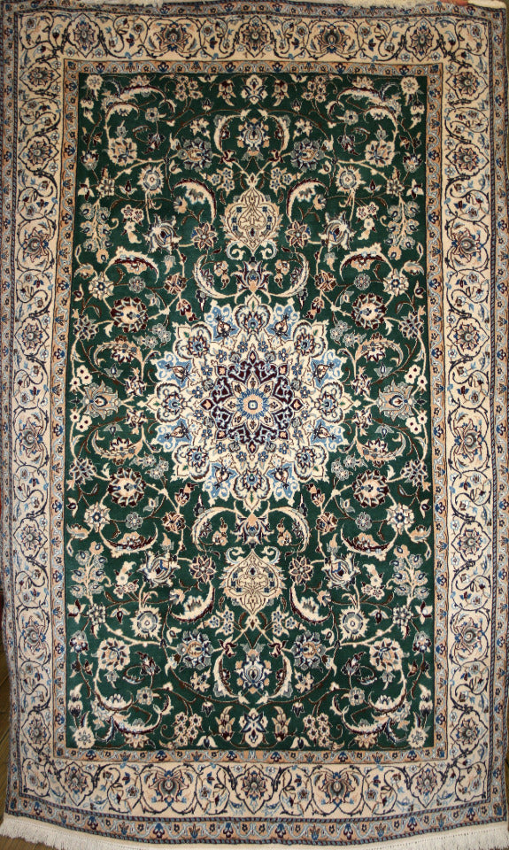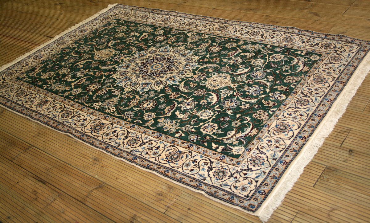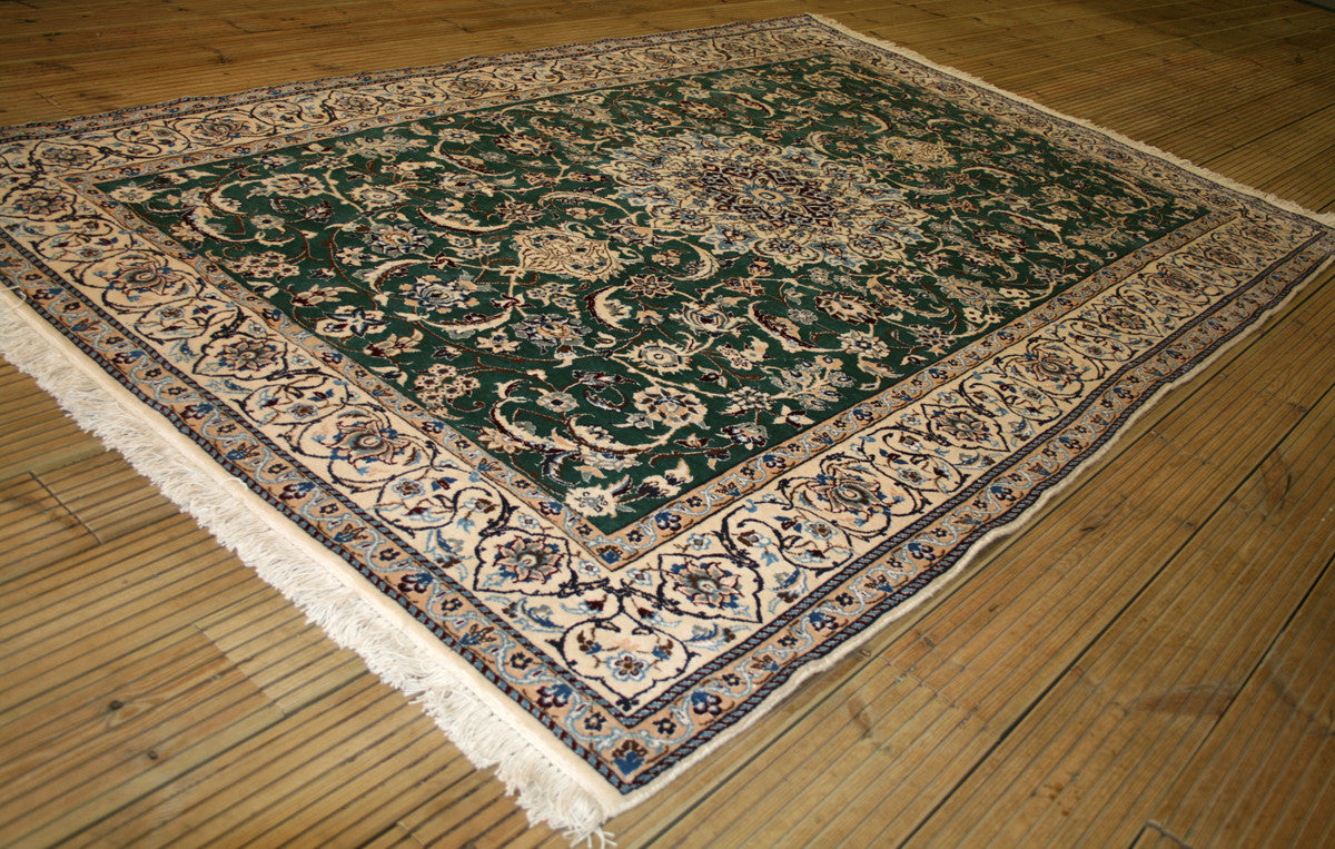 This Persian Nain Rug is a great way to add some flavor to your space! Hand-knotted from fine wool and cotton, its rectangular shape is full of life and personality with a bright green, blue, and ivory color palette and bold floral design centered around a central medallion. It's one-of-a-kind and straight from the city of Nain, Iran - so you know you're getting the real deal!