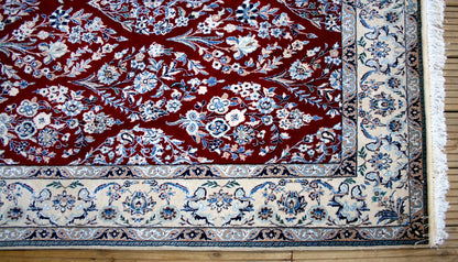 Hand-knotted in the historic weaving centre of Nain, this Persian rug exemplifies the town’s dedication to refinement and balance. Its all-over floral design, free from a central medallion, creates a sense of continuity and harmony, featuring stylised palmettes, rosettes, and lotus forms arranged in a mirrored, flowing composition.