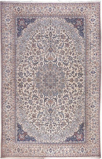 Hand-knotted in Nain, Iran, this Persian rug embodies the city’s renowned precision and elegance. Its ivory field is adorned with Shah Abbasi motifs, palmettes, and flowing vine patterns, arranged in a symmetrical, floral medallion layout that reflects the classical aesthetics of Persian design.