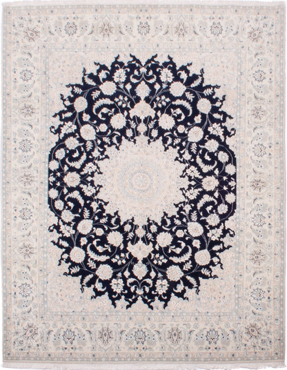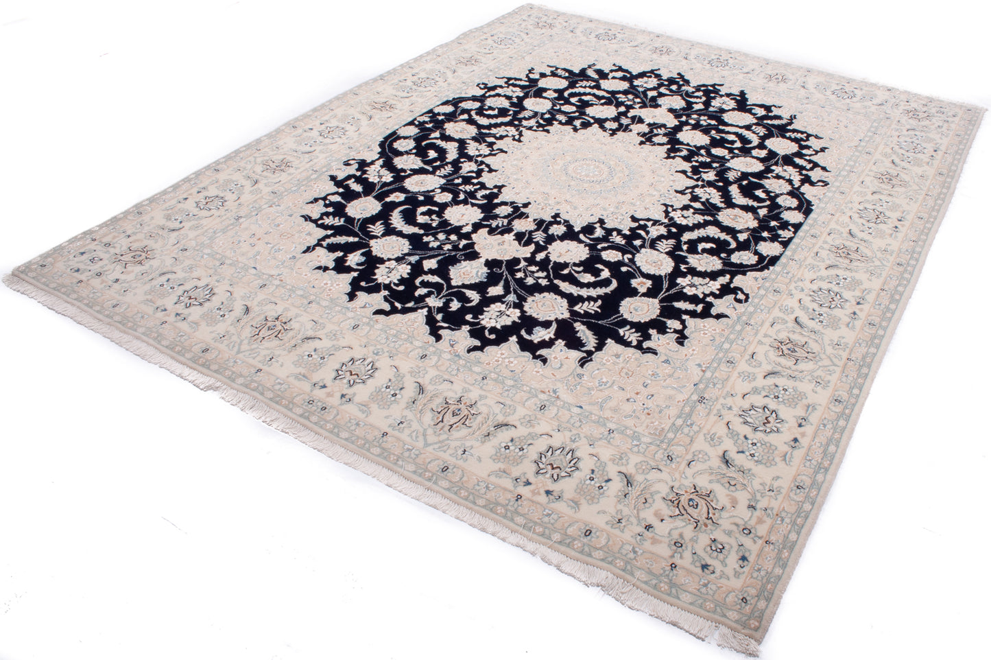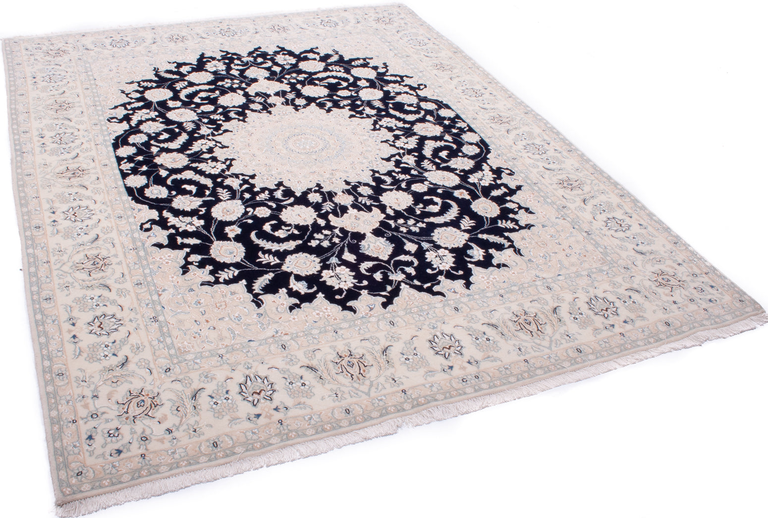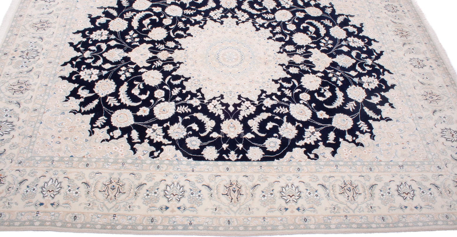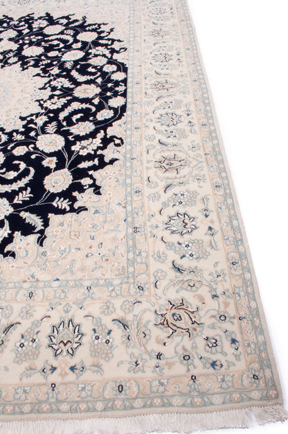 Hand-knotted in Nain, Iran, this Persian rug embodies the town’s renowned precision and elegance. At its heart lies a striking navy medallion, intricately lobed and adorned with floral detail, set against a soft ivory and beige field that amplifies its presence.