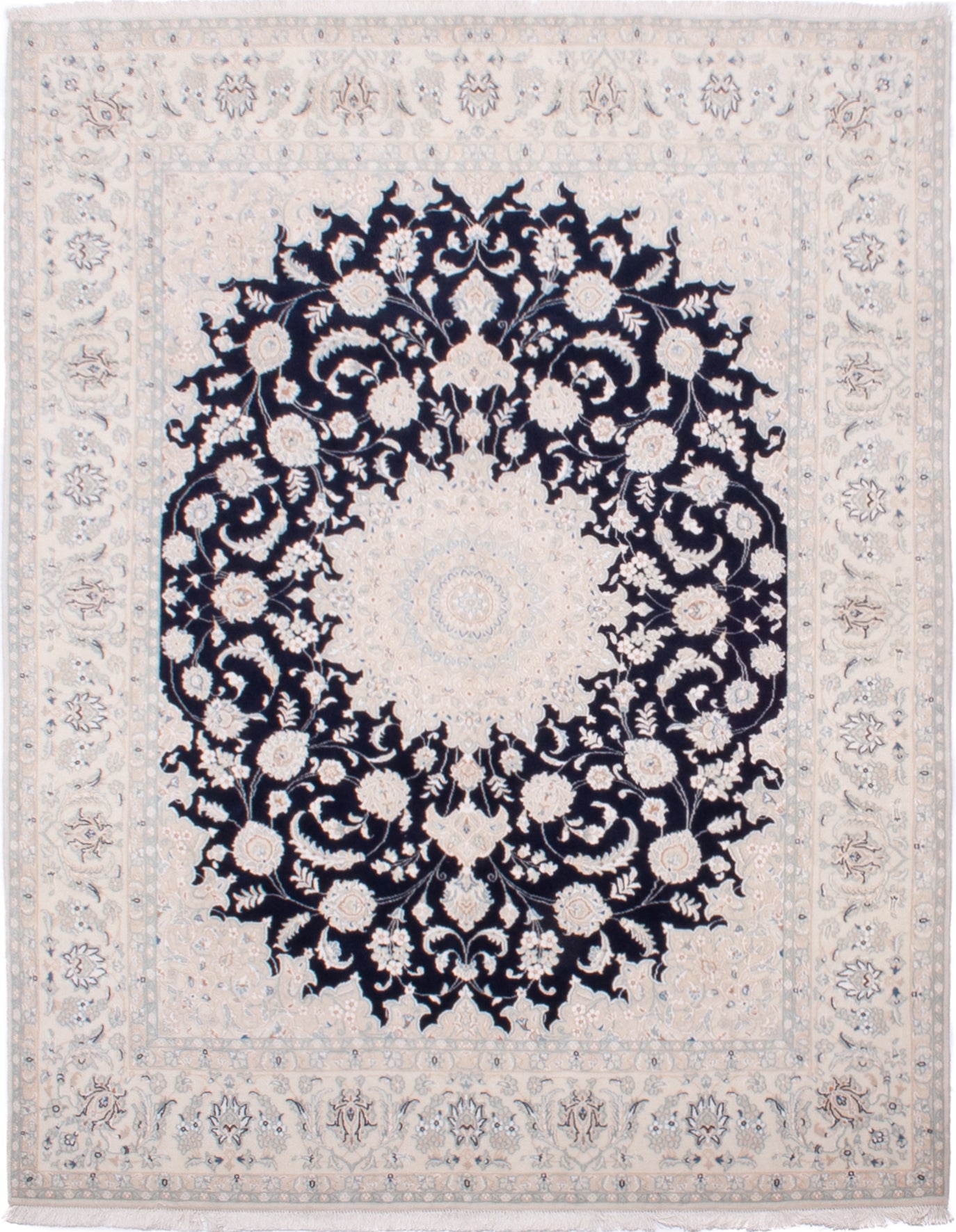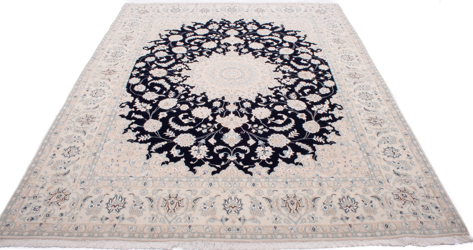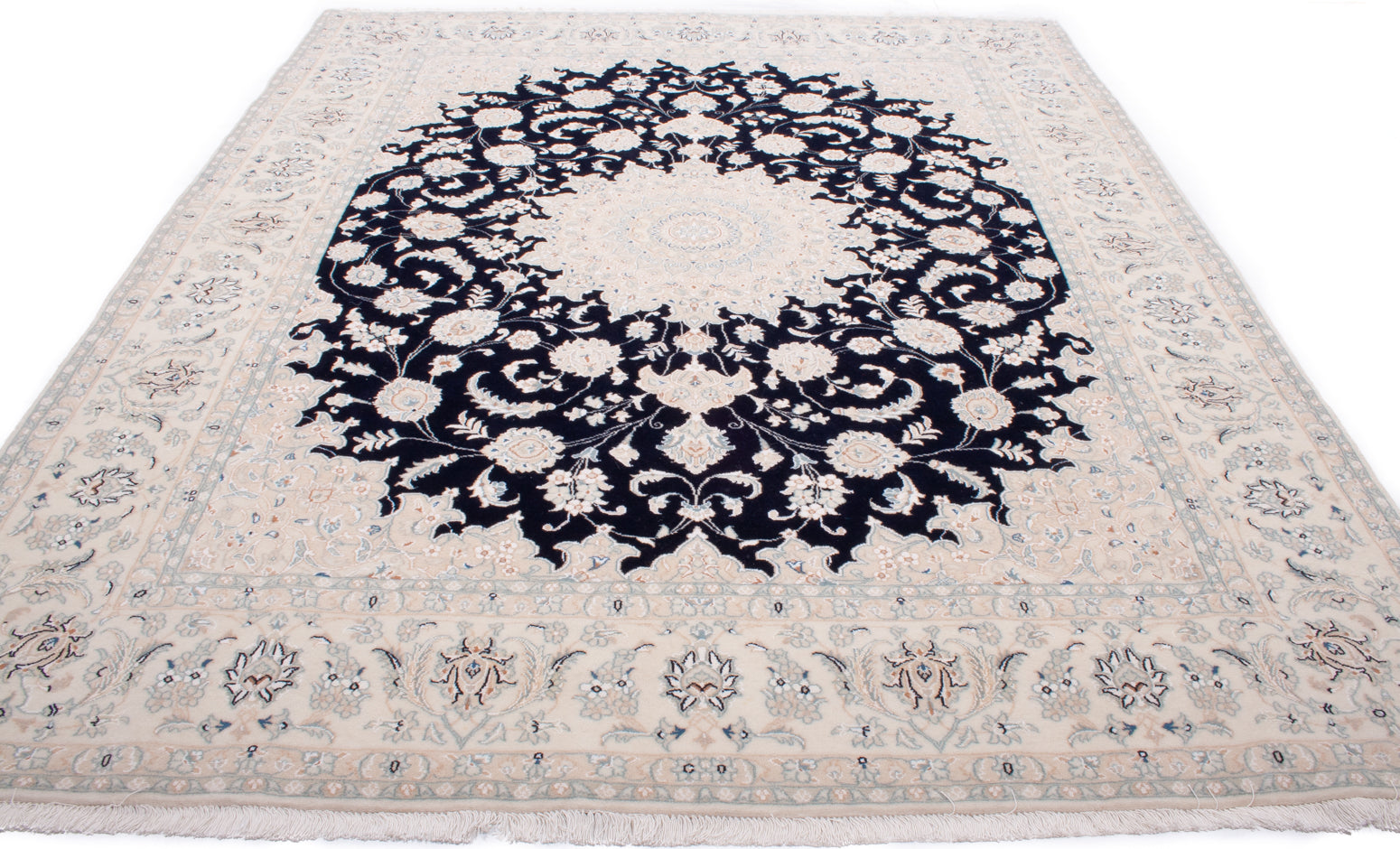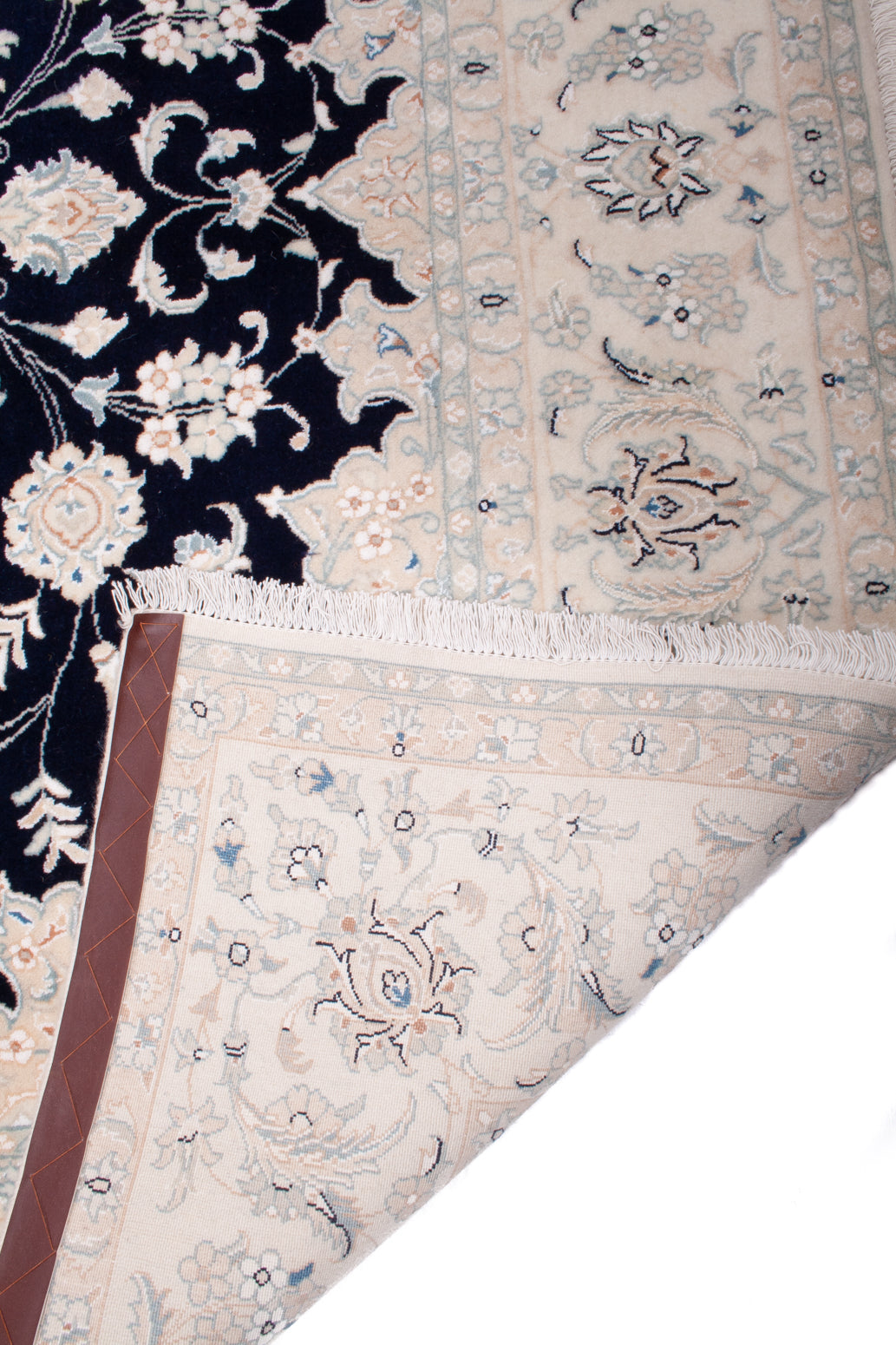 Hand-knotted in Nain, Iran, this Persian rug embodies the town’s renowned precision and elegance. At its heart lies a striking navy medallion, intricately lobed and adorned with floral detail, set against a soft ivory and beige field that amplifies its presence.
