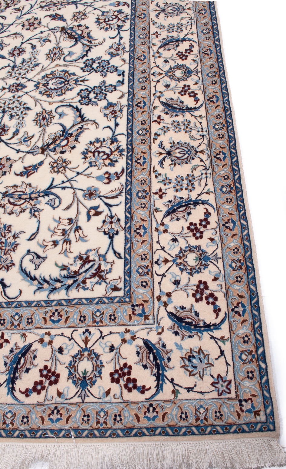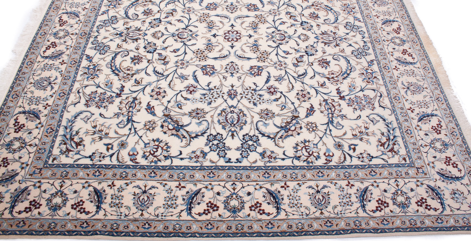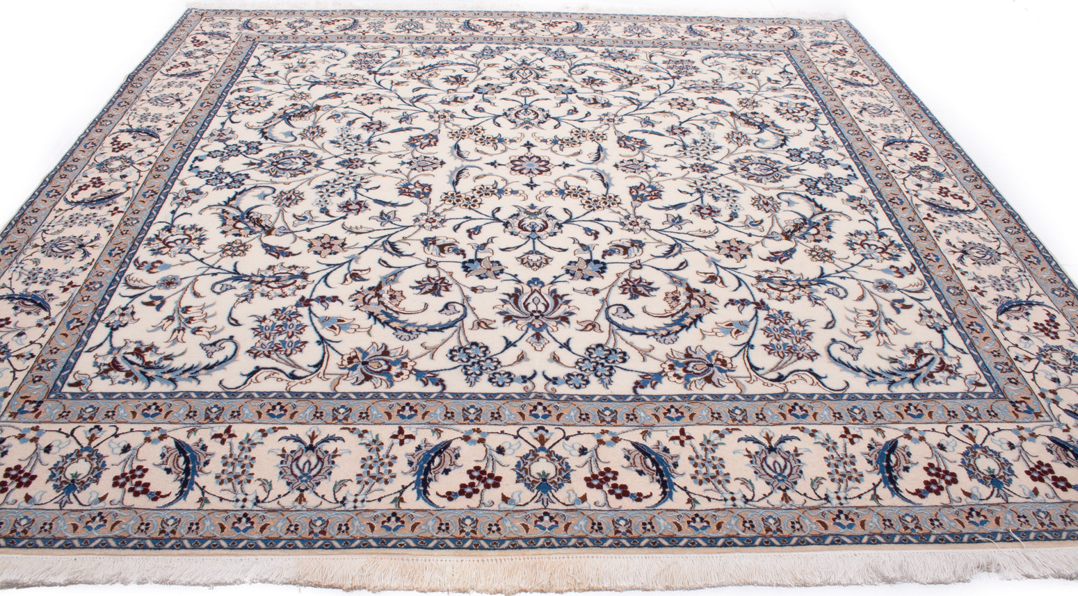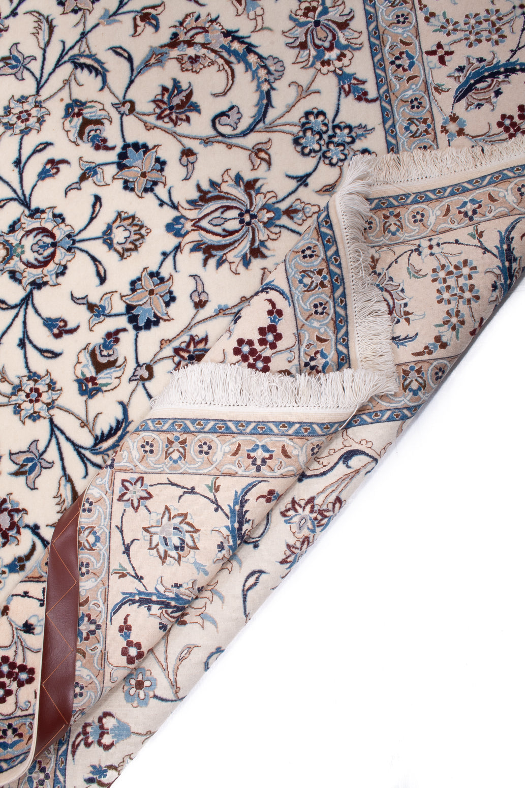 Hand-knotted in Nain, Iran, this 6La Persian rug exemplifies the town’s renowned precision and refinement. Woven from fine kork wool and silk on a cotton foundation, it reflects the meticulous craftsmanship that defines Nain weaving.