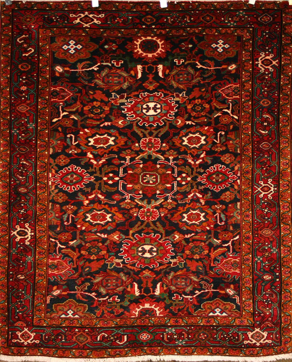 Hand-knotted in the village of Nanaj, this Persian rug embodies the bold geometry and rhythmic symmetry characteristic of rural weaving traditions. Its deep indigo field is adorned with serrated, star-like medallions and stylised floral rosettes, arranged in a mirrored, all-over layout that speaks to the weaver’s sense of balance and repetition.