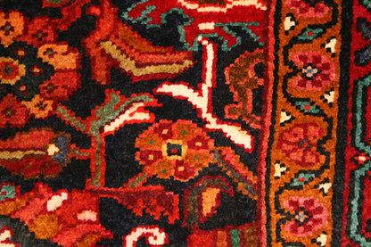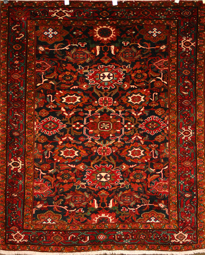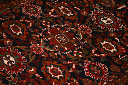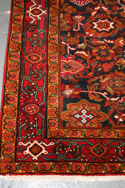 Hand-knotted in the village of Nanaj, this Persian rug captures the bold symmetry and tribal character that define Hamadan weaving. Its all-over geometric design features stylised rosettes, star-like forms, and angular floral motifs, arranged in a mirrored layout that creates a sense of rhythmic balance.