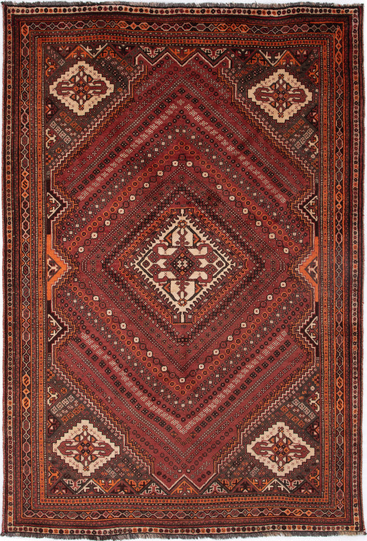 Hand-knotted by the Qashqai tribes of Iran, this Persian rug embodies the spirit of nomadic craftsmanship and storytelling. Its bold, diamond-shaped medallion sits at the heart of a crimson field, surrounded by stylised floral and geometric motifs that echo tribal symbolism and aesthetic balance.
