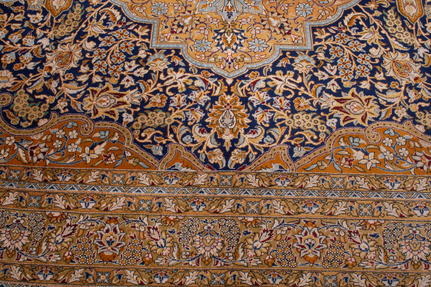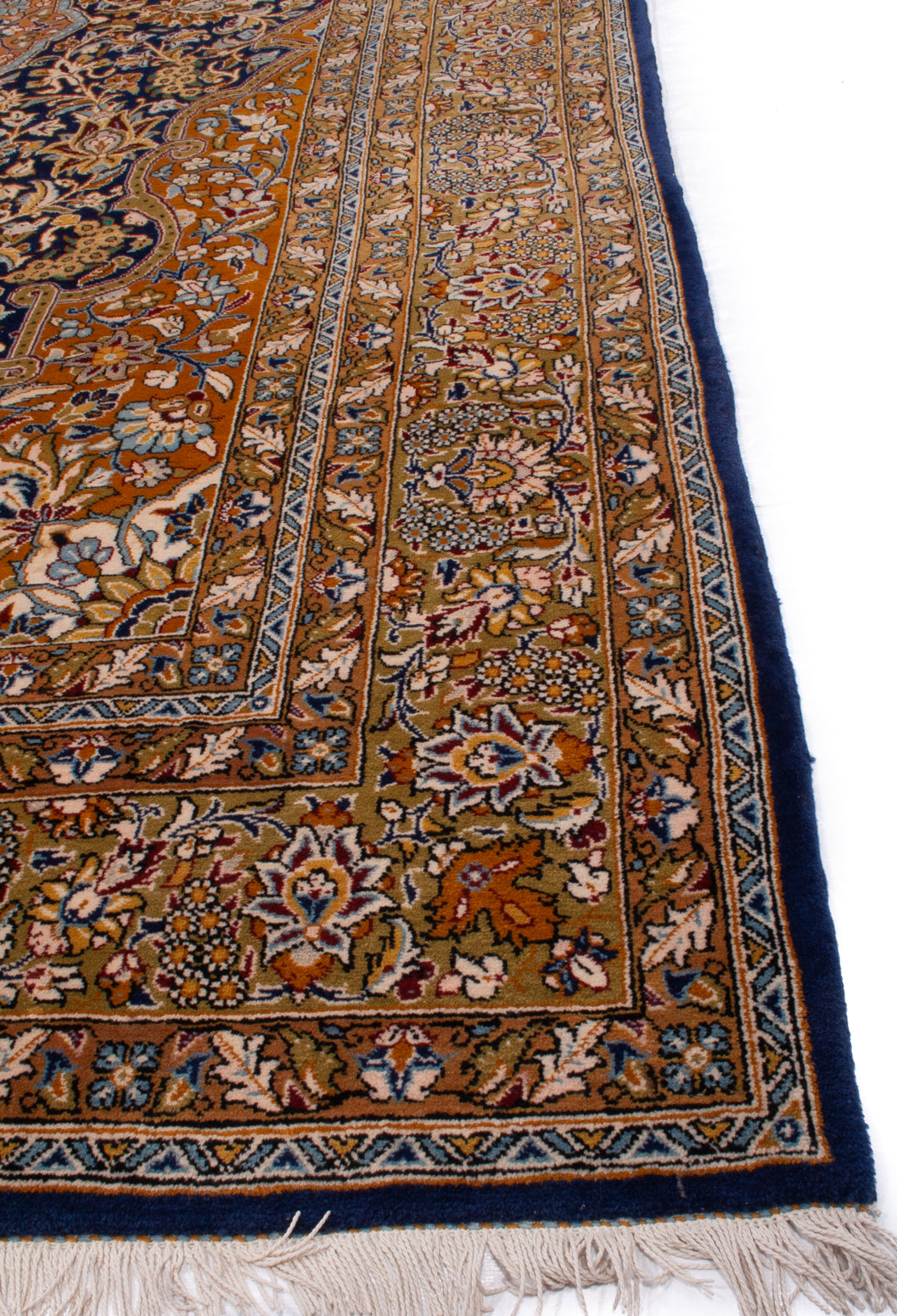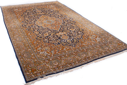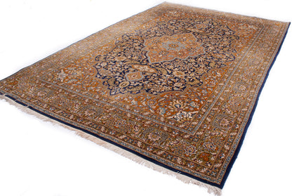 The rug's design is a captivating interplay of intricate patterns and harmonious colours. A central medallion, adorned with floral motifs, is surrounded by an elaborate field of vines and blossoms, showcasing the Shah Abbasi motif, a symbol of beauty and abundance. The palette features warm earth tones complemented by deep blues, which together create a sense of depth and sophistication. The border, with its delicate vine scrolls, frames the composition with elegance, making it a visual feast for the discerning eye.