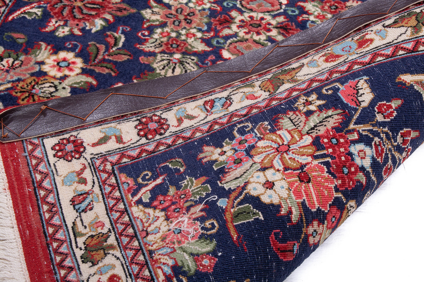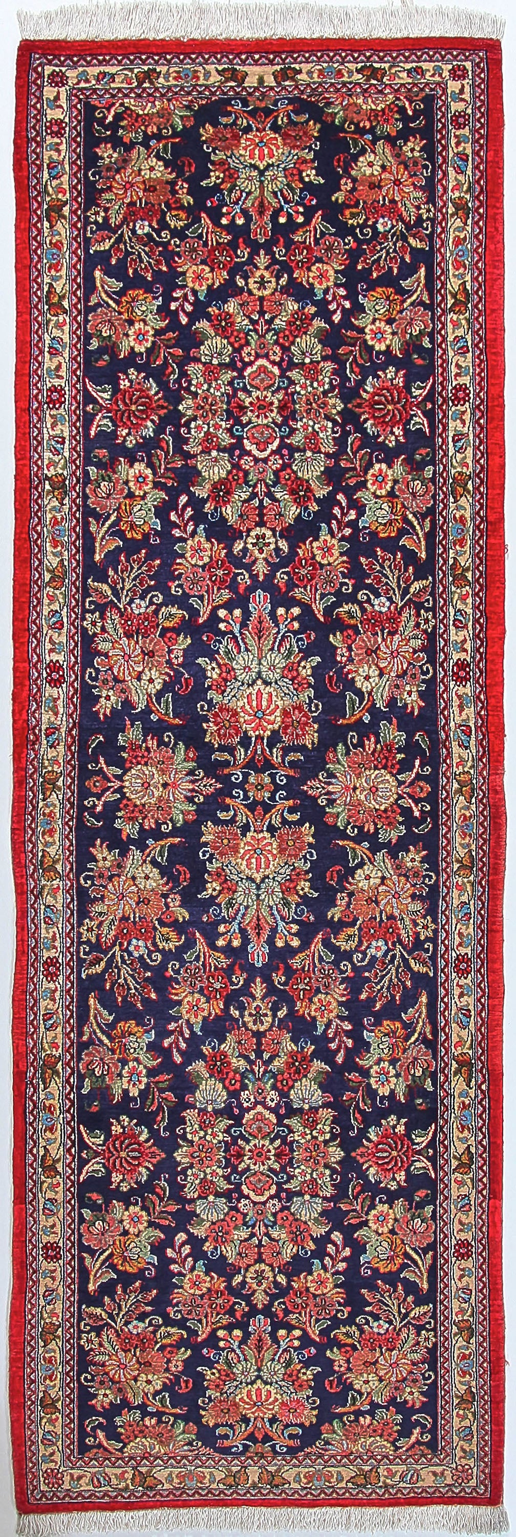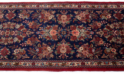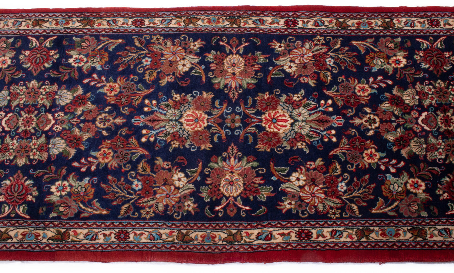 Hand-knotted in Qom, Iran, this Persian runner exemplifies the city's legacy of precision and artistry. Its all-over floral design, anchored by palmettes, rosettes, and flowing vines, unfolds symmetrically across a deep navy field, enriched with tones of ivory, gold, and soft red.