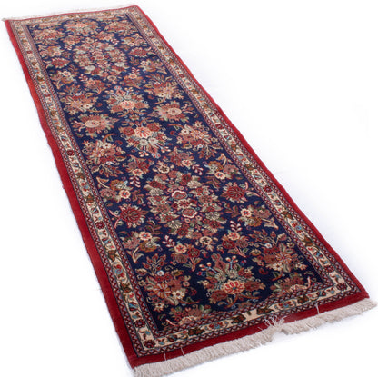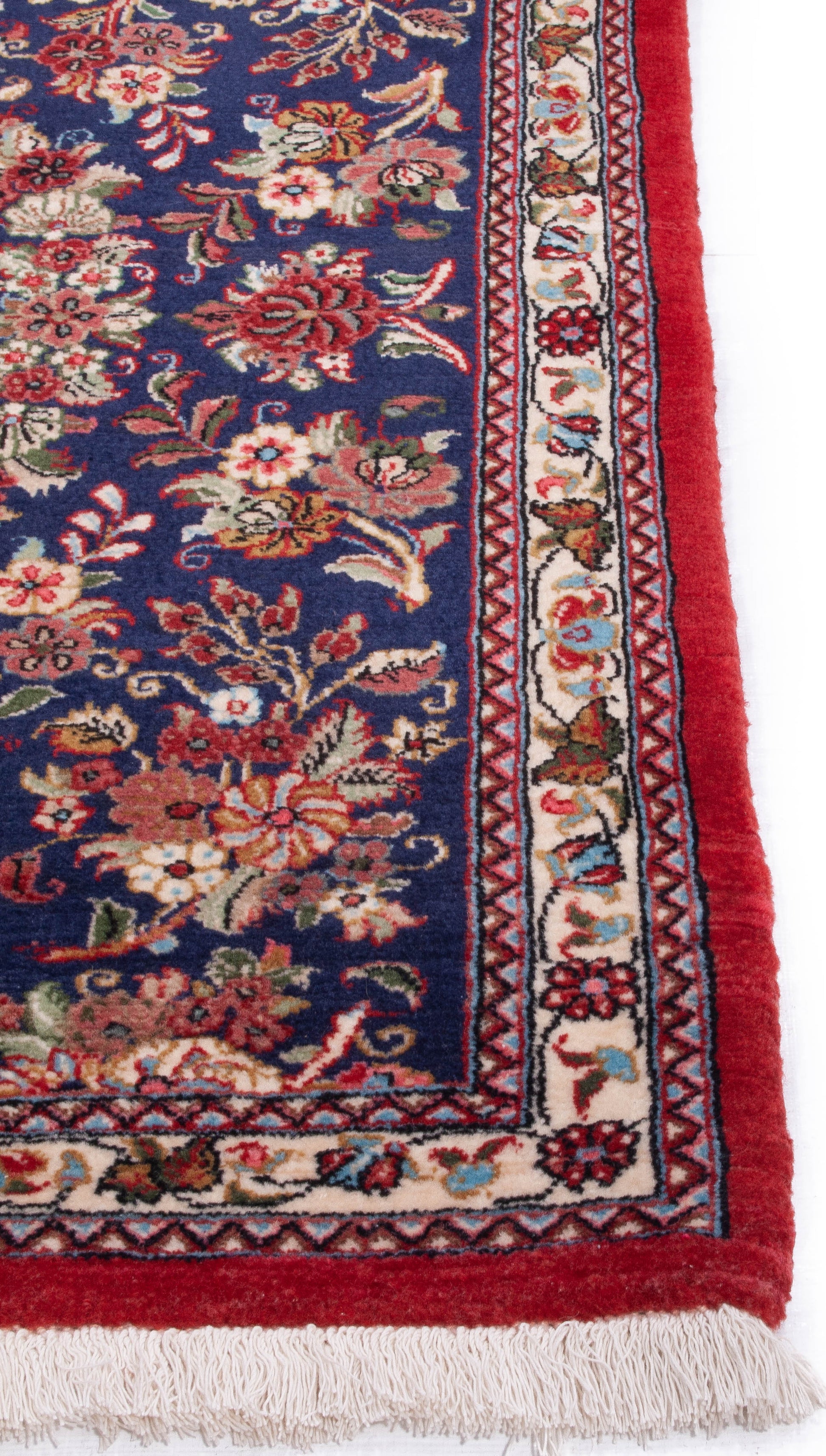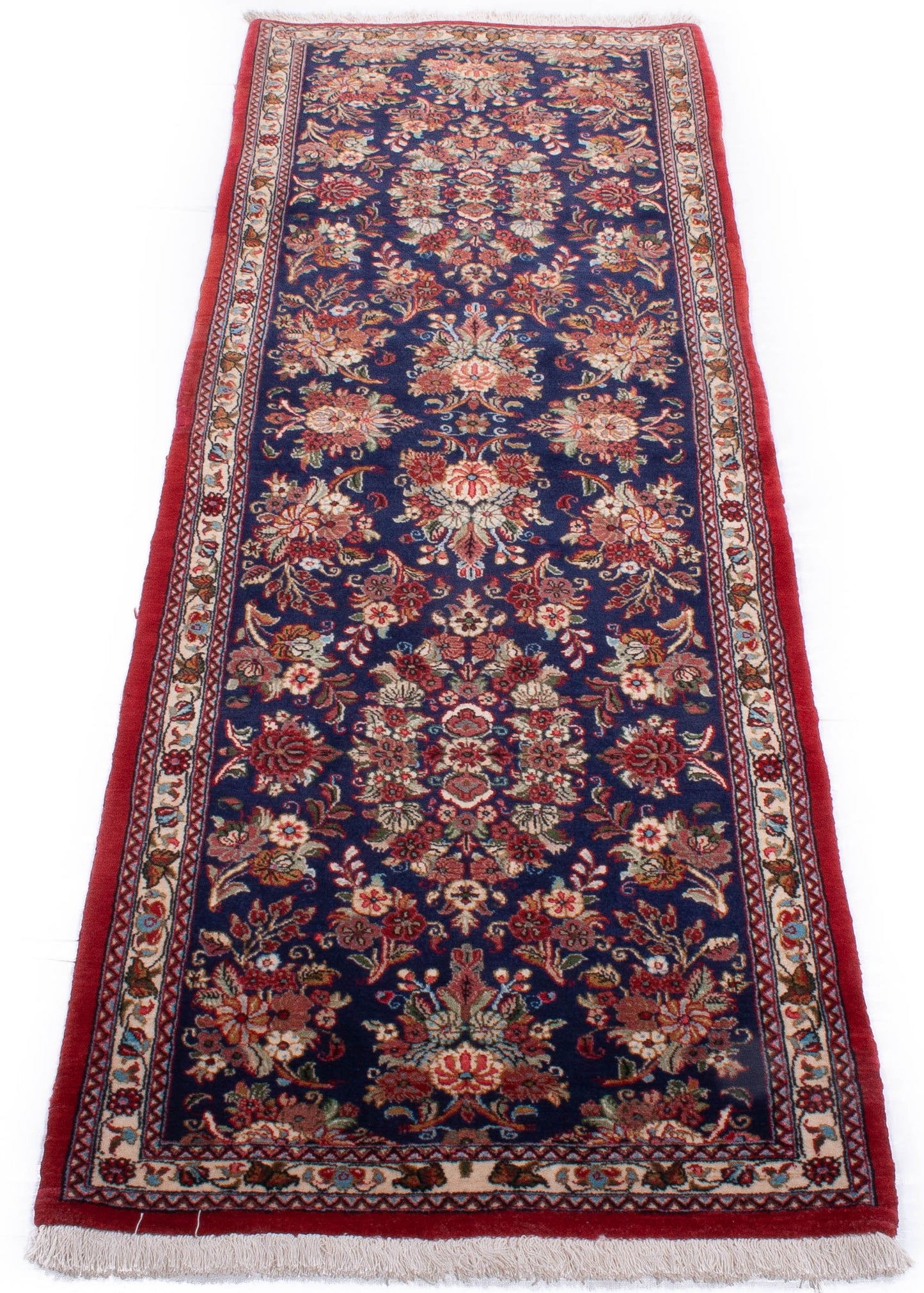 Hand-knotted in Qom, Iran, this Persian runner exemplifies the city's legacy of precision and artistry. Its all-over floral design, anchored by palmettes, rosettes, and flowing vines, unfolds symmetrically across a deep navy field, enriched with tones of ivory, gold, and soft red.