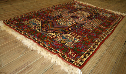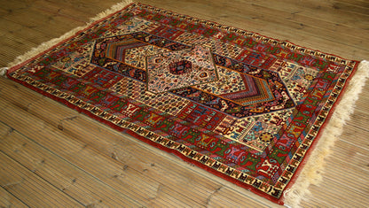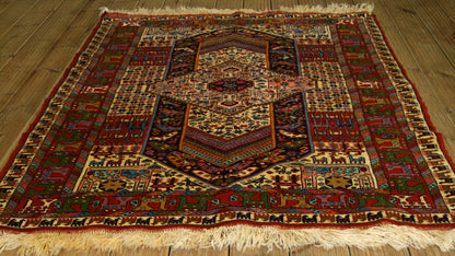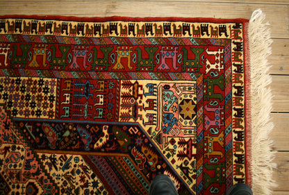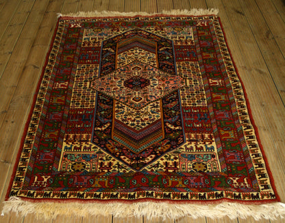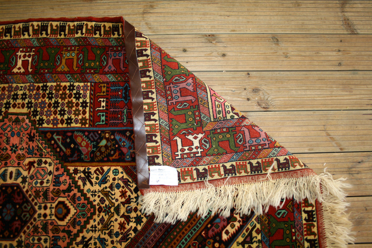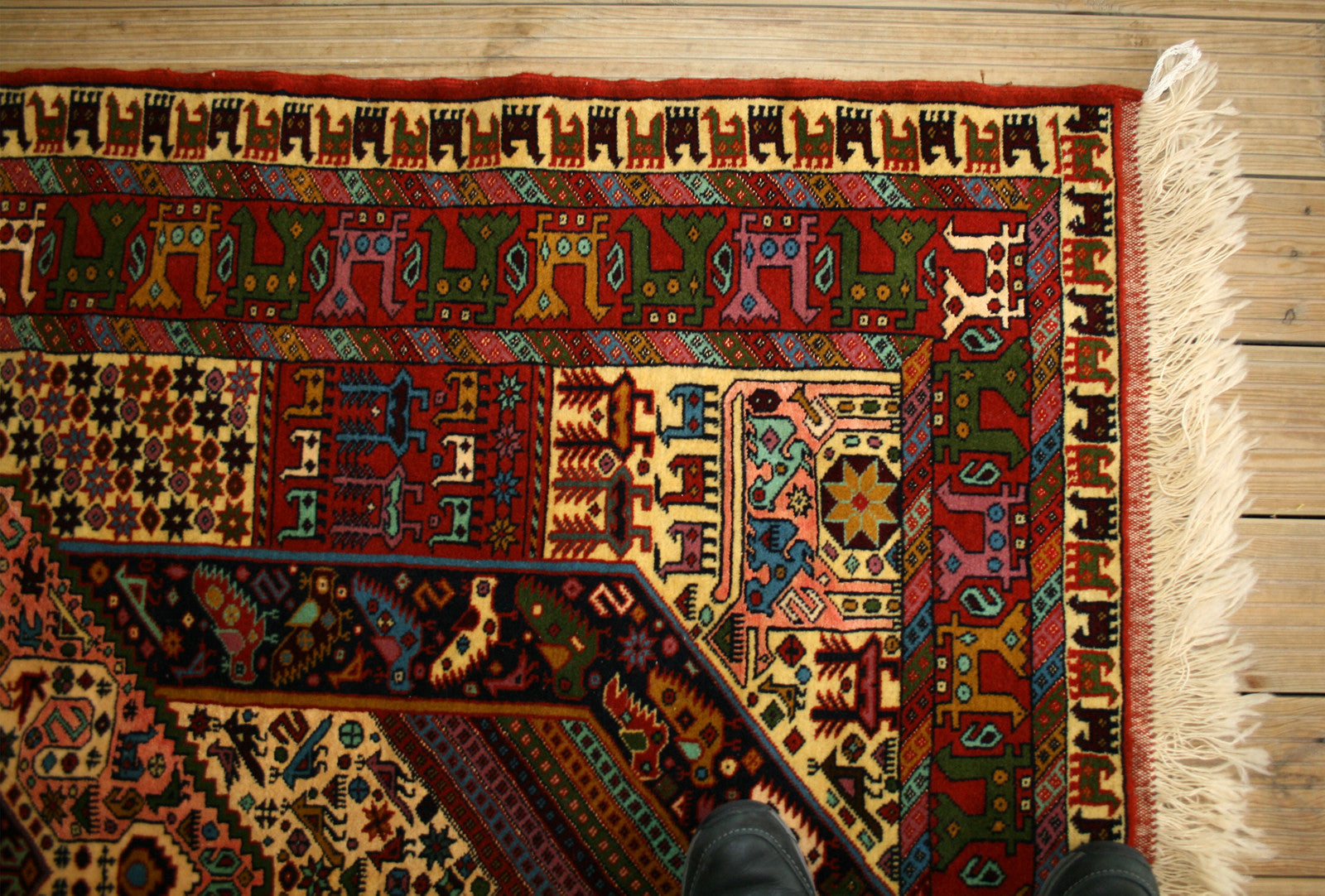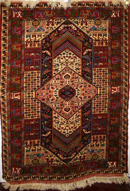 Hand-knotted in Quchan, Iran, this Persian rug weaves together wool, silk, and tribal storytelling into a striking geometric form. At its heart lies an elongated medallion, flanked by hooked motifs, octagrams, and stylised animal figures—symbols deeply rooted in nomadic expression. The mirrored layout and earthy palette of ivory, brick red, navy, and forest green create a design that feels both bold and balanced.