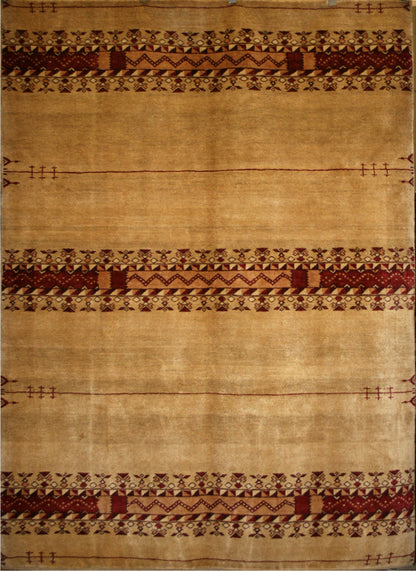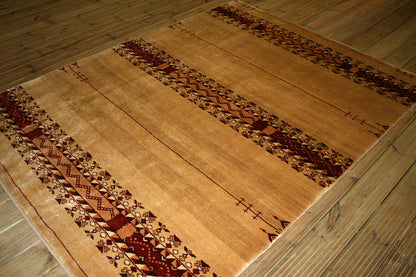 This traditional Persian hand-knotted Gabbeh rug is made of wool pile and foundation, creating a modern, yet durable design. The gold, yellow, and red colors come together to create a warm and inviting effect. This rectangular rug is made in Iran and is perfect for adding luxury and beauty to any floor.