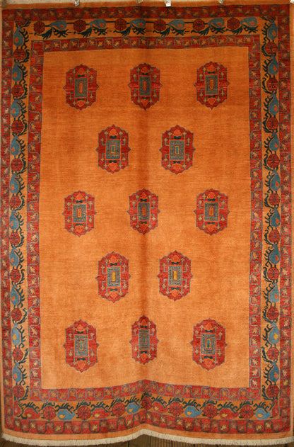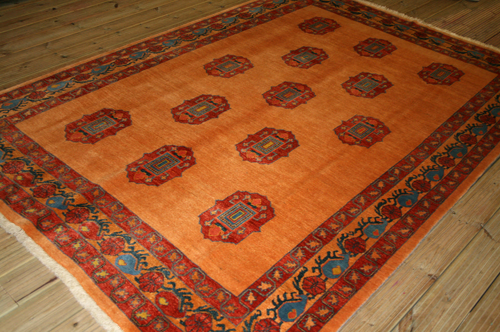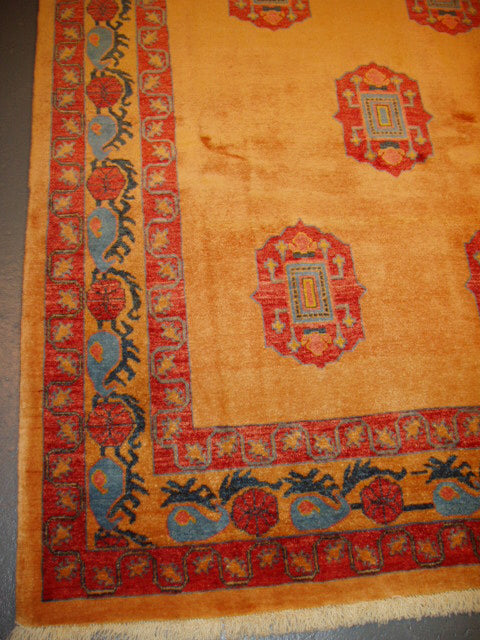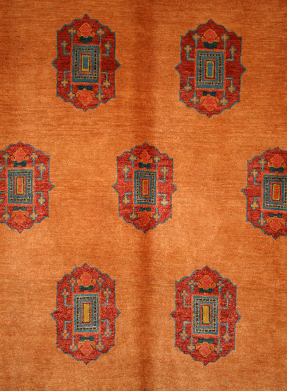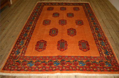 The burnt orange field is richly contrasted by medallions in brick red, teal, and mustard yellow, with slate grey accents adding tonal depth. A scrolling vine and rosette border in brick red and teal provides structure, enclosed by narrow guard bands that enhance the design’s symmetry.