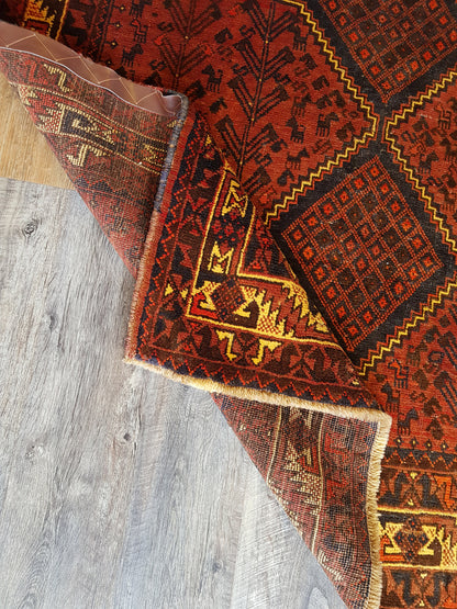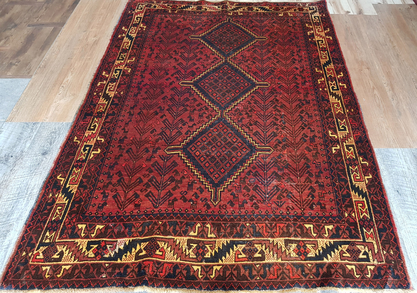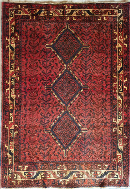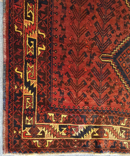 This hand-knotted Shiraz rug from Iran captures the tribal spirit and geometric clarity of Persian weaving. Its repeat medallion layout features three aligned, diamond-shaped medallions set against a deep brick red field, enriched with hooked forms, small animal figures, and mirrored motifs that reflect a tradition of symbolic storytelling.