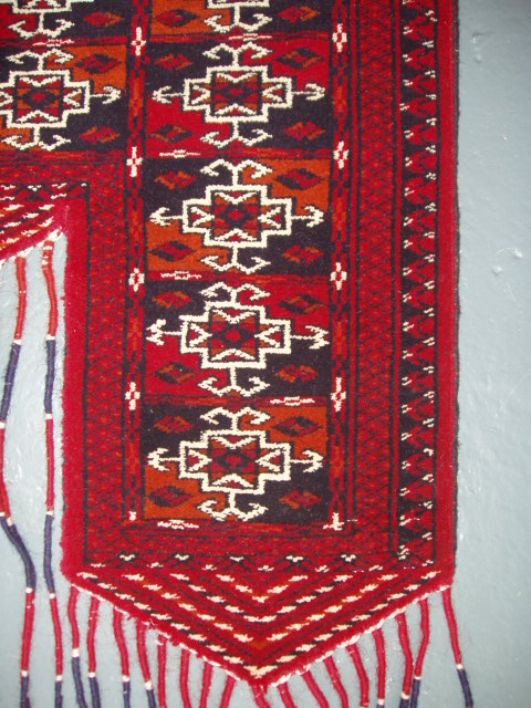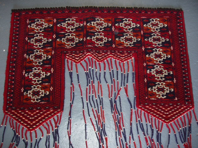 This Persian Turkmen window hanging is a testament to the rich cultural heritage of the Turkmen people, renowned for their intricate and symbolic rug designs. Crafted in Iran, this hand-knotted piece embodies the traditional artistry that has been passed down through generations, capturing the essence of Turkmen craftsmanship in its woolen weave.