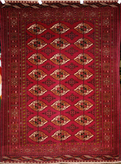 Hand-knotted in Turkmen Iran, this Persian rug embodies the bold geometry and symbolic richness of tribal design. Its repeat medallion layout features diamond-shaped gul motifs—traditional emblems of strength and lineage—arranged in a mirrored, staggered formation that speaks to the symmetry and rhythm of Turkmen weaving.