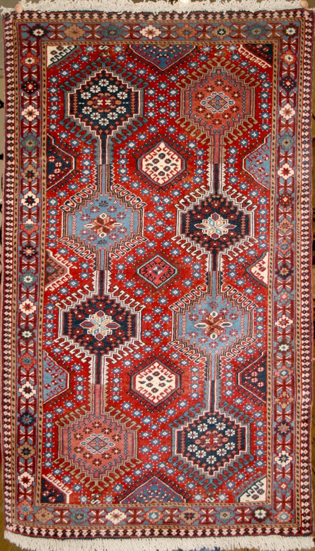 Hand-knotted in the tribal villages of Yalameh, this Persian rug reflects a rich weaving heritage rooted in bold geometry and symbolic design. Its repeat medallion layout—featuring hexagonal and octagonal forms—creates a rhythmic, mirrored structure, softened by floral accents and star-like motifs.