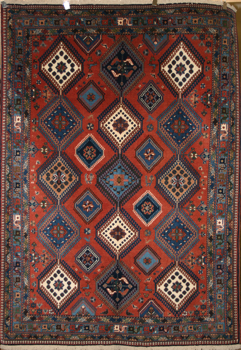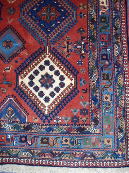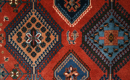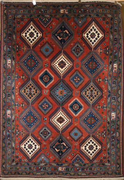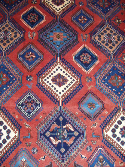 Hand-knotted in the tribal weaving villages of Yalameh, this Persian rug is a striking example of balance and rhythm in design. Its repeat medallion layout—bold diamond forms set in mirrored, staggered rows—creates a sense of movement and symmetry rooted in tribal tradition.