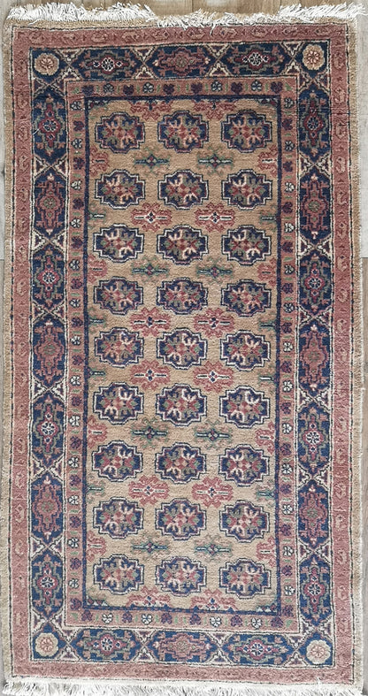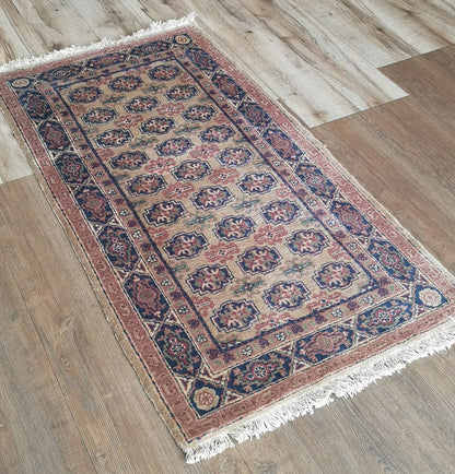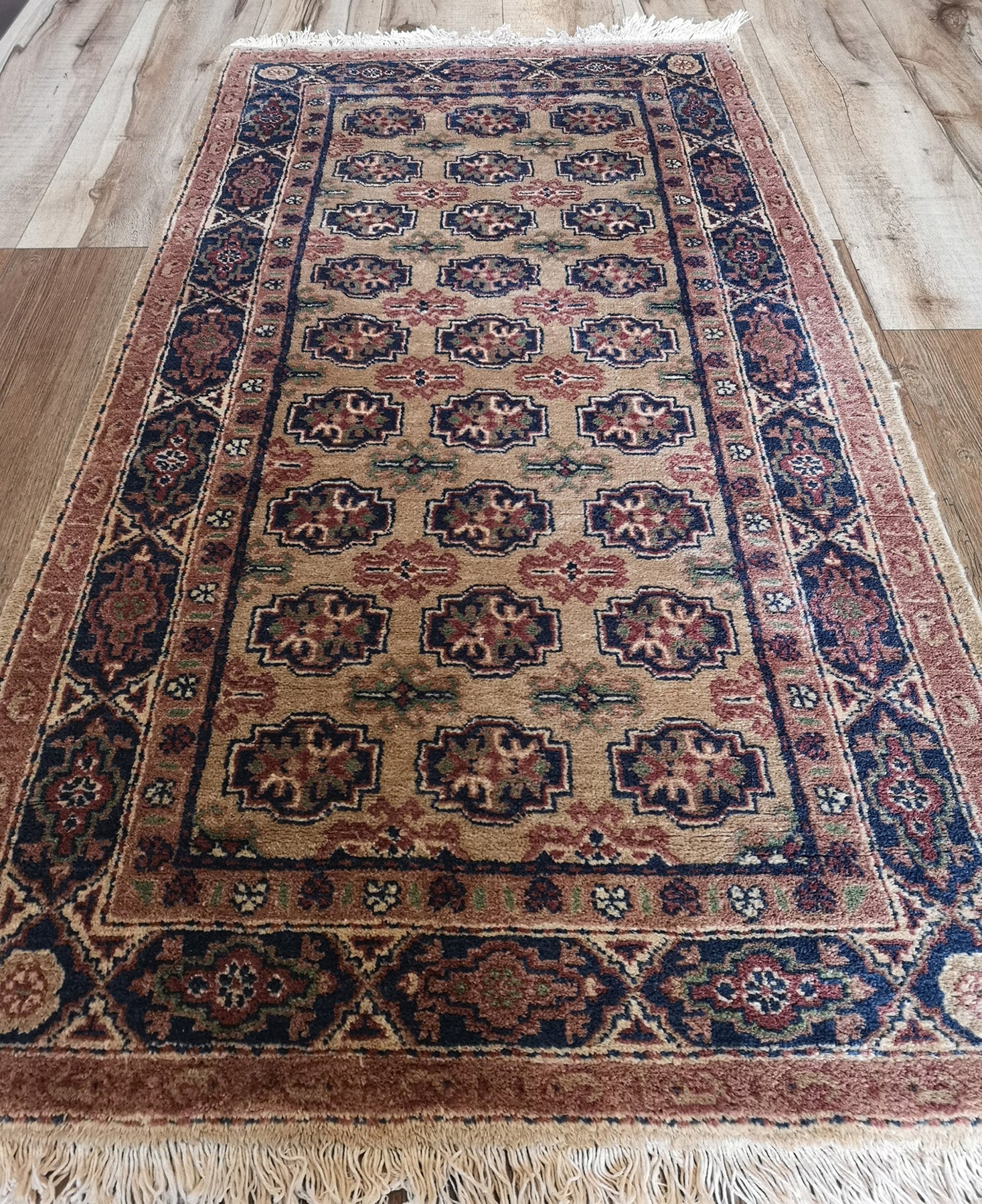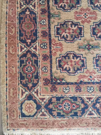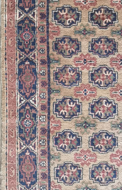 Hand-knotted by Baluch weavers in Afghanistan, this semi-antique rug captures the raw beauty and symbolism of tribal craftsmanship. Its repeat medallion layout features octagonal, rosette-filled motifs set against a soft beige field, framed by scrolling vines and floral elements that reflect centuries-old design traditions.