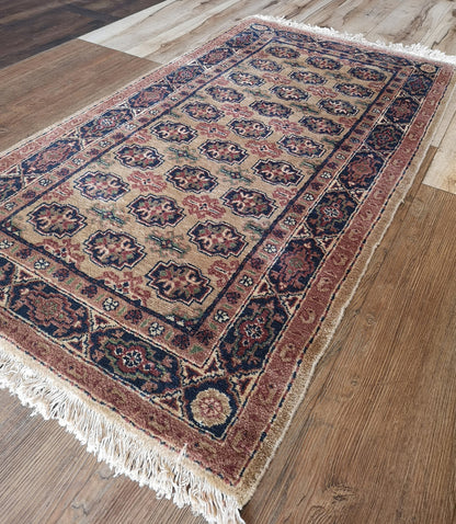 The earthy palette of beige, navy, rust, and olive is subtly accented with cream and soft red, creating a balanced, understated contrast. The navy border, adorned with rosettes and vines, is flanked by rust-toned guard bands that add structure and refinement.