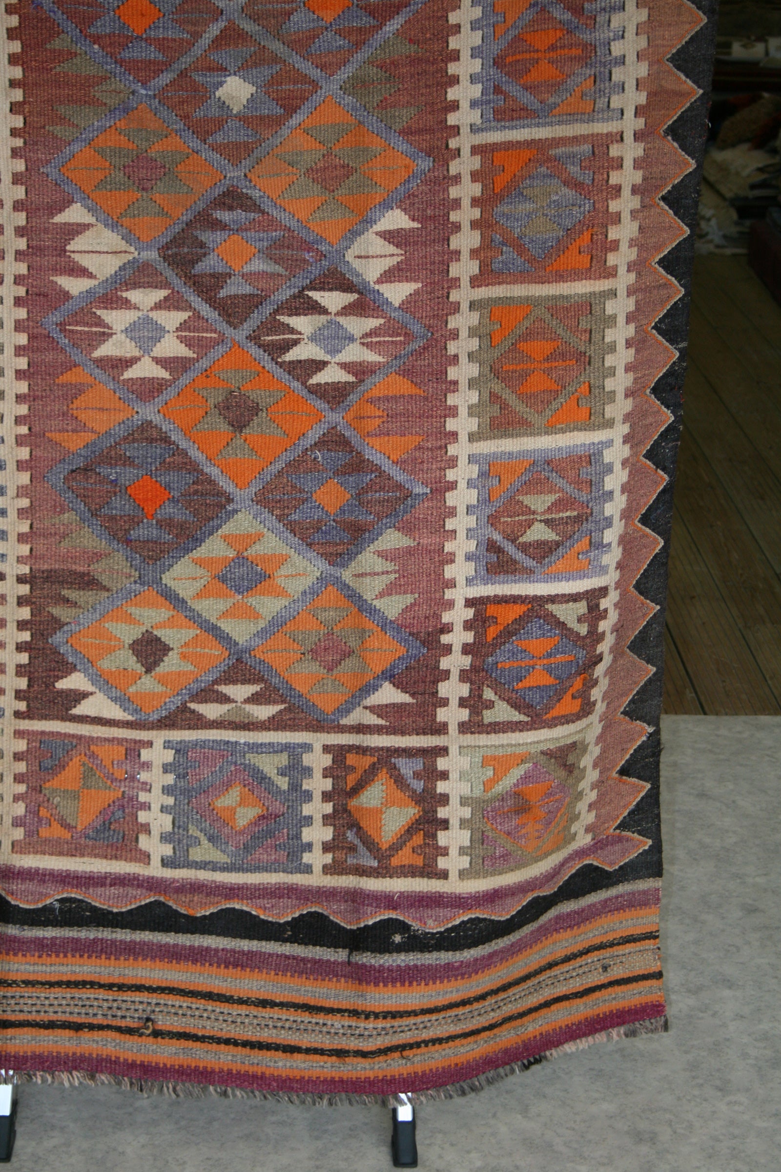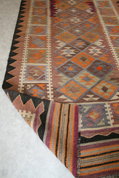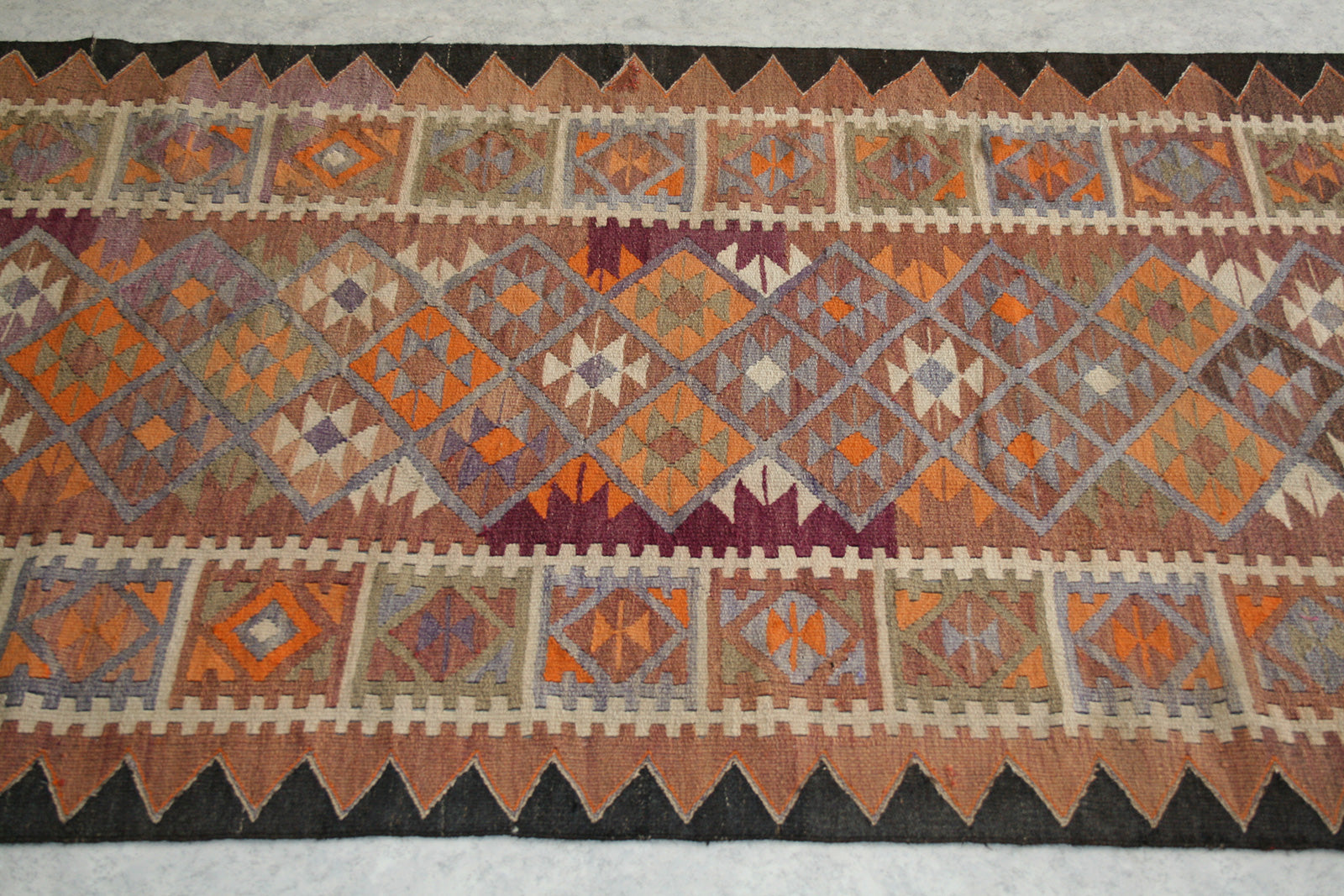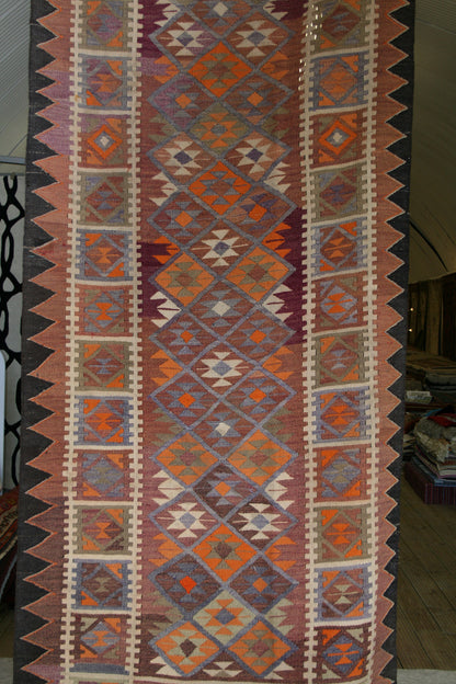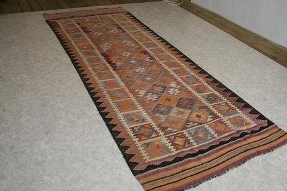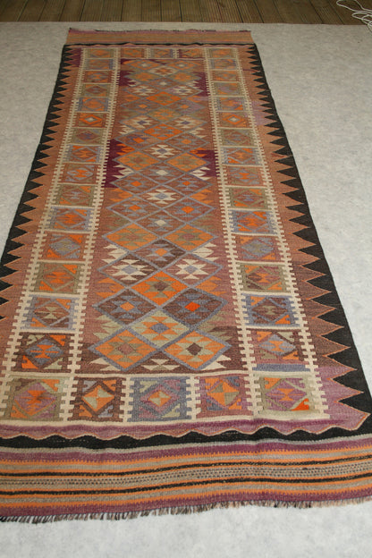 This semi-antique Afghan Kilim runner captures the spirit of tribal weaving with its bold, geometric rhythm and earthy palette. A series of interlocking diamond medallions anchors the central field, flanked by a distinctive border of rectangular compartments that echo the interior motifs. The soft contrast between burnt orange, slate grey, mauve, and sage green creates a grounded yet dynamic aesthetic, enriched by accents of ivory and muted purple.
