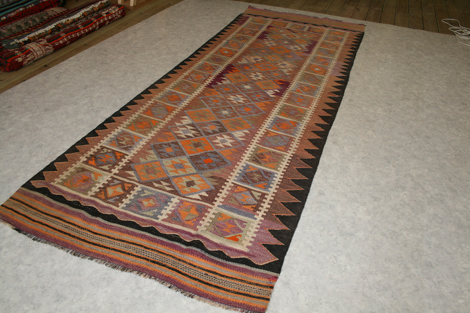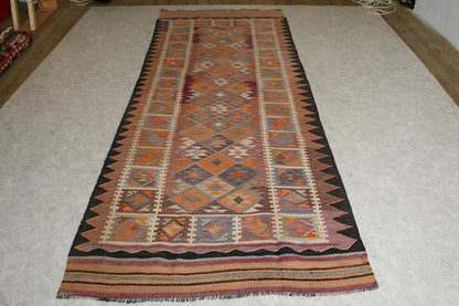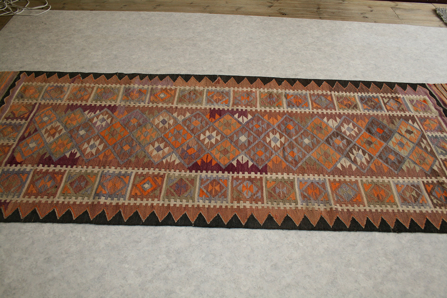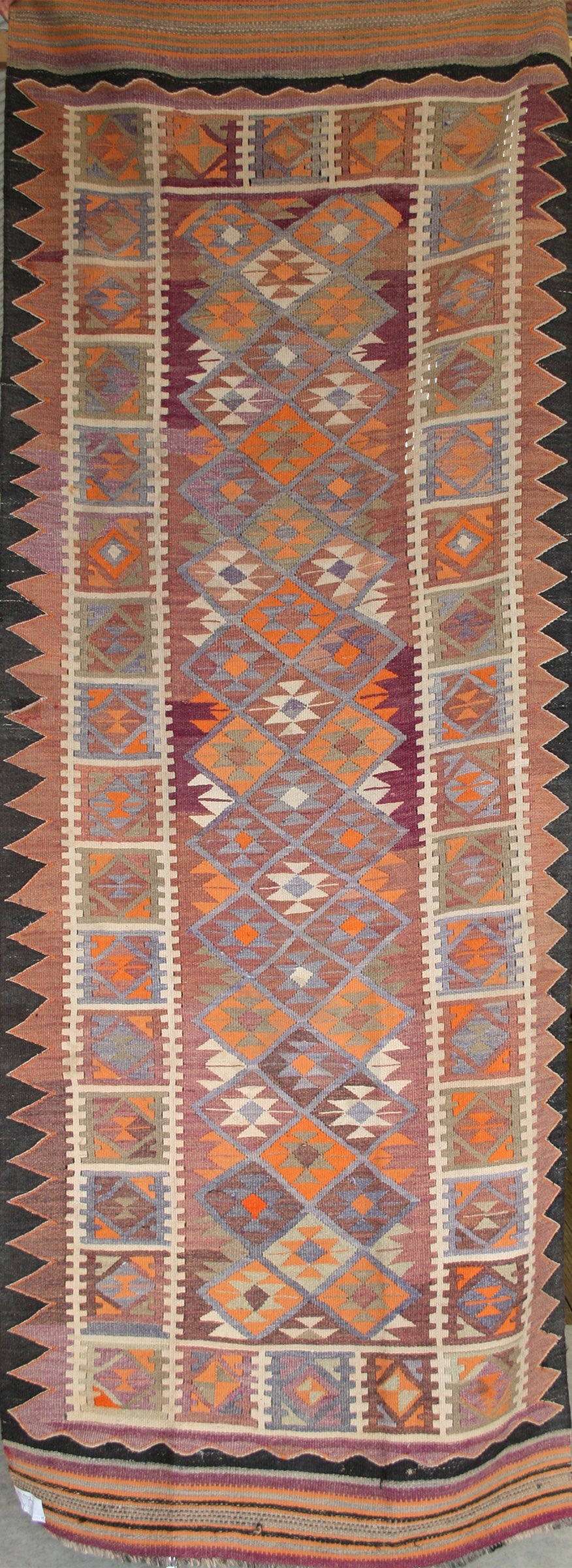 This semi-antique Afghan Kilim runner captures the spirit of tribal weaving with its bold, geometric rhythm and earthy palette. A series of interlocking diamond medallions anchors the central field, flanked by a distinctive border of rectangular compartments that echo the interior motifs. The soft contrast between burnt orange, slate grey, mauve, and sage green creates a grounded yet dynamic aesthetic, enriched by accents of ivory and muted purple.