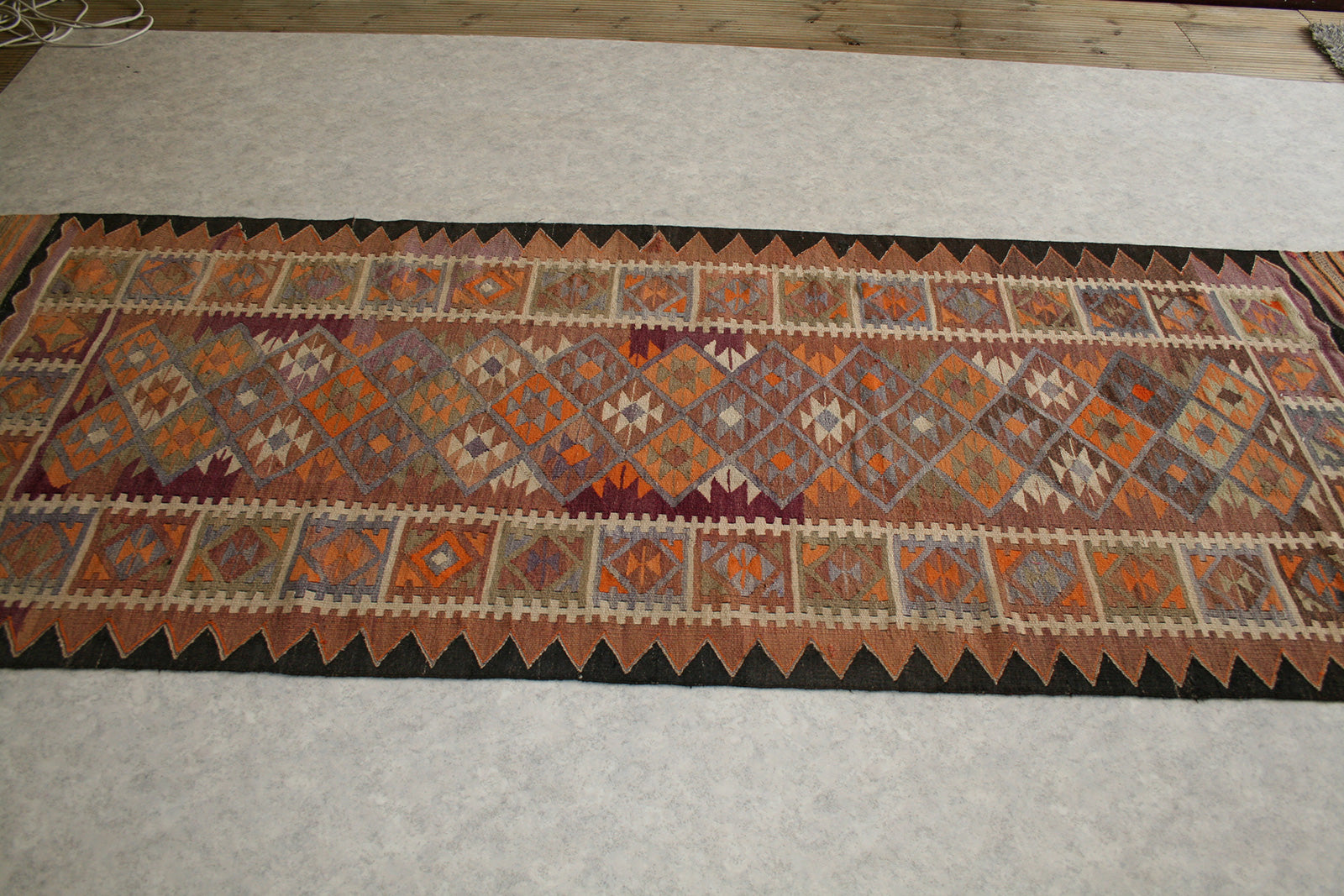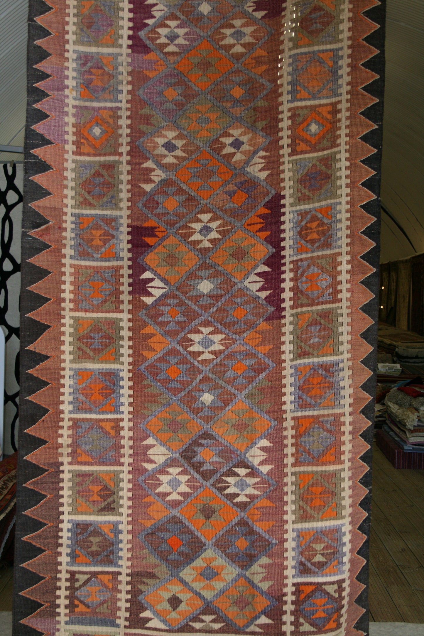 Handwoven from wool on a cotton foundation, this Kilim is both lightweight and durable, making it ideal for hallways, layered interiors, or transitional spaces that embrace character and heritage. Its proportions lend themselves perfectly to long corridors or open-plan layouts, where its tribal geometry can guide the eye and anchor the space.