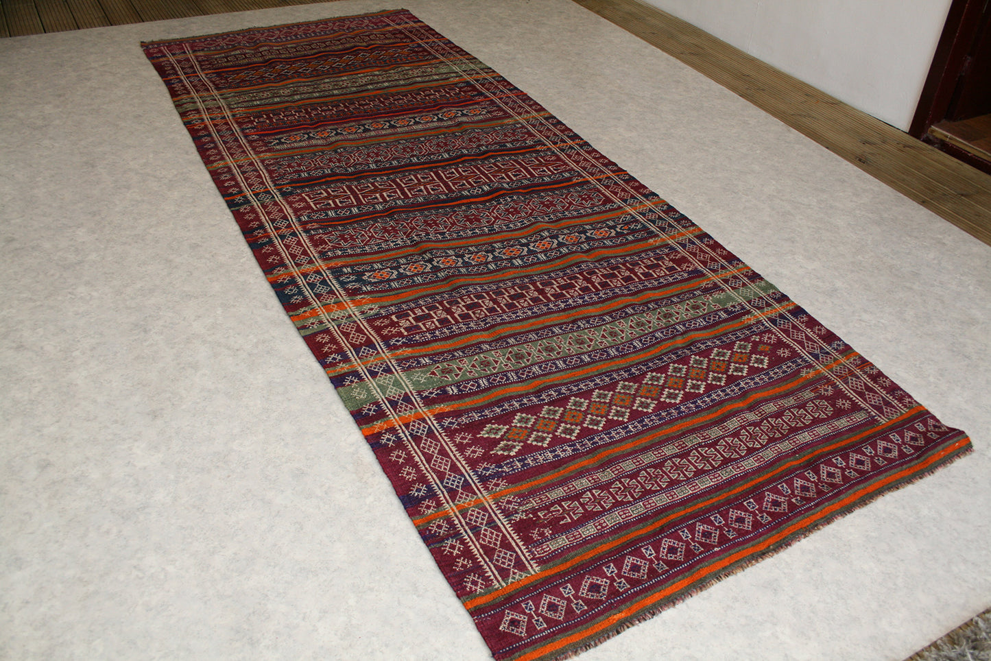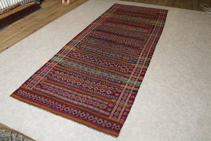 This semi-antique Afghan Kilim runner is a striking example of tribal weaving, rich in geometric motifs and earthy tones. Handwoven in Afghanistan, it reflects the enduring traditions of nomadic craftsmanship.