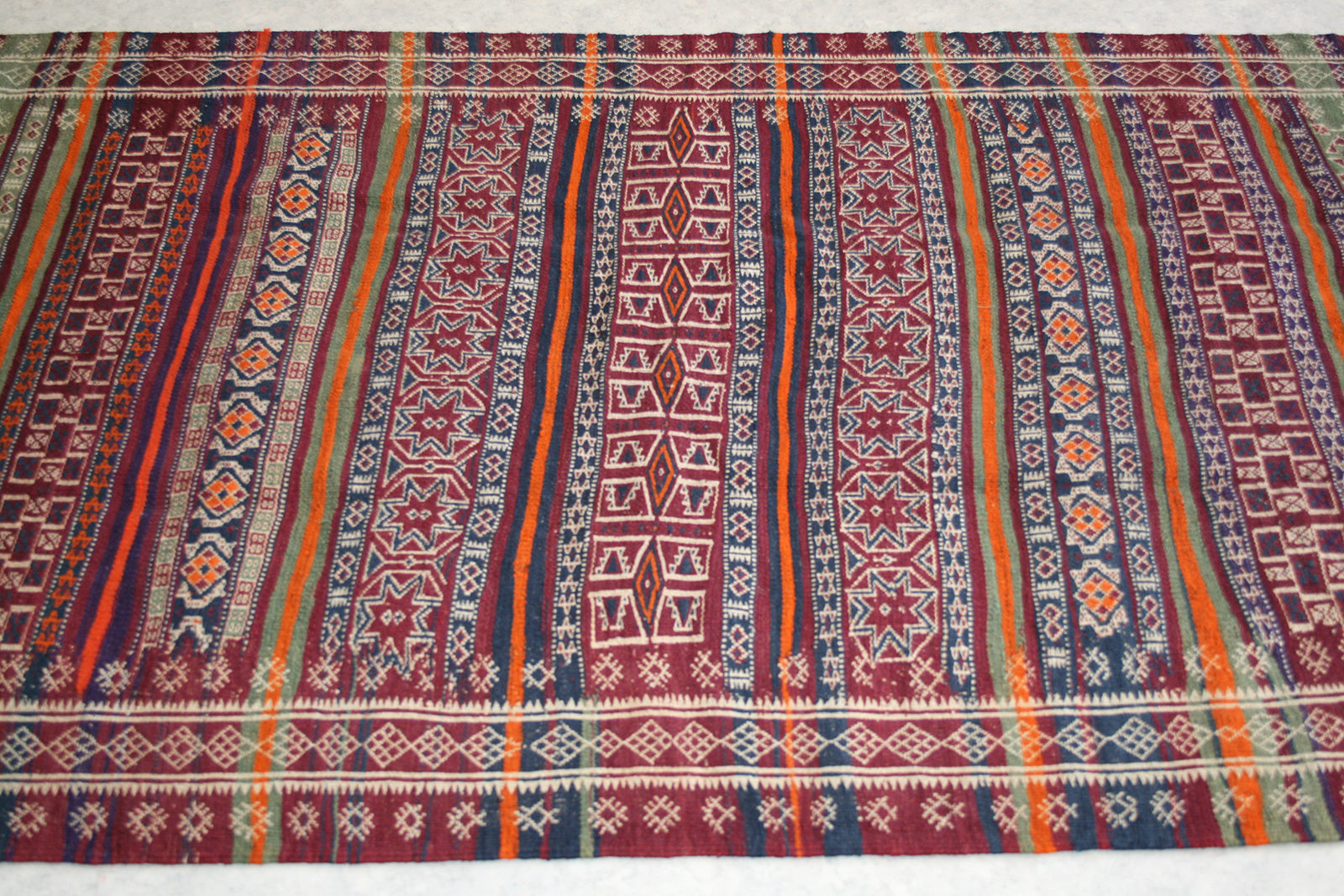 A repeating diamond border frames the piece, supported by guard bands that echo the field’s geometry. This structure gives the rug a strong sense of balance and continuity, typical of tribal Kilims.