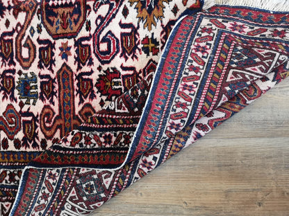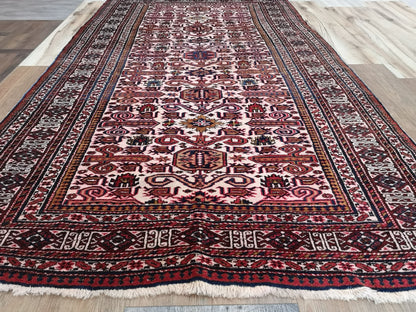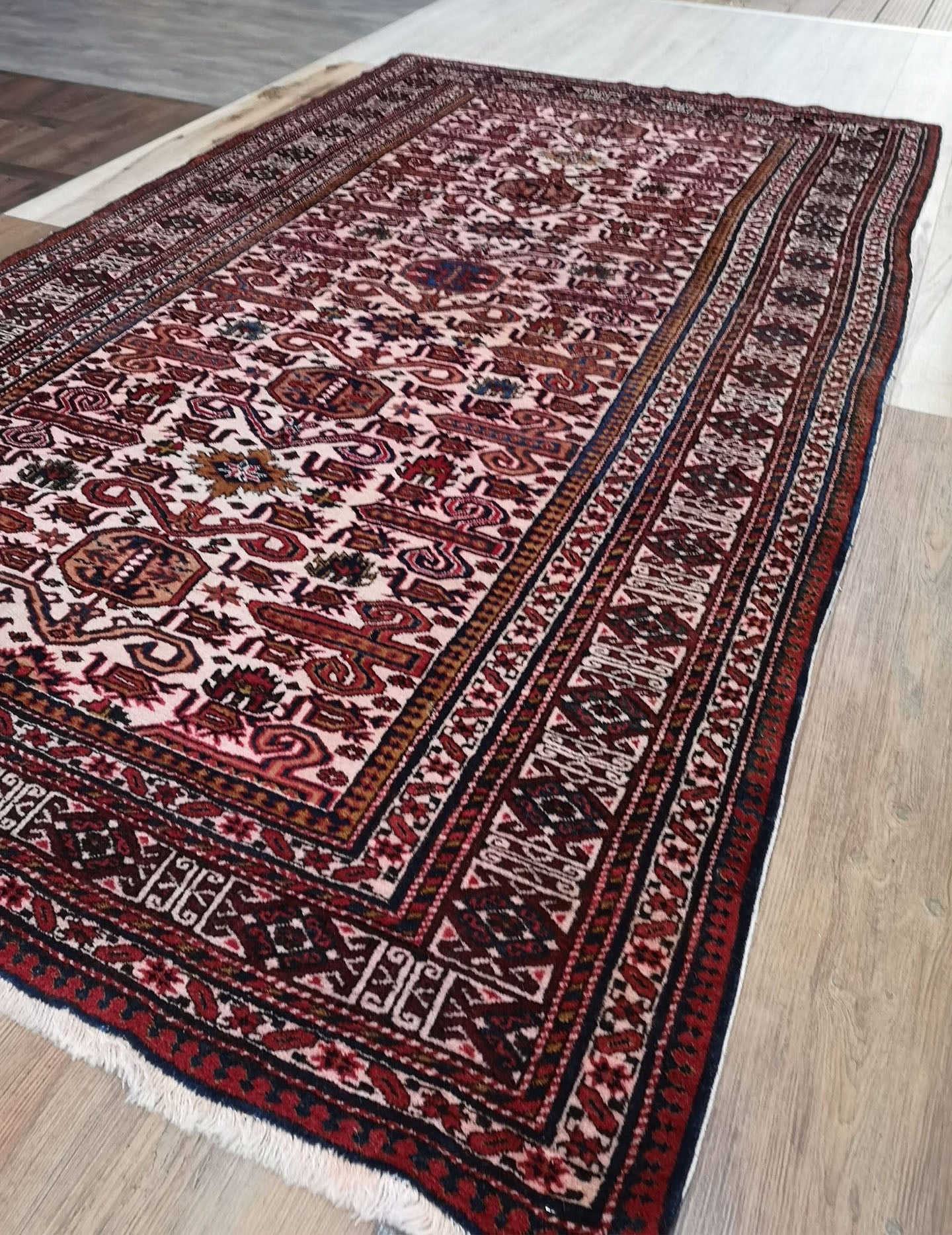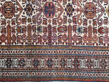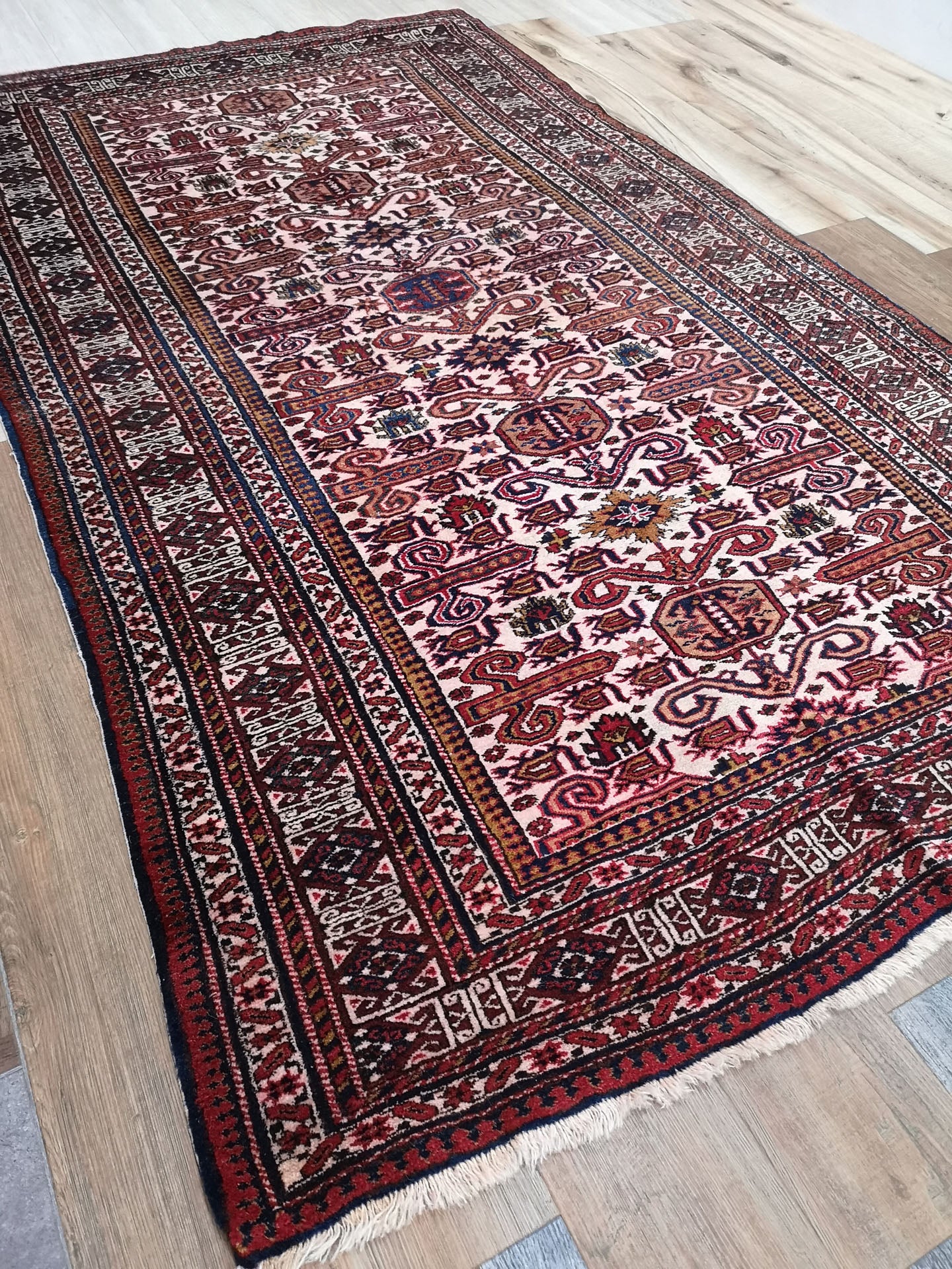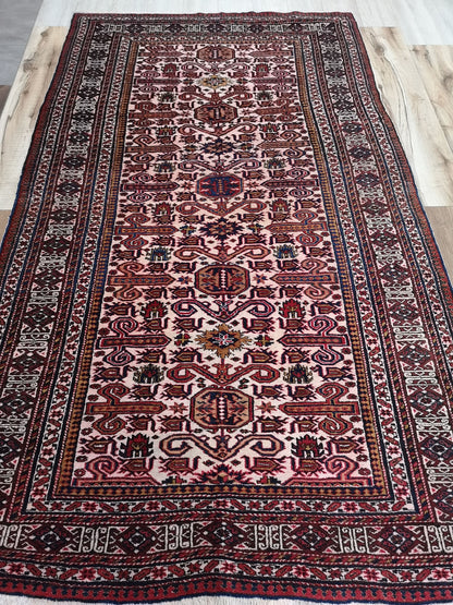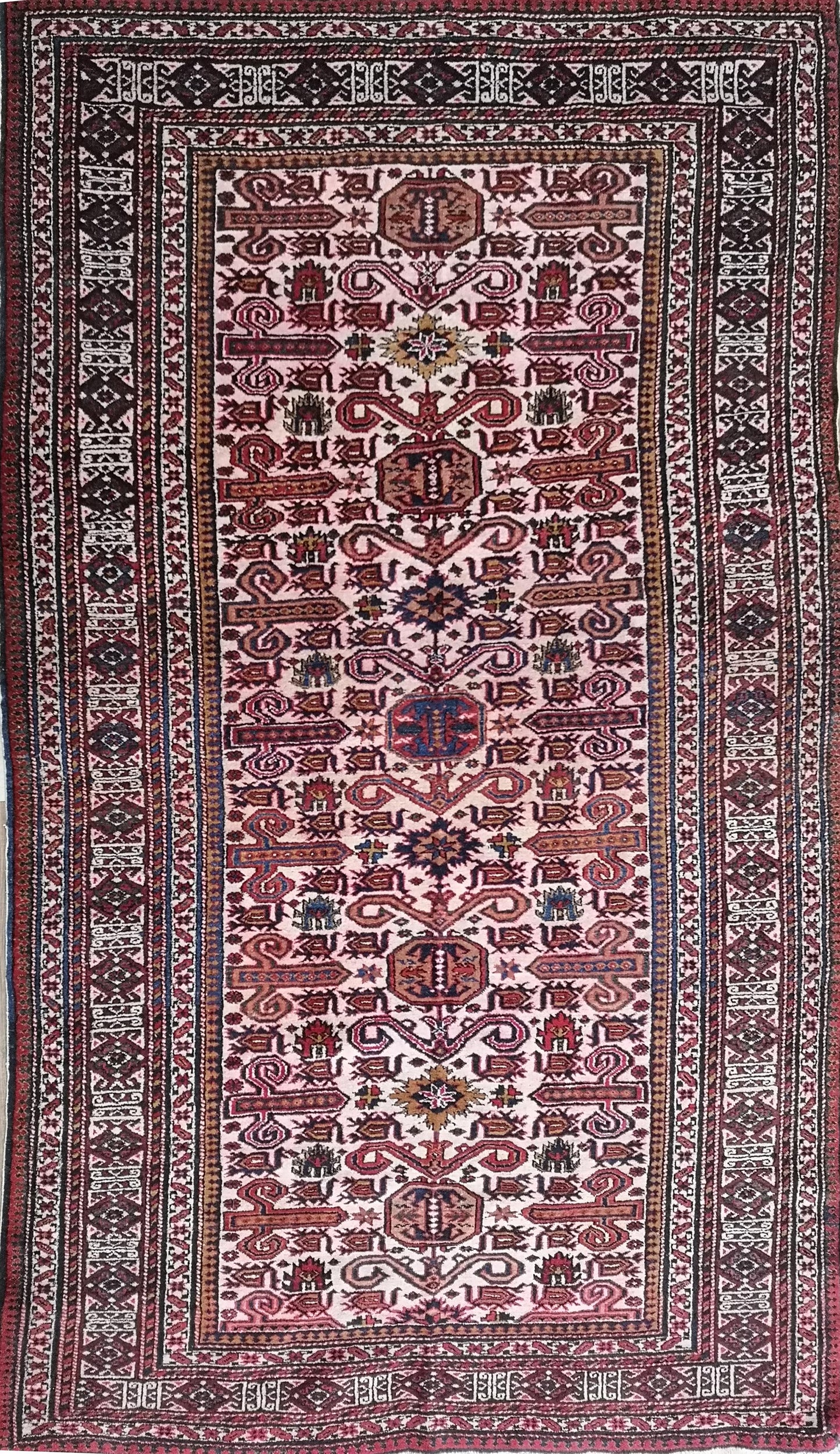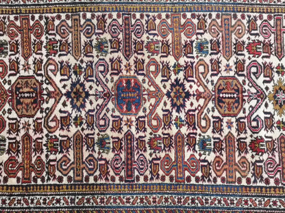 Hand-knotted in Azerbaijan, this semi-antique Caucasian rug embodies the bold geometry and symbolic richness of tribal weaving traditions. Its field is anchored by octagonal medallions and hooked motifs reminiscent of ram’s horns (Koçboynuzu), interspersed with cross-like elements and serrated leaf forms, all arranged in a vertically symmetrical, rhythmically rigid layout.