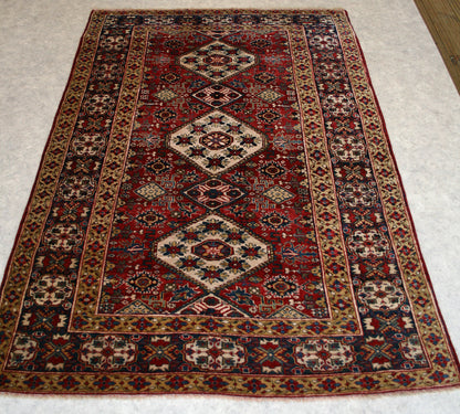 This semi-antique Caucasian rug embodies the bold geometry and symbolic richness of tribal weaving traditions. Its repeat medallion layout, featuring diamond-shaped medallions adorned with stylised floral motifs and rosettes, creates a striking sense of rhythm and symmetry.