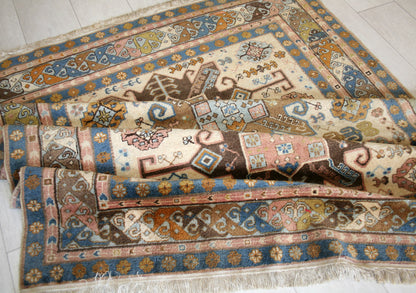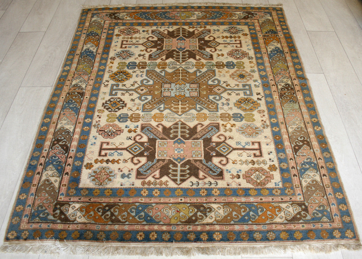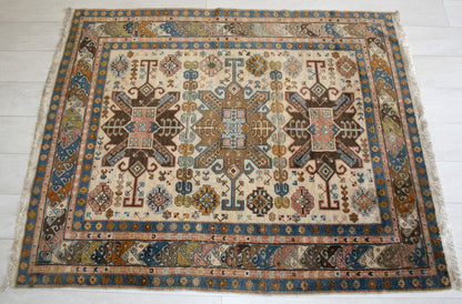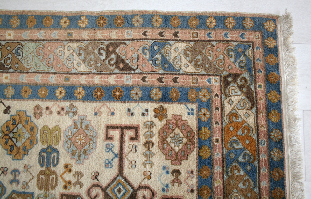 This semi-antique Caucasian rug captures the bold geometry and symbolic richness of tribal weaving. Two large, angular medallions anchor the ivory field, flanked by octagrams, diamond shapes, and stylised floral forms that echo the region’s storytelling traditions. Serrated leaves and branching motifs add movement and symmetry, creating a design that feels both rooted and dynamic.