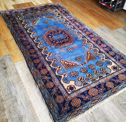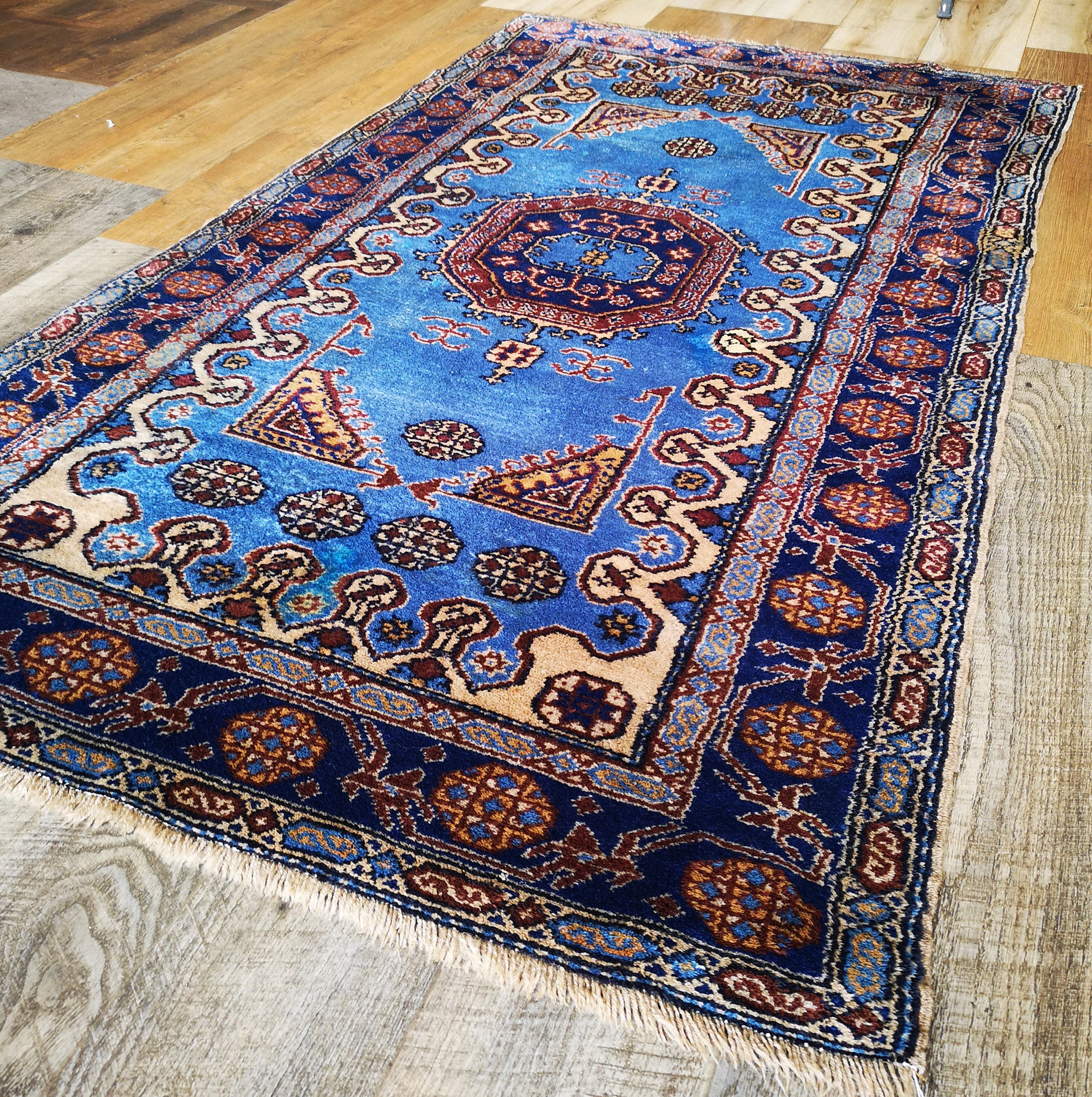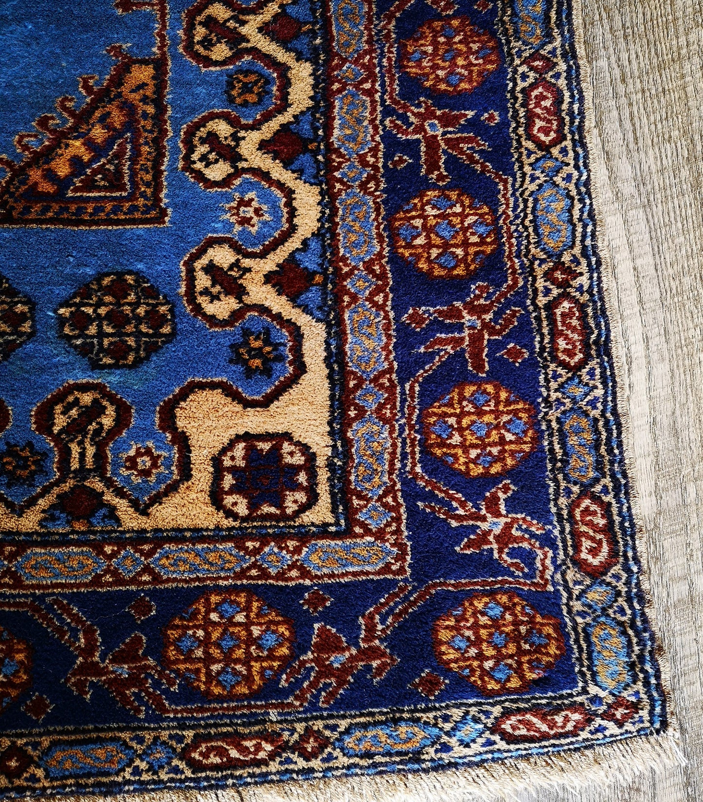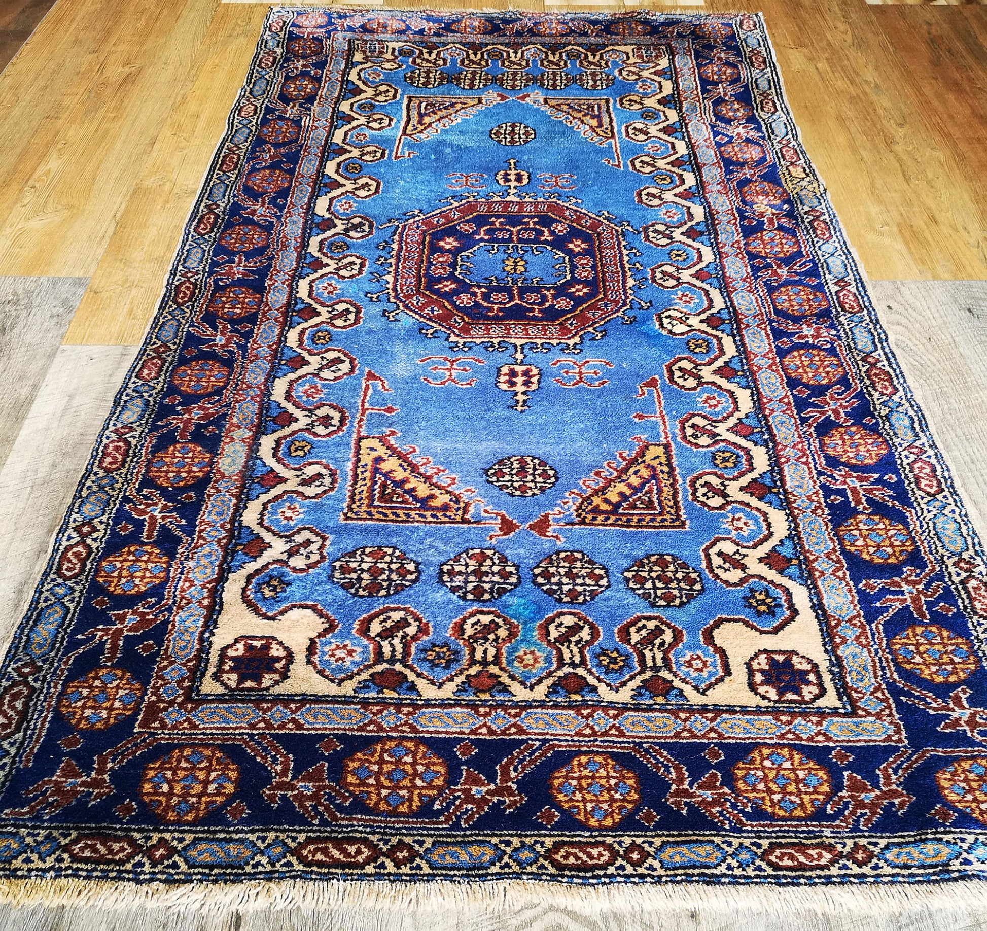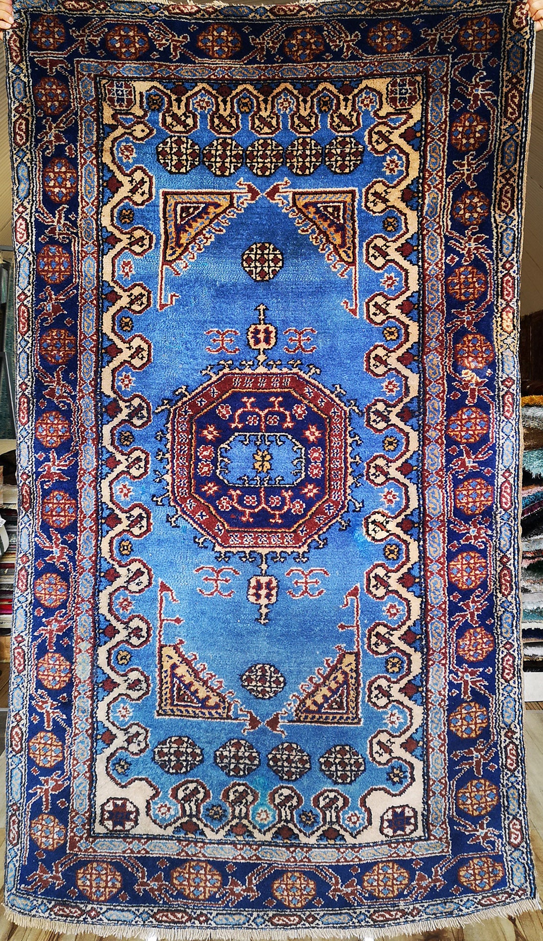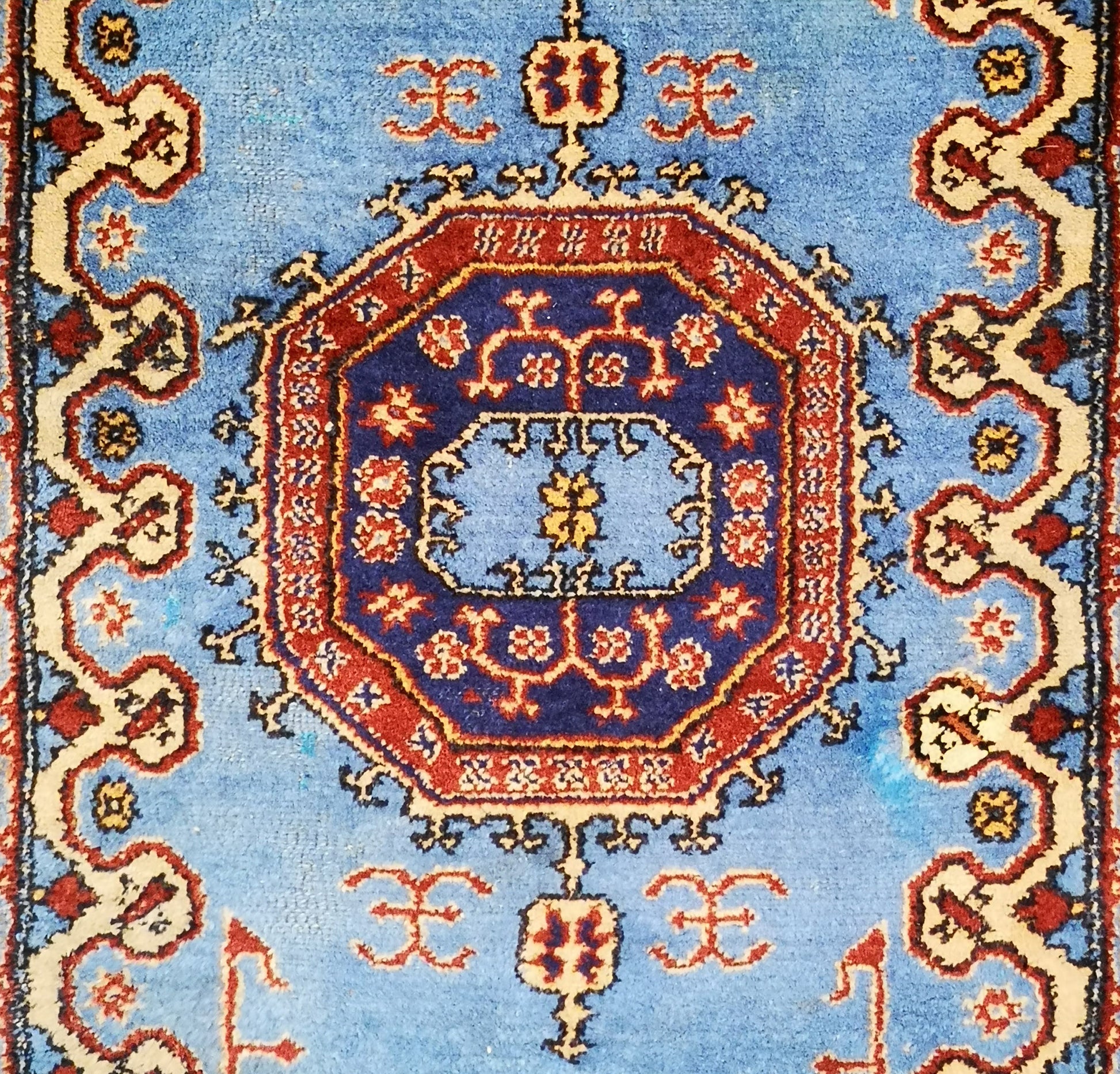 This semi-antique Caucasian prayer rug (mihrab) reflects the spiritual and artistic traditions of the Caucasus, blending geometry with floral ornamentation in a strikingly symmetrical layout. Its sky blue field, anchored by a central octagonal medallion, is framed by serrated triangular forms, rosette-like roundels, and a bold arch that defines its devotional character.