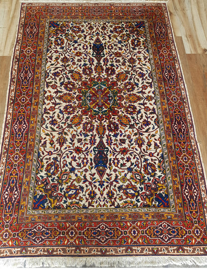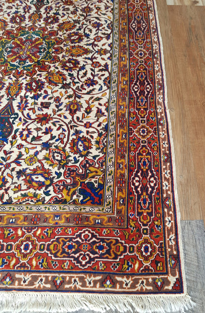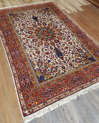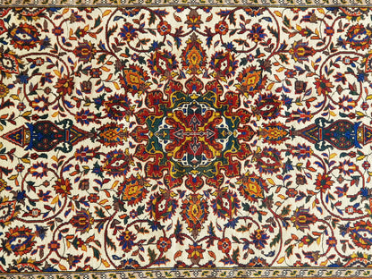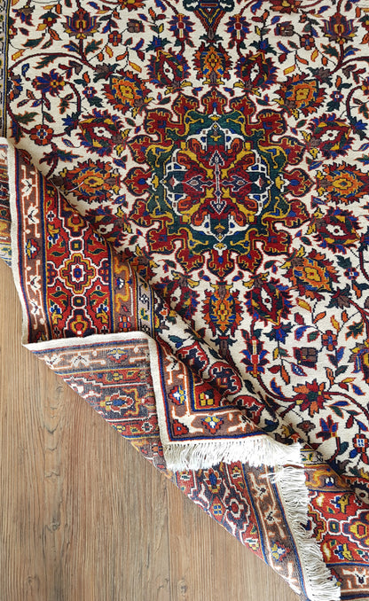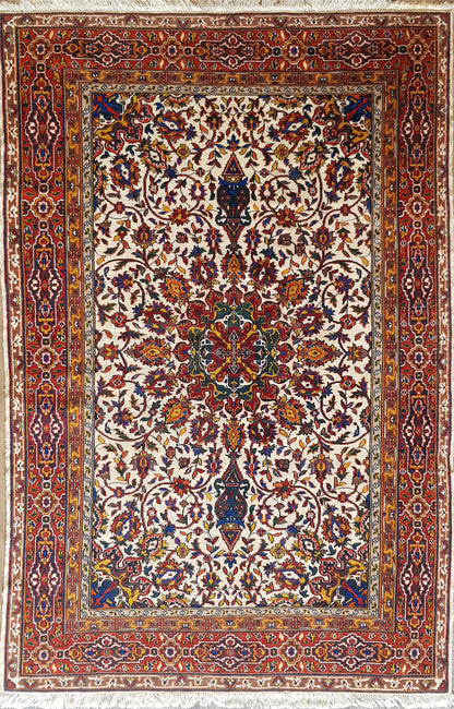 Hand-knotted in Kashmir, this semi-antique rug embodies the region’s renowned finesse in weaving, blending Persian-inspired elegance with Indian artistry. At its heart lies a geometric floral medallion, framed by palmettes, rosettes, and flowing vine motifs, all arranged in a perfectly mirrored composition.