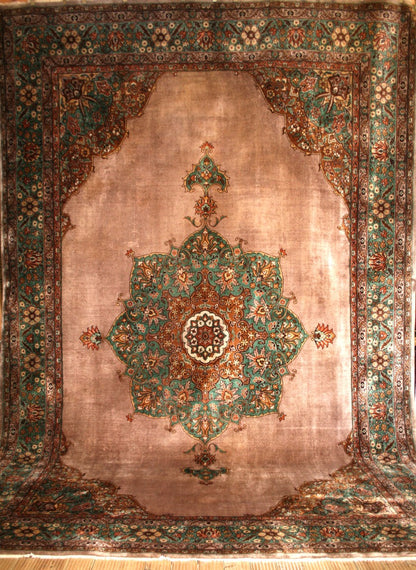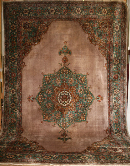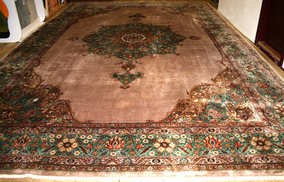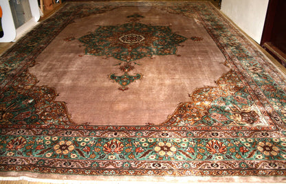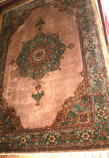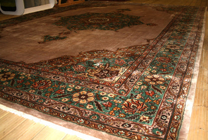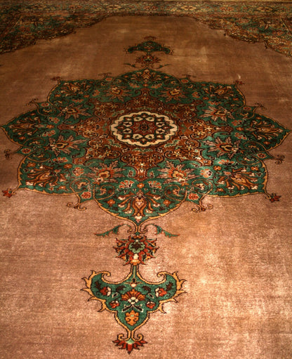 Hand-knotted in India, this semi-antique rug draws inspiration from the grand weaving traditions of Tabriz, reinterpreting its Persian roots with an Indian lens. At its heart lies a bold, lobed medallion set against a taupe field, framed by floral spandrels and stylised palmettes that echo classical Persian motifs.