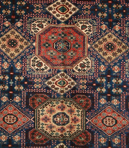Hand-knotted in Ardabil, Iran, this semi-antique Persian rug reflects the region’s enduring weaving traditions and its legacy of bold, architectural design. Its repeat medallion layout features a series of hexagonal and octagonal forms, enriched with floral and geometric motifs, arranged in a mirrored, vertical sequence that speaks to Ardabil’s affinity for symmetry and structure.