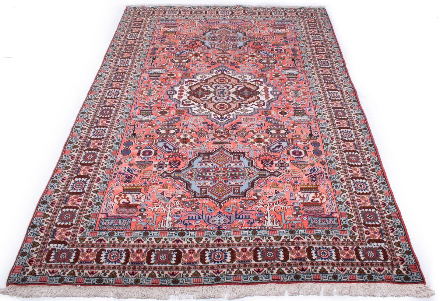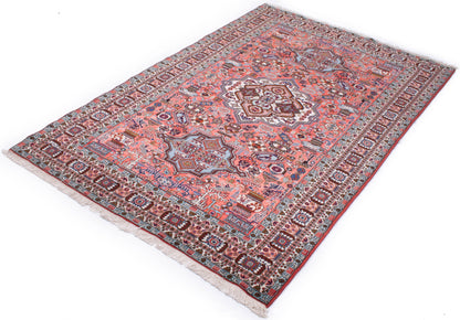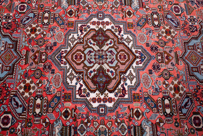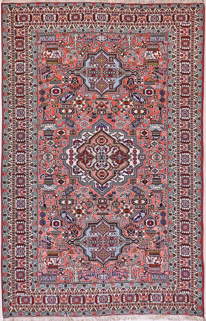 Hand-knotted in Ardabil, Iran, this semi-antique Persian rug is a striking blend of geometry and floral refinement, woven from wool and silk on a cotton foundation. Its angular medallion sits boldly within a coral field, surrounded by stylised rosettes, palmettes, and octagonal forms that create a sense of symmetry and structure.