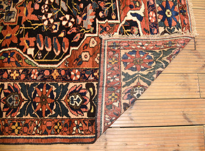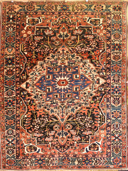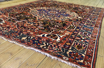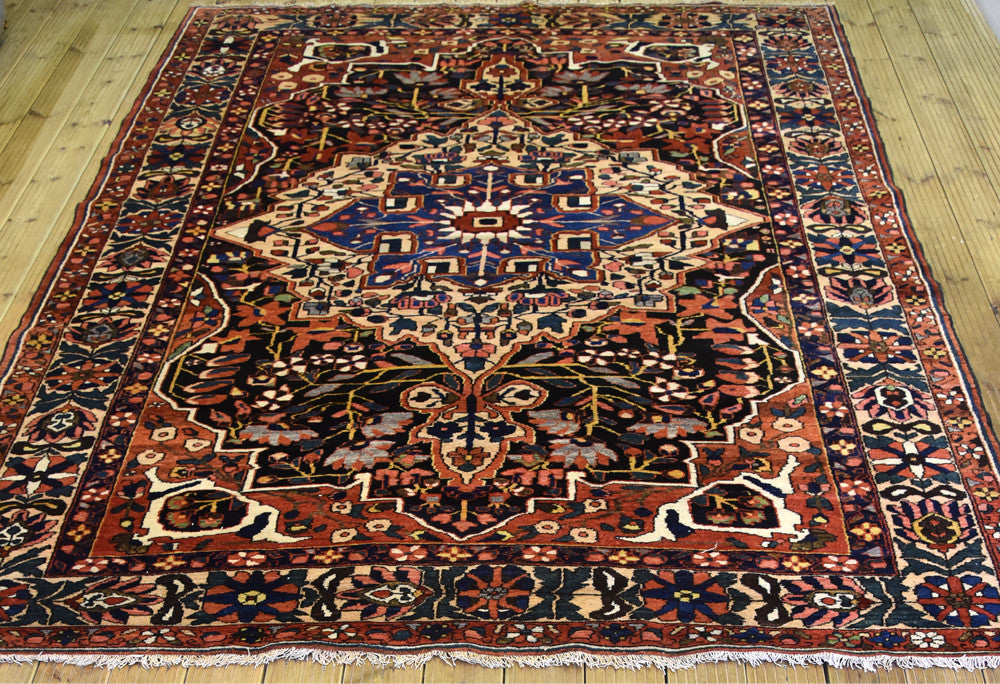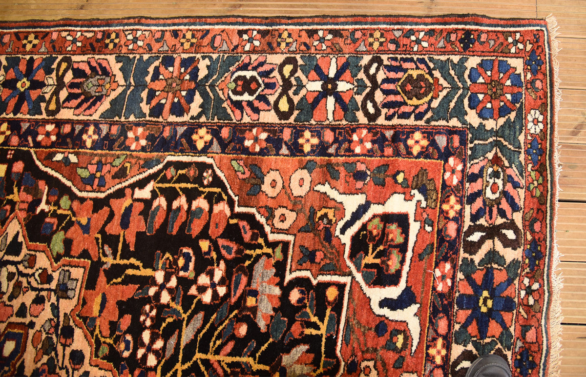 Hand-knotted in the tribal heartlands of Bakhtiari, this semi-antique Persian rug reflects a legacy of resilience and artistry. Its bold central medallion (toranj) anchors a field brimming with stylised floral forms, framed by spandrels that mirror its symmetry and enhance its sense of structure.