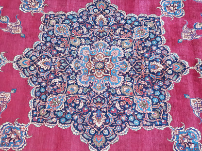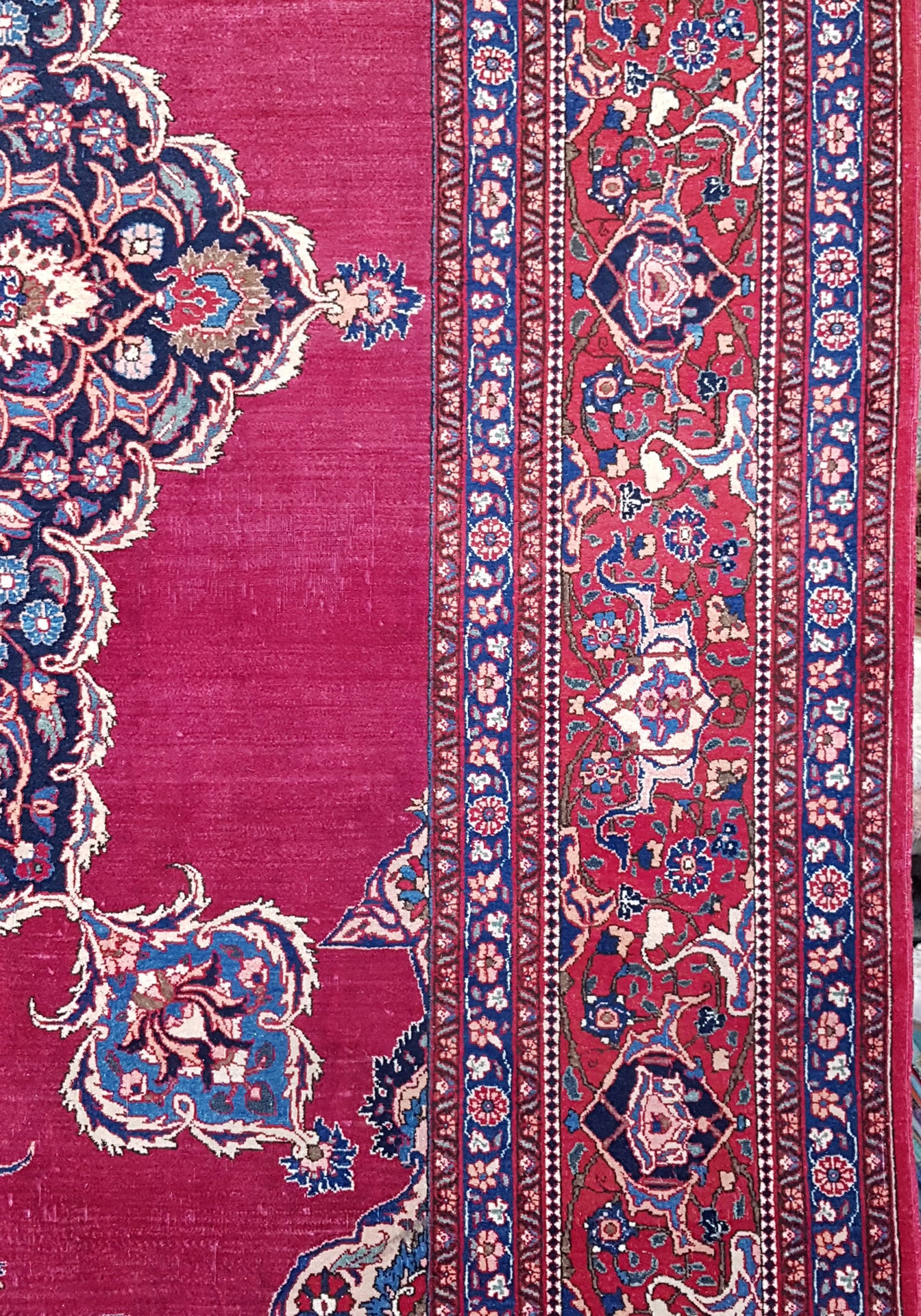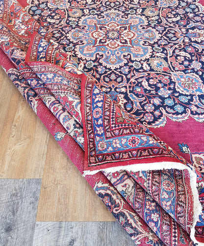 The rug’s warm palette of burgundy, navy, and ivory is enriched with touches of salmon-pink and teal, creating a strong yet harmonious contrast. Stylised floral elements and cloudbands add layers of intricacy, arranged in a mirrored, symmetrical layout that enhances the rug’s sense of balance and structure.